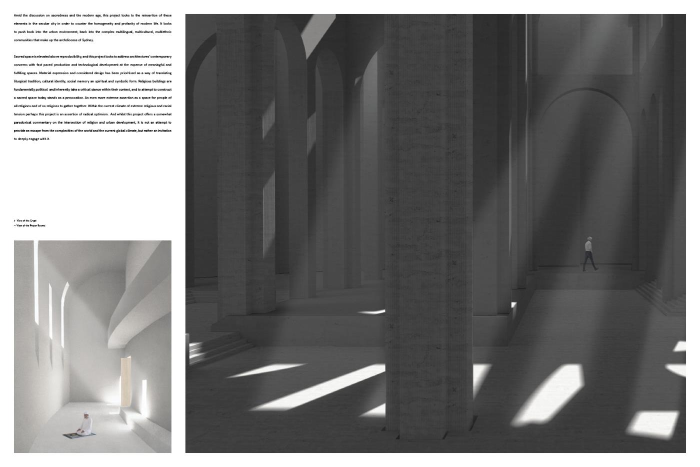 Modern architecture, like the modern world, has distanced itself from the sacred. Productivity and technological developments, amplified by the turbo charged economy, has become the dominant spirit of the age. The sacred has been relegated to the periphery of our lives, reflected in the junk space of our cities. To experience something as sacred is to experience a moment of transcendence, a suspension of the everyday. Yet within the profanity of our urban environments, what sense can someone make of such an experience?