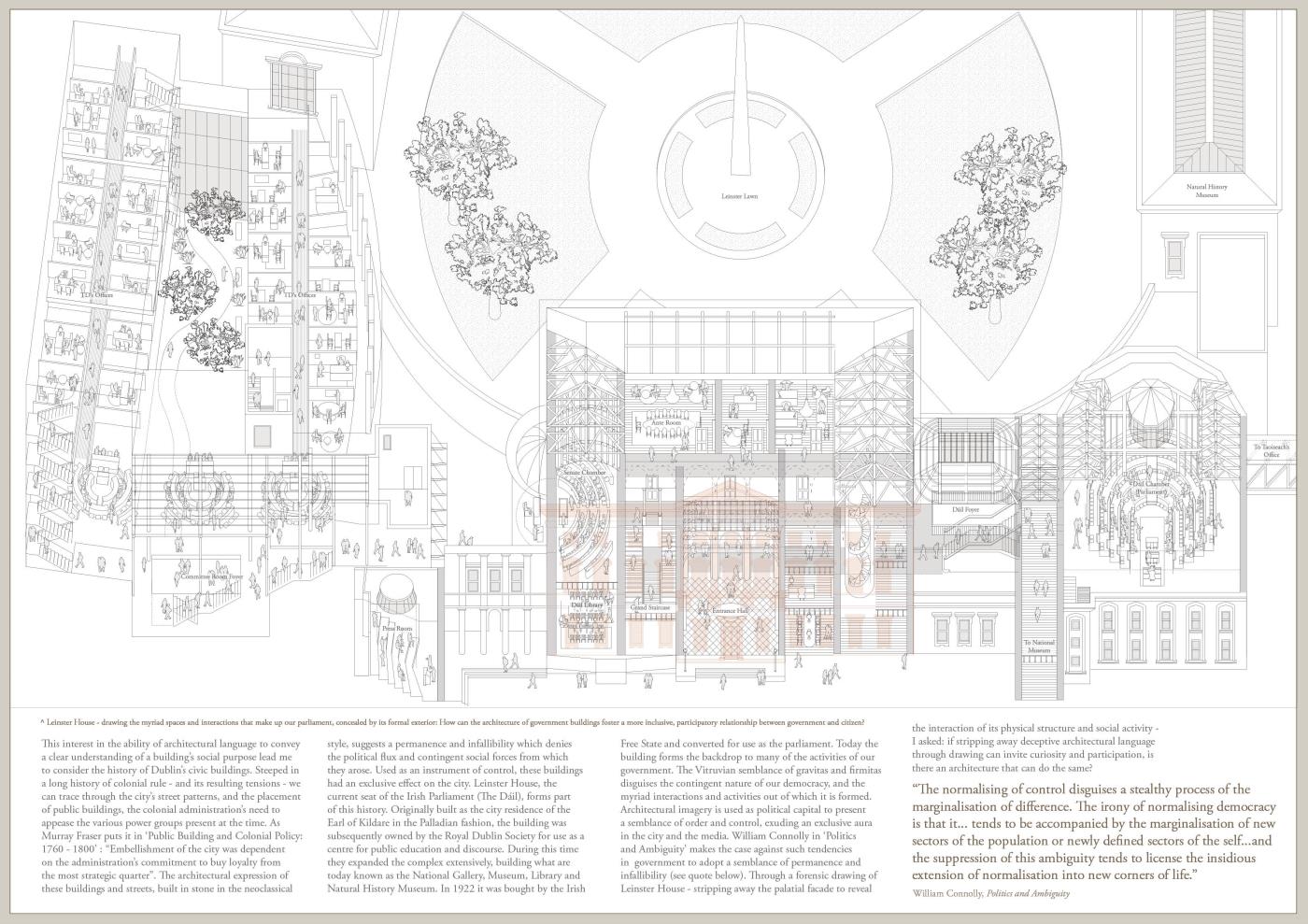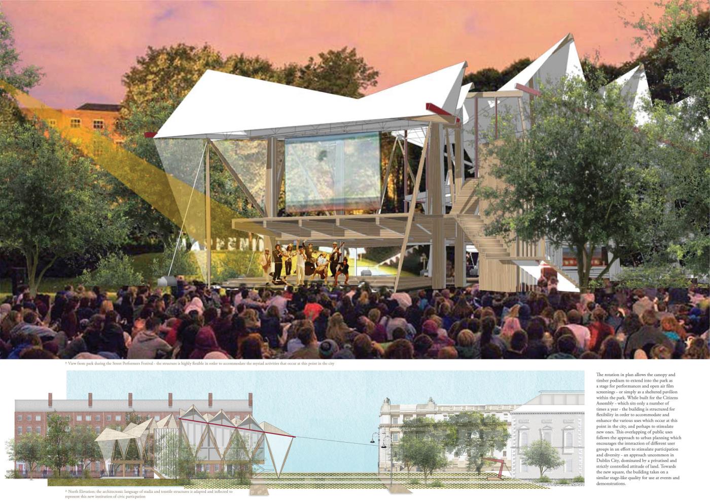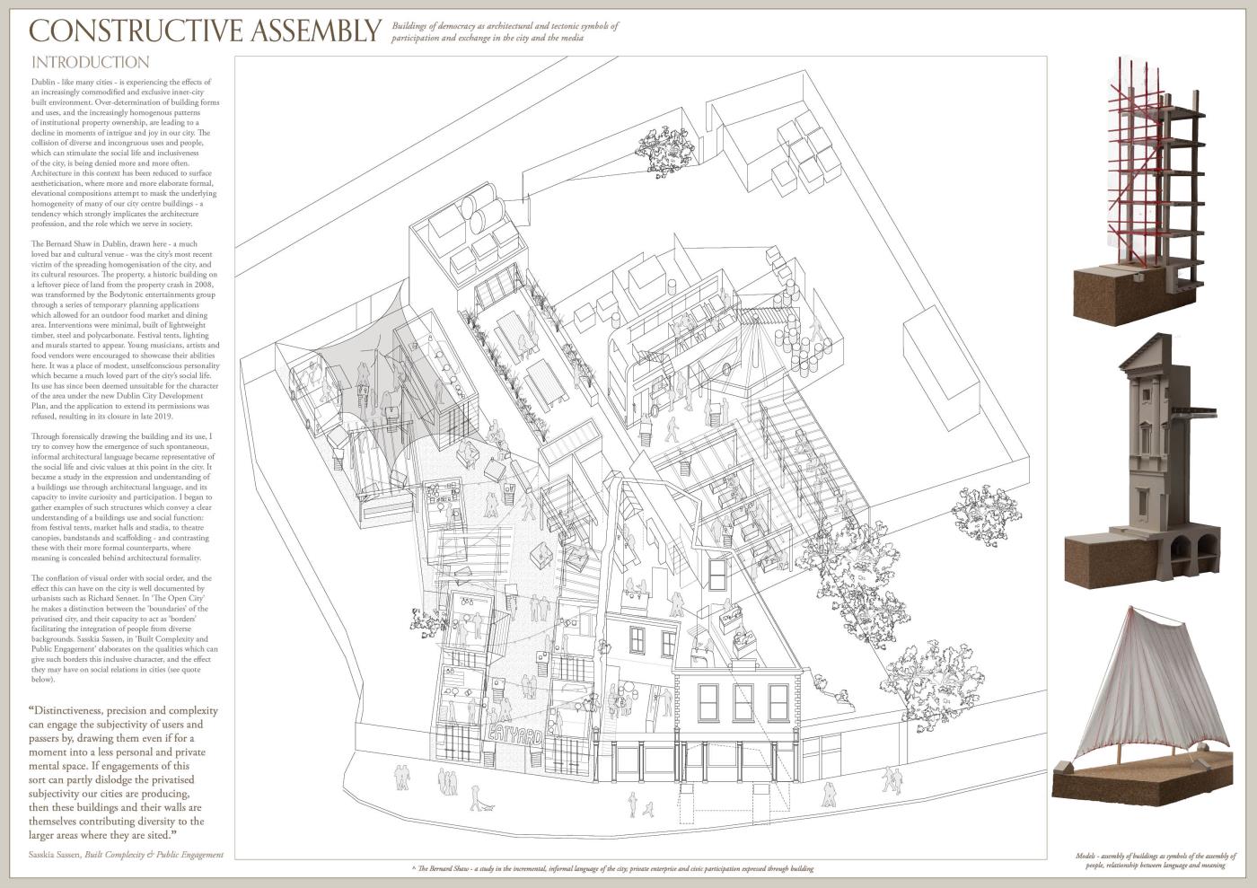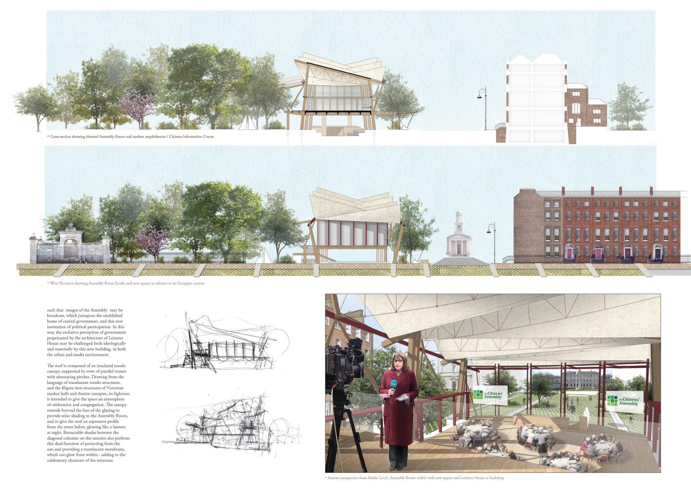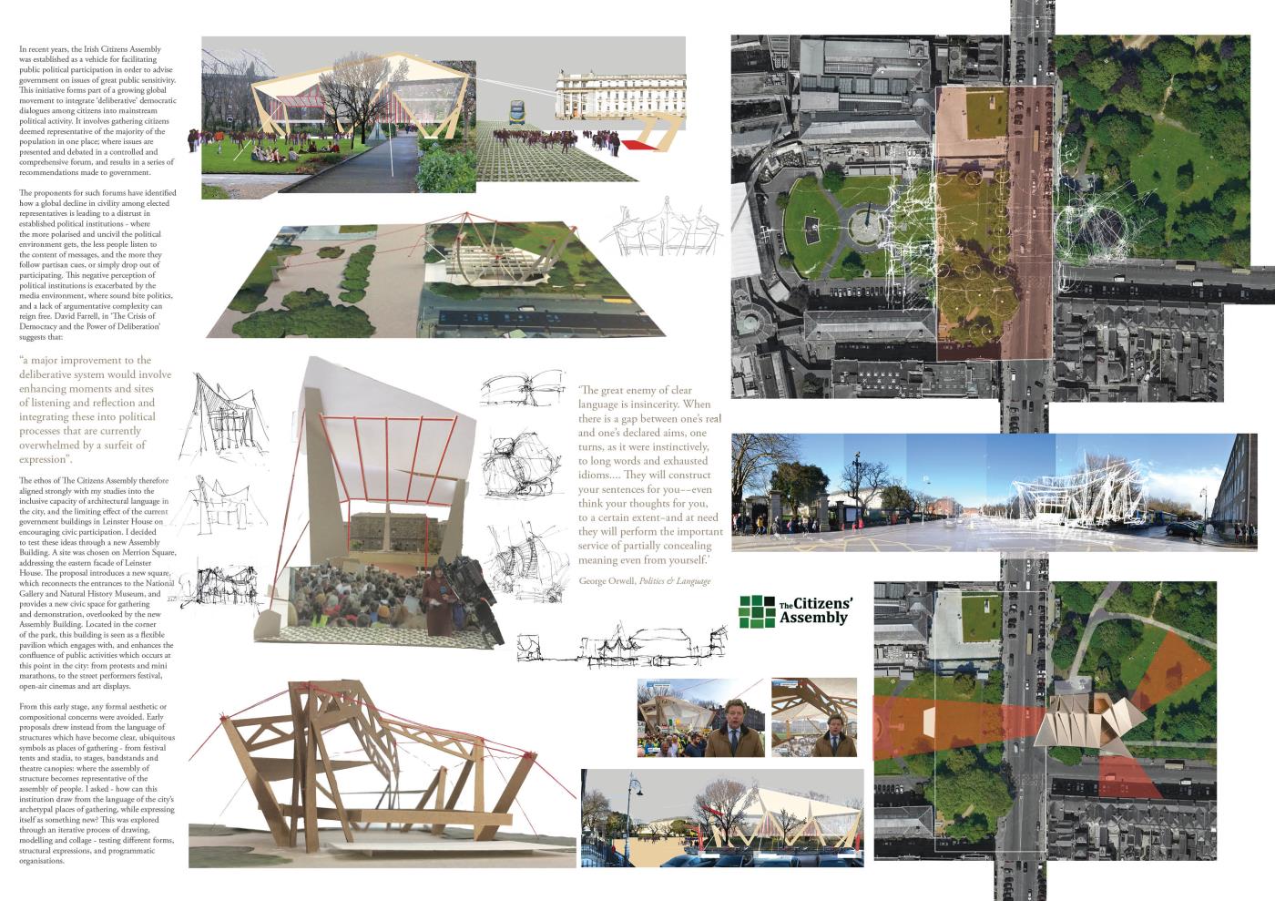 Critical of the homogenising and exclusive trends in the production of space in Dublin city, this thesis proposes an architecture for the Irish Citizens Assembly - one of the country’s most important institutions for political participation - in which inclusive, deliberative dialogues in the democratic process are facilitated, and celebrated through its architecture.