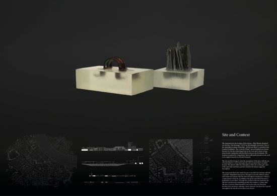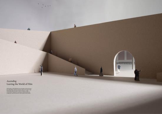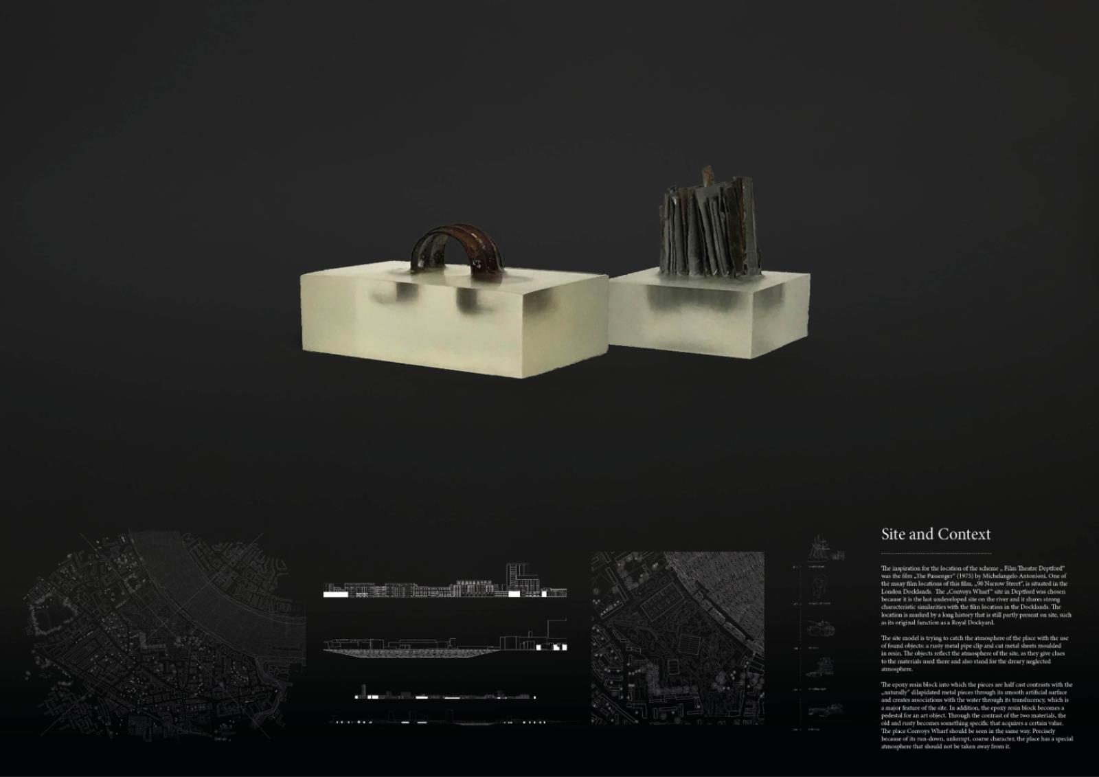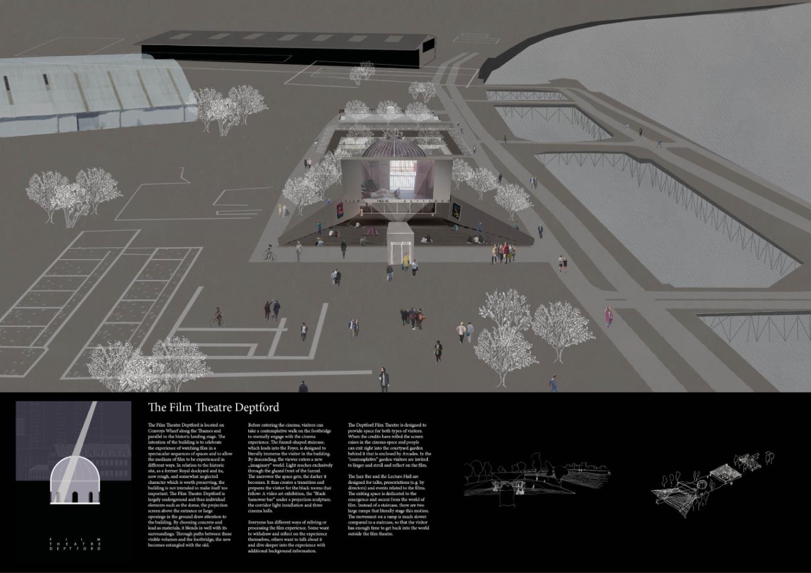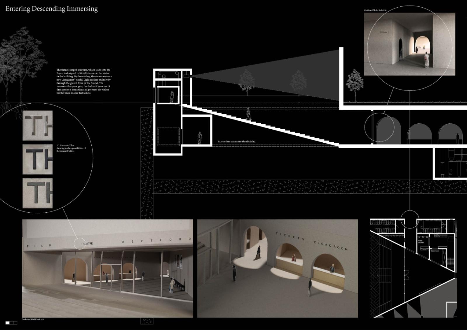Film Theatre Deptford Part 1 Project 2021 Katrin Schneyer Technical University of Munich | Germany The Film Theatre Deptford is located on Convoys Wharf along the Thames and parallel to the historic footbridge. The intention of the building is to celebrate the experience of watching film in a spectacular sequence of spaces and to allow the medium of film to be experienced in different ways. In relation to the historic site and its now rough, and somewhat neglected character, which is worth preserving, the building is not intended to make itself too important. The Film Theatre Deptford is largely underground and through paths between the visible volumes and the footbridge, the new becomes entangled with the old.Before entering the cinema, visitors can take a contemplative walk on the footbridge to mentally engage with the cinema experience. The funnel-shaped staircase, which leads into the Foyer, is designed to literally immerse the visitor in the building. Light reaches exclusively through the glazed front of the funnel. The narrower the space gets, the darker it becomes. It thus creates a transition and prepares the visitor for the black rooms that follow: A video art exhibition, the “Black Samovar bar” under a projection sculpture, the corridor light installation and three cinema halls.[This entry was produced by the author while studying at Kingston University during the academic year 2020/21 as a recipient of an Erasmus scholarship funded by the European Union.] Tutor(s) David Owen (Kingston University) Michael Badu (Kingston University)