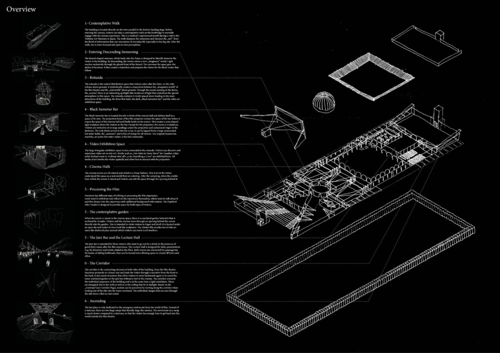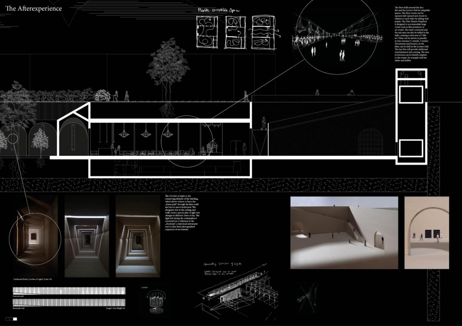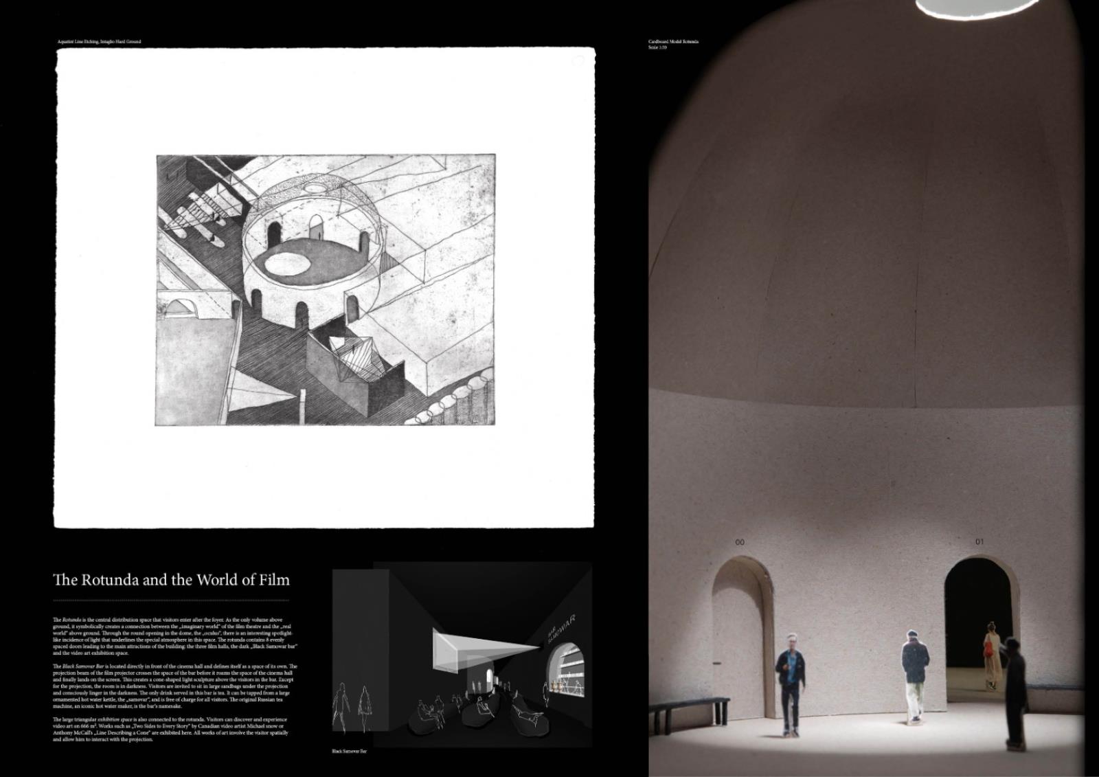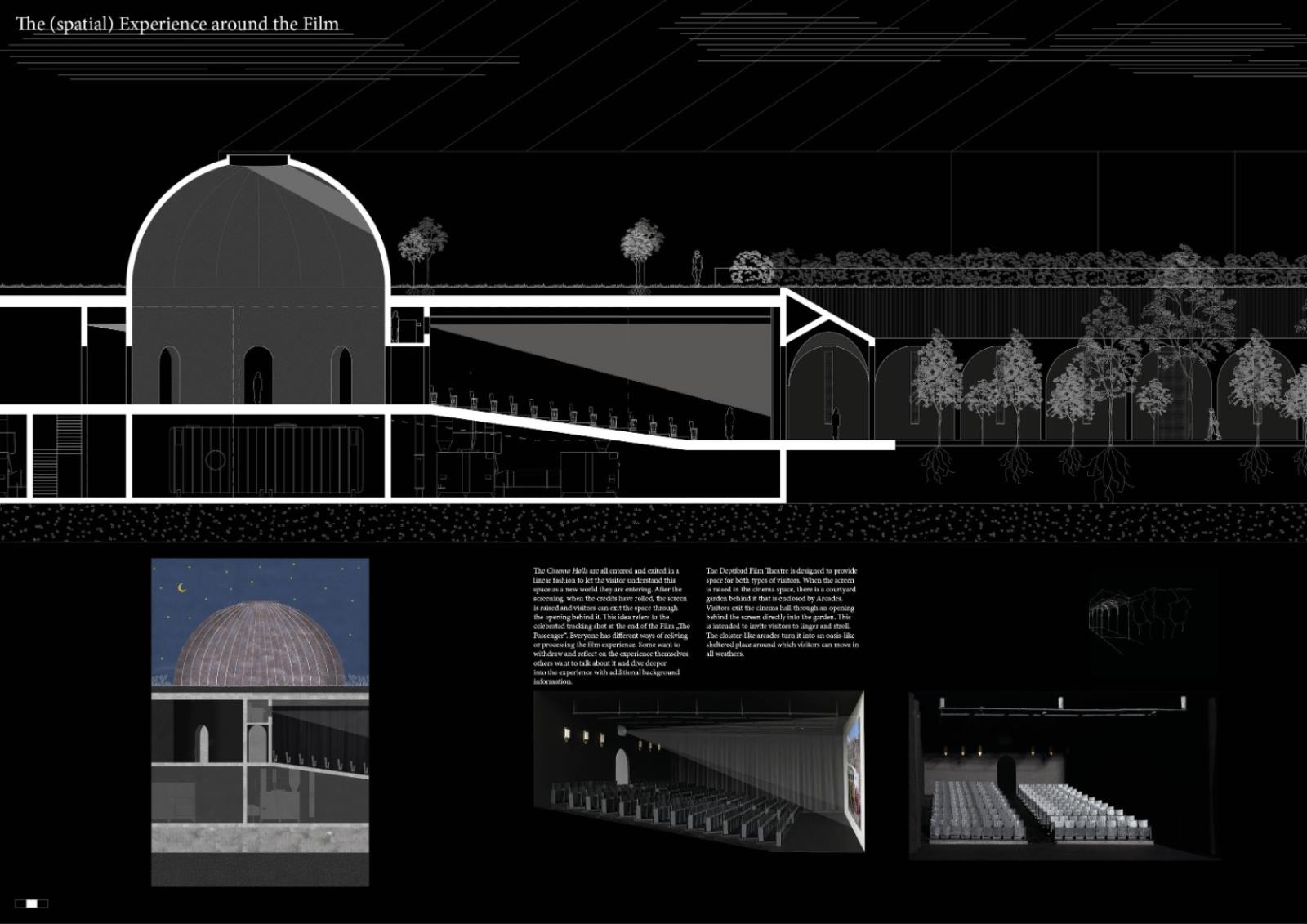 Film Theatre Deptford Part 1 Project 2021 Katrin Schneyer Technical University of Munich | Germany The Film Theatre Deptford is located on Convoys Wharf along the Thames and parallel to the historic footbridge. The intention of the building is to celebrate the experience of watching film in a spectacular sequence of spaces and to allow the medium of film to be experienced in different ways. In relation to the historic site and its now rough, and somewhat neglected character, which is worth preserving, the building is not intended to make itself too important. The Film Theatre Deptford is largely underground and through paths between the visible volumes and the footbridge, the new becomes entangled with the old.Before entering the cinema, visitors can take a contemplative walk on the footbridge to mentally engage with the cinema experience. The funnel-shaped staircase, which leads into the Foyer, is designed to literally immerse the visitor in the building. Light reaches exclusively through the glazed front of the funnel. The narrower the space gets, the darker it becomes. It thus creates a transition and prepares the visitor for the black rooms that follow: A video art exhibition, the “Black Samovar bar” under a projection sculpture, the corridor light installation and three cinema halls.[This entry was produced by the author while studying at Kingston University during the academic year 2020/21 as a recipient of an Erasmus scholarship funded by the European Union.] Tutor(s) David Owen (Kingston University) Michael Badu (Kingston University)