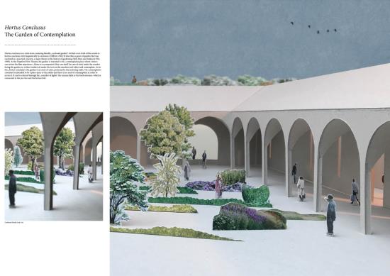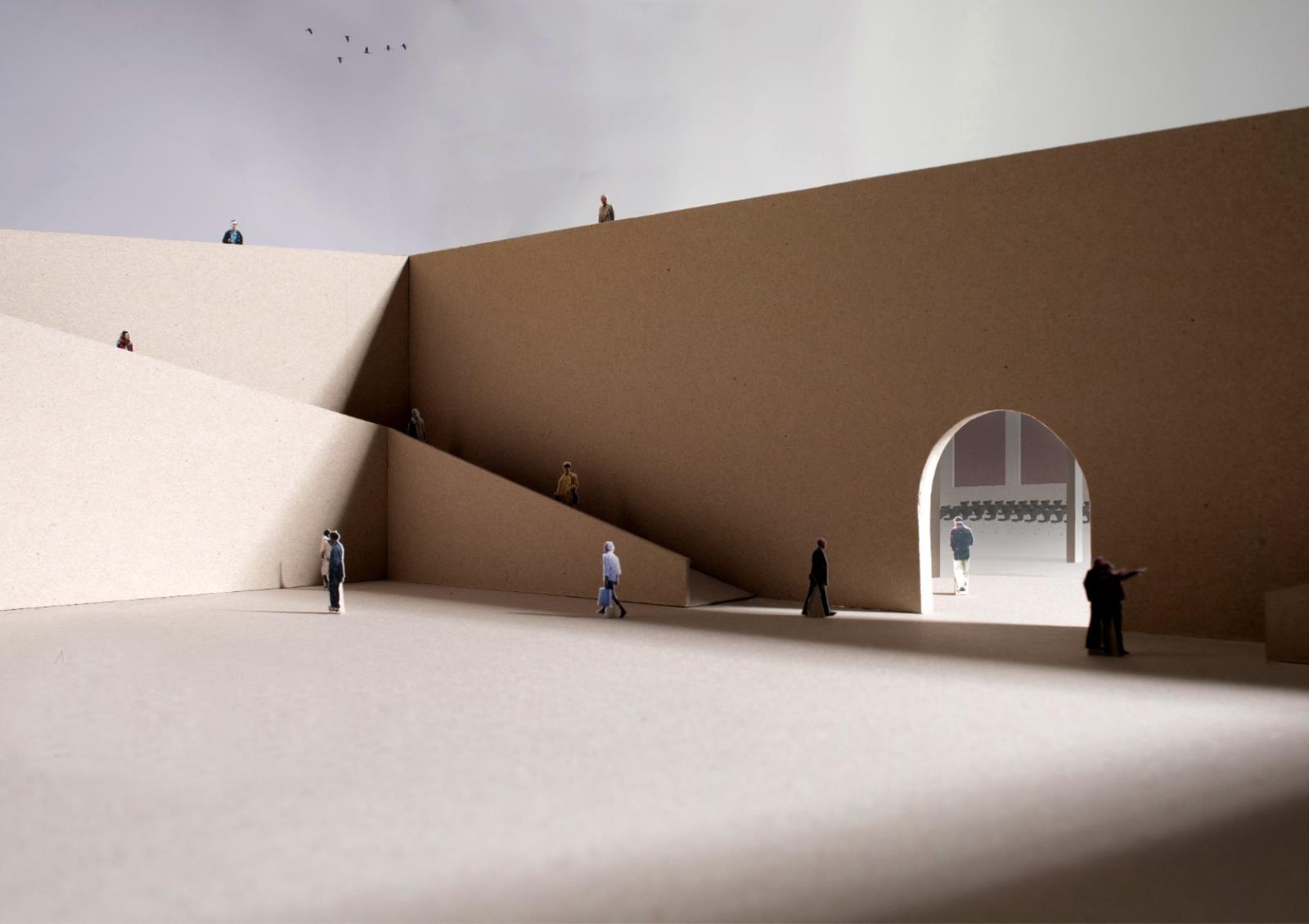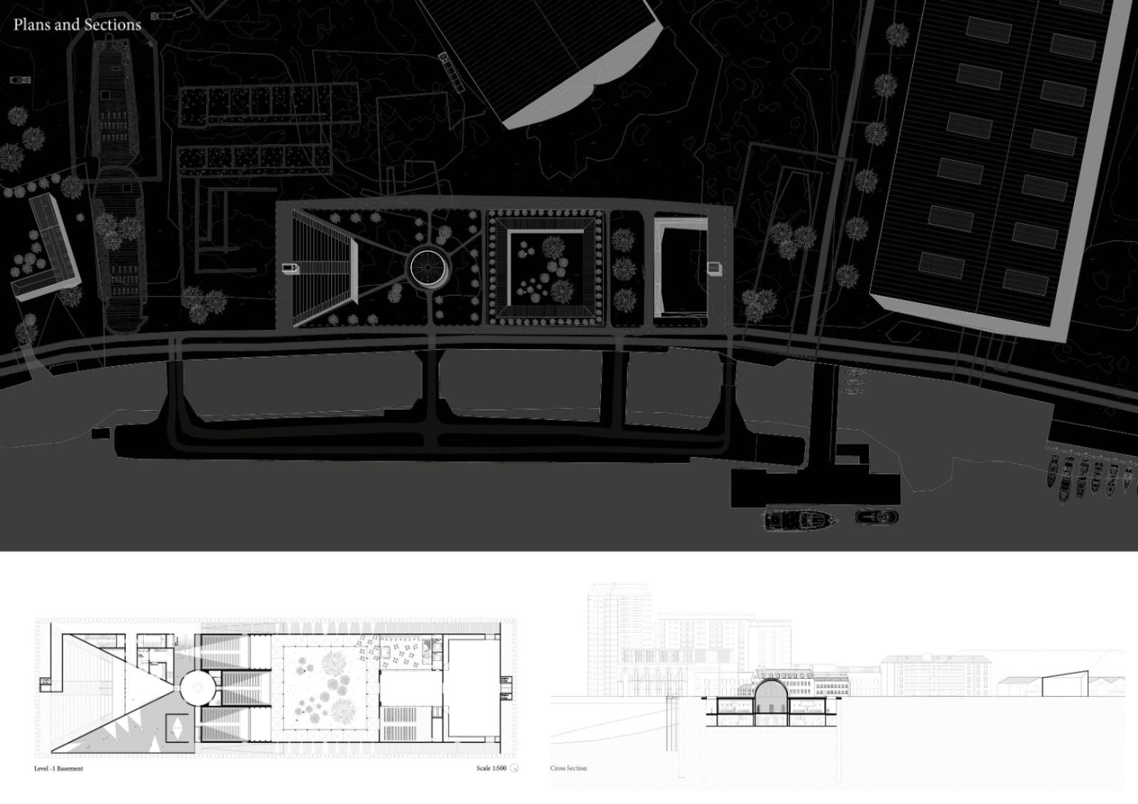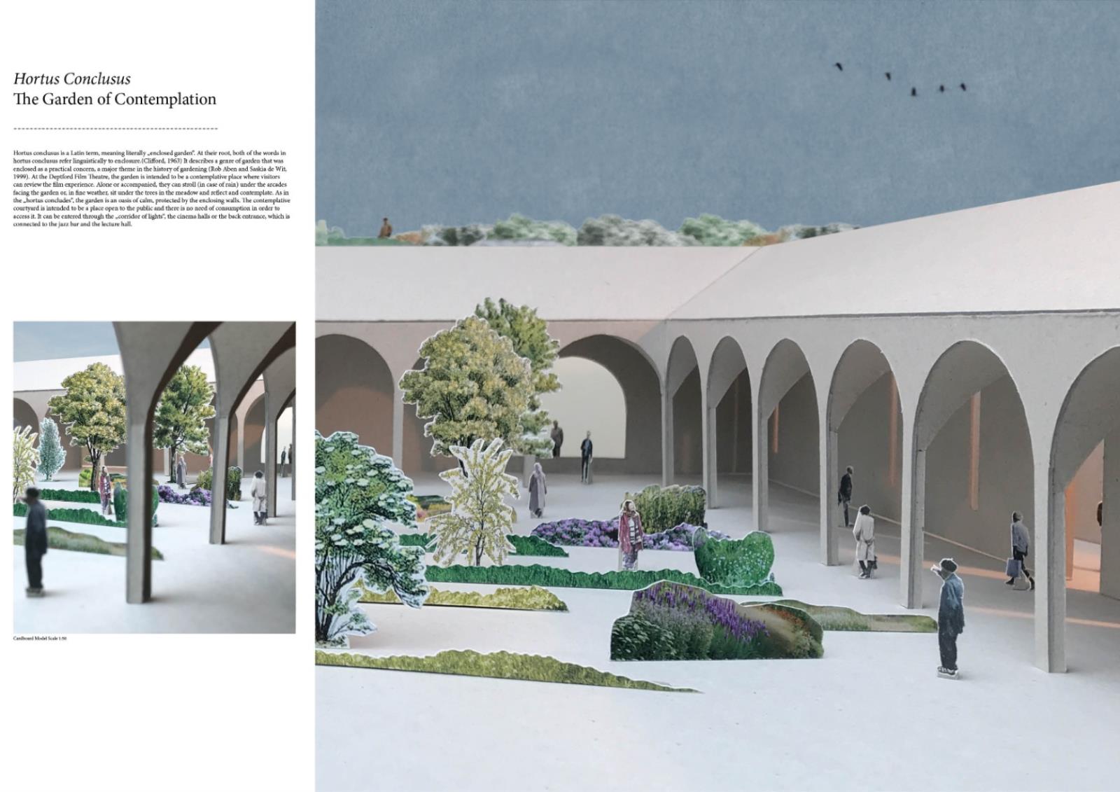 Film Theatre Deptford Part 1 Project 2021 Katrin Schneyer Technical University of Munich | Germany The Film Theatre Deptford is located on Convoys Wharf along the Thames and parallel to the historic footbridge. The intention of the building is to celebrate the experience of watching film in a spectacular sequence of spaces and to allow the medium of film to be experienced in different ways. In relation to the historic site and its now rough, and somewhat neglected character, which is worth preserving, the building is not intended to make itself too important. The Film Theatre Deptford is largely underground and through paths between the visible volumes and the footbridge, the new becomes entangled with the old.Before entering the cinema, visitors can take a contemplative walk on the footbridge to mentally engage with the cinema experience. The funnel-shaped staircase, which leads into the Foyer, is designed to literally immerse the visitor in the building. Light reaches exclusively through the glazed front of the funnel. The narrower the space gets, the darker it becomes. It thus creates a transition and prepares the visitor for the black rooms that follow: A video art exhibition, the “Black Samovar bar” under a projection sculpture, the corridor light installation and three cinema halls.[This entry was produced by the author while studying at Kingston University during the academic year 2020/21 as a recipient of an Erasmus scholarship funded by the European Union.] Tutor(s) David Owen (Kingston University) Michael Badu (Kingston University)