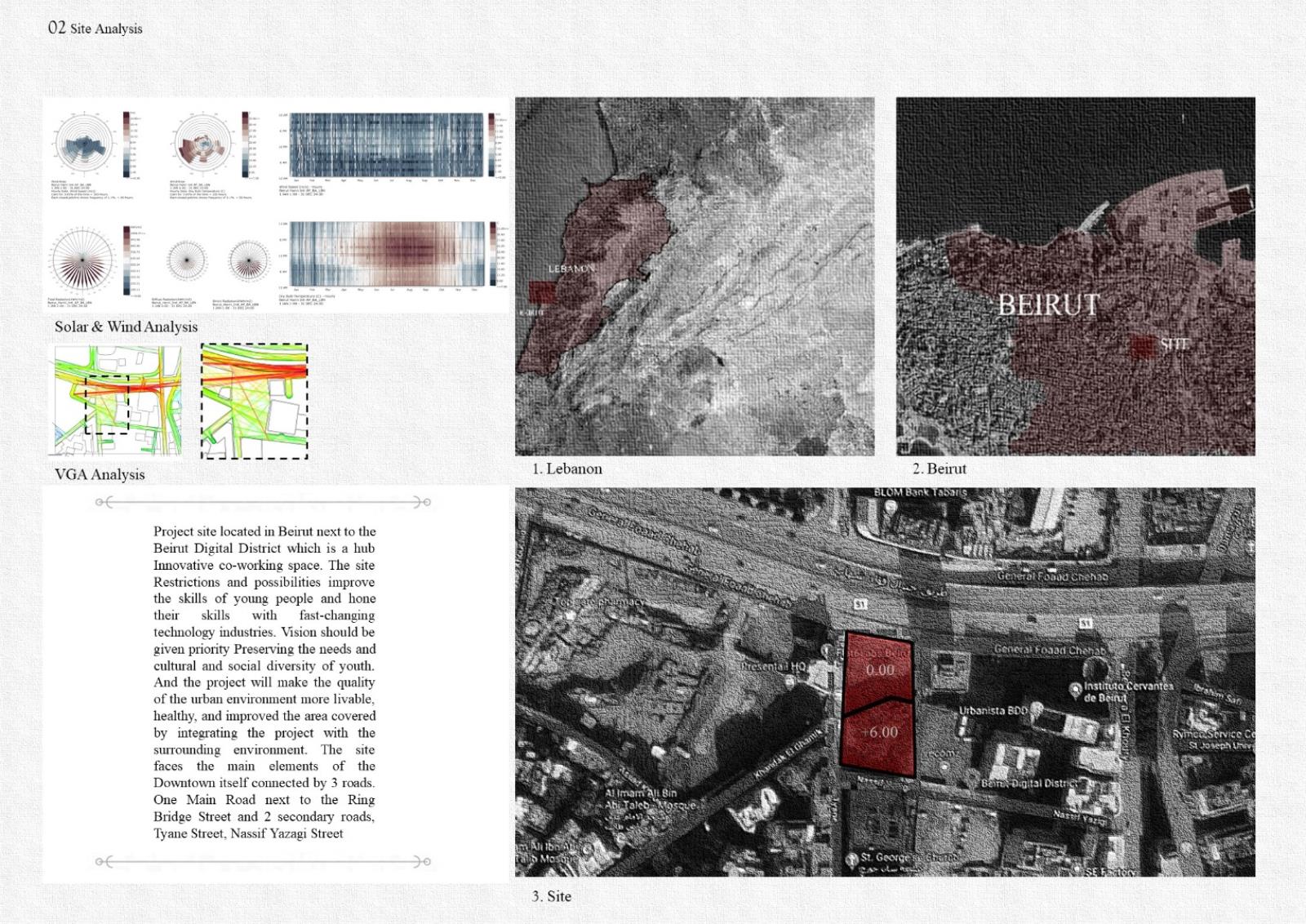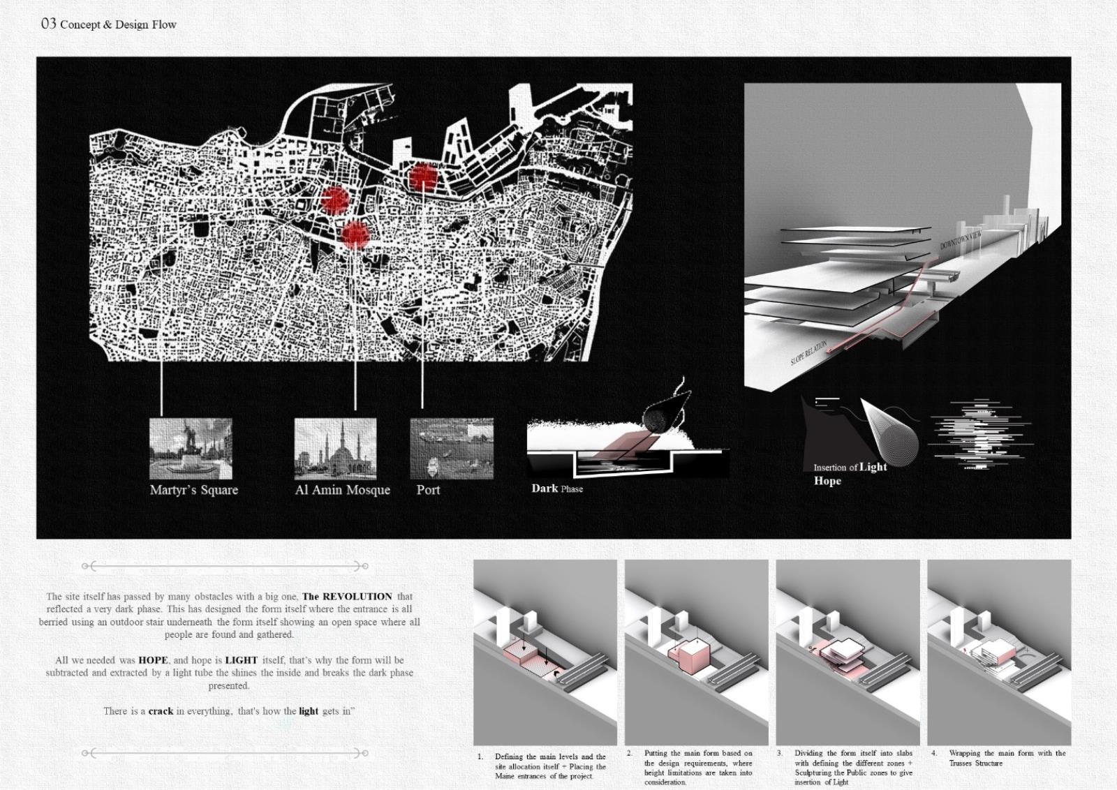 Beirut, the capital of Lebanon, is a city of baffling contradictions whose character blends the sophisticated and cosmopolitan with the provincial and parochial, a city that refuses to die and lately suffered from many problems that caused the damage of its heart after the tragedy of the Port Explosion. This lead to the concept itself where the project aims to work within the physical and social content to obtain the integrated leadership of the physical environment of site that passed a main recent obstacle, THE REVOLUTION, that reflected a very dark phase to the environment.