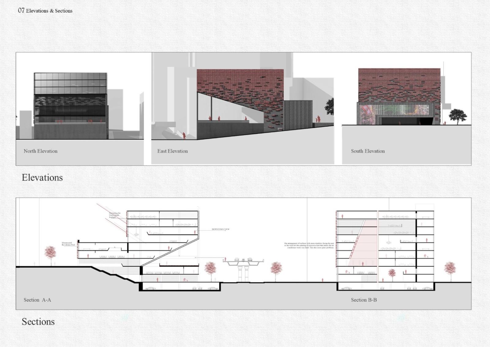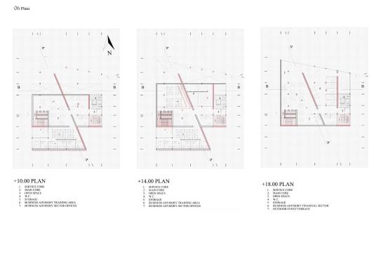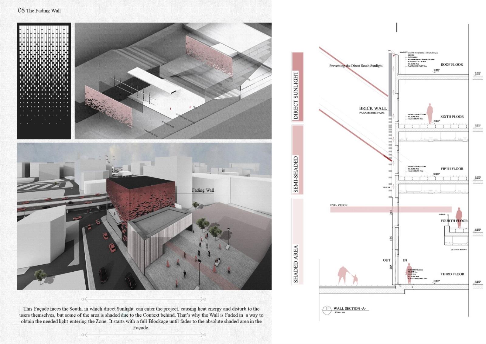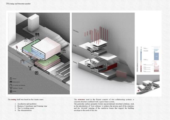 This reflected the idea of a Co-working office that help create young businesses by providing them with necessary support, financial, and technical services which such a society needs. That’s why the entrances of the building are all berried underground using outdoor stair that let users reach to the minimum levels that lands behind a revolution monumental display screen that shows the history site. But as we reach down the spaces are all open that presents the citizens hope during this phase. Hope means light, that’s why the form is subtracted and extracted by a light tube that shines the inside and breaks the dark.