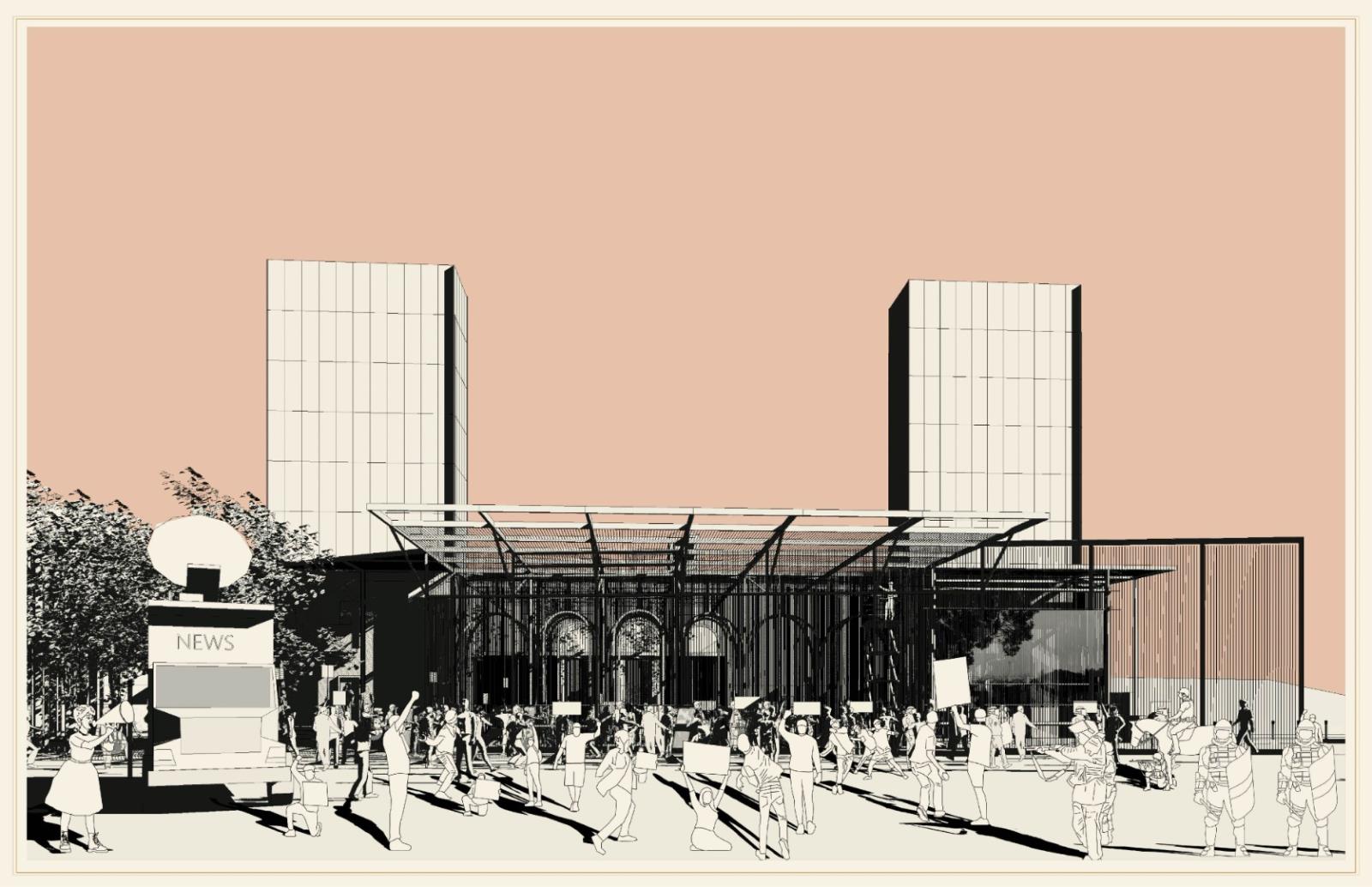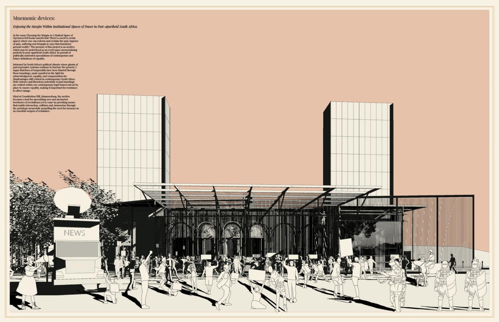 Mnemonic Devices: Exposing the Margin within Institutional Spaces of Power in Post-Apartheid South Africa Part 2 Project 2021 Nothando Lunga University of Johannesburg | South Africa In the essay Choosing the Margin As A Radical Space of Openness bell hooks asserts that “there’s a need to create spaces where one can redeem and reclaim the past, legacies of pain, suffering and triumph in ways that transform present reality”. The premise of this project is an archive, which may be understood as an event space memorializing protests in post- apartheid South Africa. In pursuit of politically motivated speculations of contemporary and future definitions of equality. Informed by South Africa’s political climate where ghosts of past repressive systems continue to fracture the present. I argue that lines of temporality have been blurred through these hauntings, made manifest in the fight for acknowledgment, equality, and compensation for disadvantages still evident in contemporary South Africa. Both violence and liberatory potentials of past hauntings are evident within our contemporary legal framework set in place to ensure equality, making it important for resistance to effect change.Sited at Constitution Hill, Johannesburg, the archive becomes a tool for speculating new and uncharted territories of revolutions yet to come by providing means that enable interaction, collision and, immersion through the prototype meanwhile propelling the need for memory as an essential weapon of resistance. Tutor(s) Sarah De Villiers Naadira Patel Huda Tayob