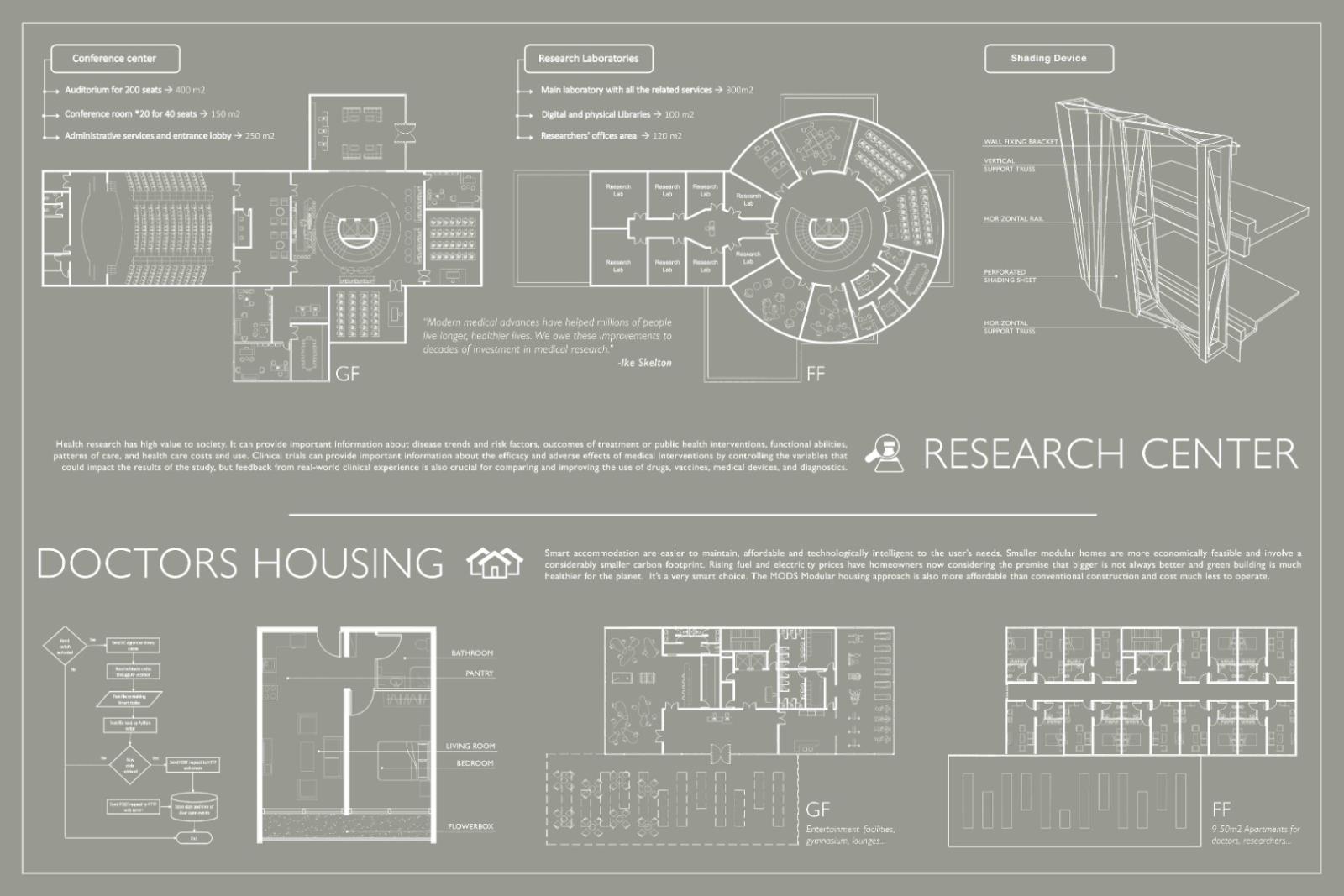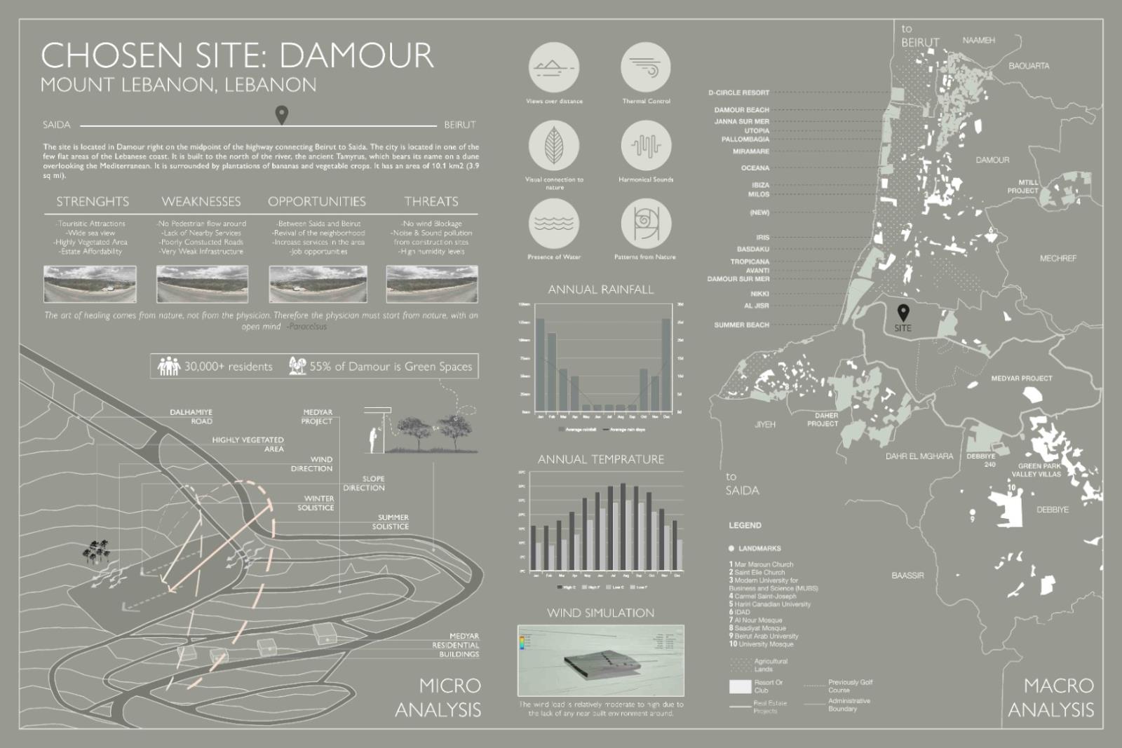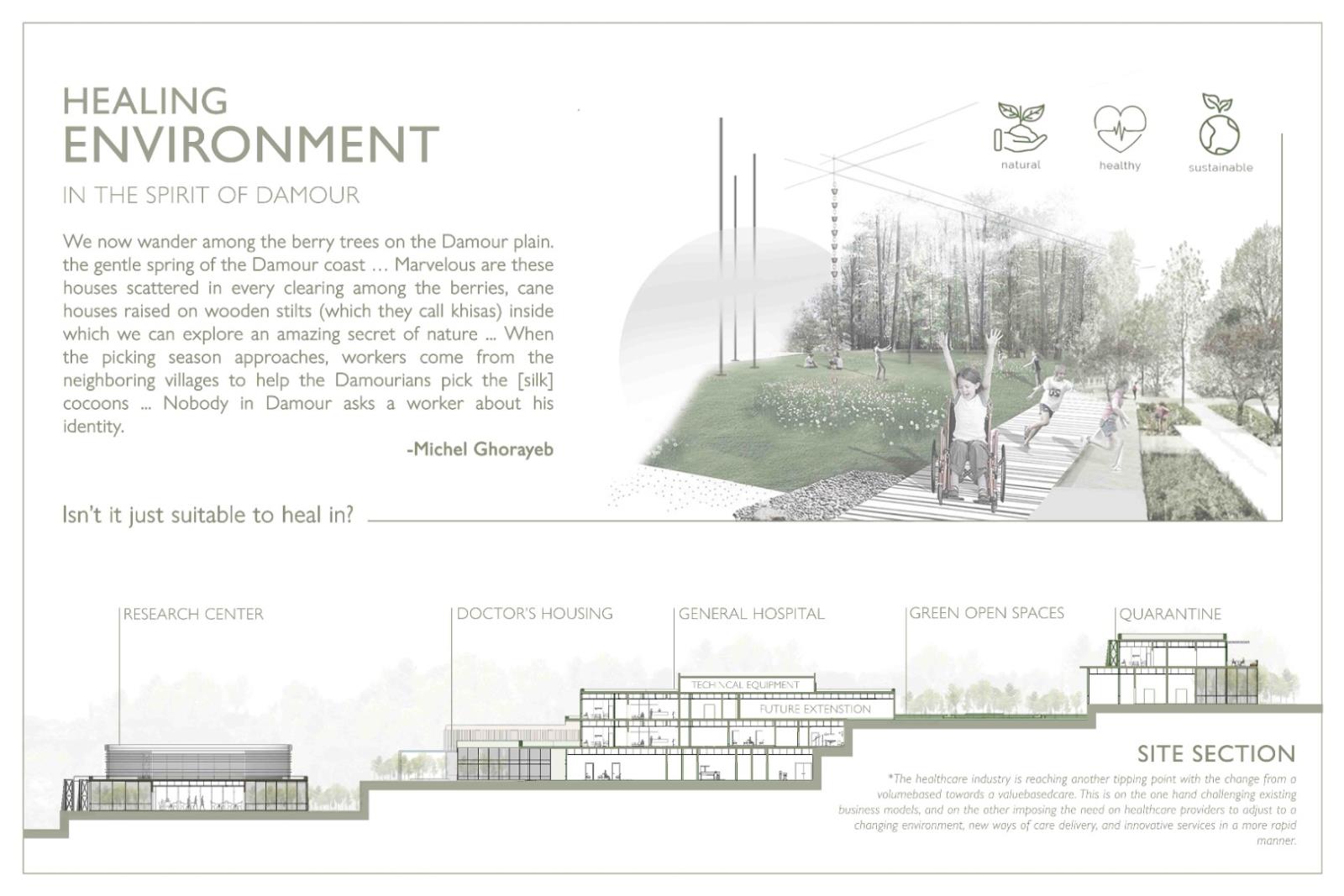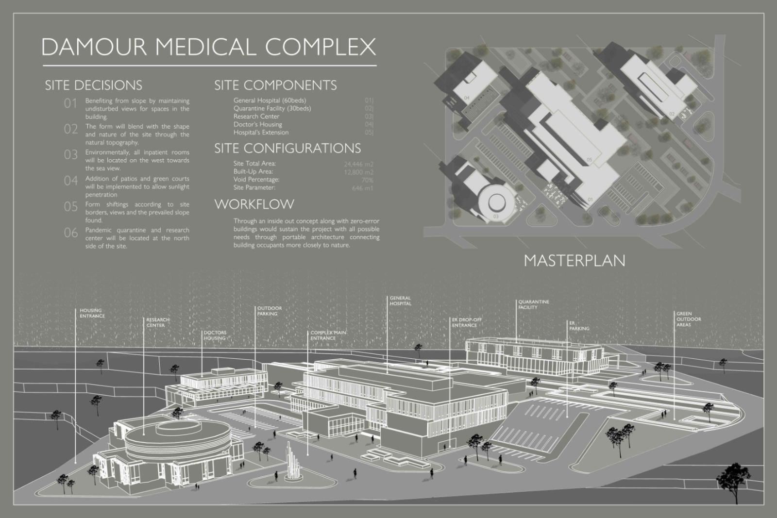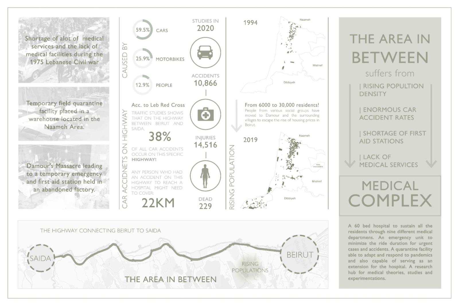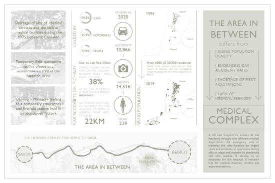 Healing the Area in Between Part 1 Project 2021 Khaled Hammoud Beirut Arab University - Debbieh campus | Lebanon The area in between refers to the rural areas on the highway connecting two of the most urbanized areas in Lebanon, Beirut and Saida. By the end of the 20th century, urbanization rates kept increasing, overpopulation led people to inhibit the area in between. Today, these rural areas became occupied with more than 50,000 residents suffering from shortage of medical services. Traffic studies have shown that 38% of all vehicular accidents in Lebanon are those on this connecting highway and the victims’ lives of these accidents are threatened by the time they reach the nearest hospital. In order to solve this humanitarian catastrophe and in response to the Covid-19 Pandemic, a medical complex will be introduced in order to sustain and heal the area in between assuring the wellbeing of its occupants through the latest adaptable and sustainable healthcare strategies. A general hospital with nine different departments interconnected to a quarantine facility that both responds to pandemics and act as an extension when needed. A research hub for medical research and lab experimentations to stay updated on all health concerns. The whole complex operates through a series of interlinked functions adapting to all conditions and healing whoever’s in need. Tutor(s) Ayman Afifi Kareem Jalal