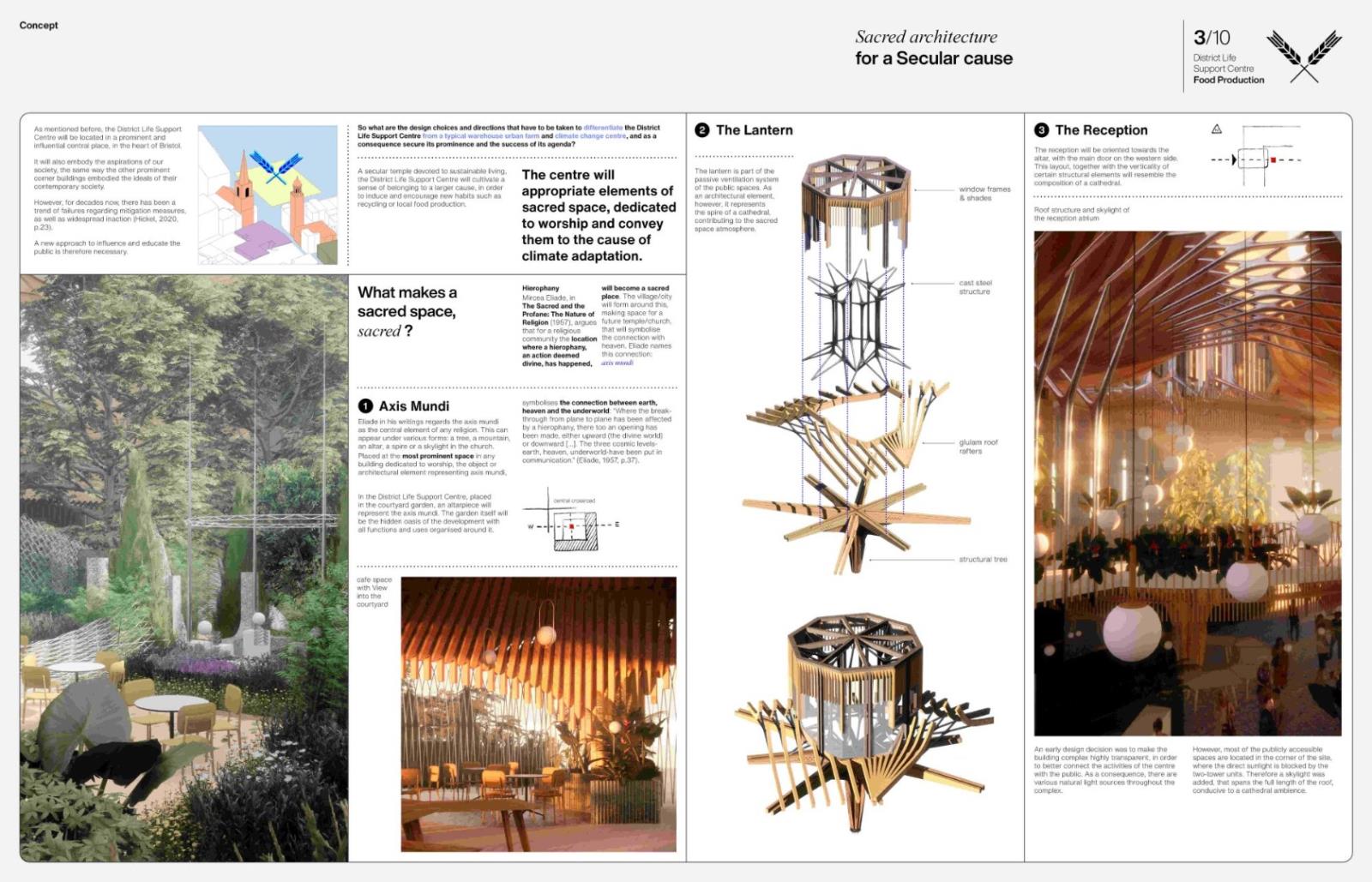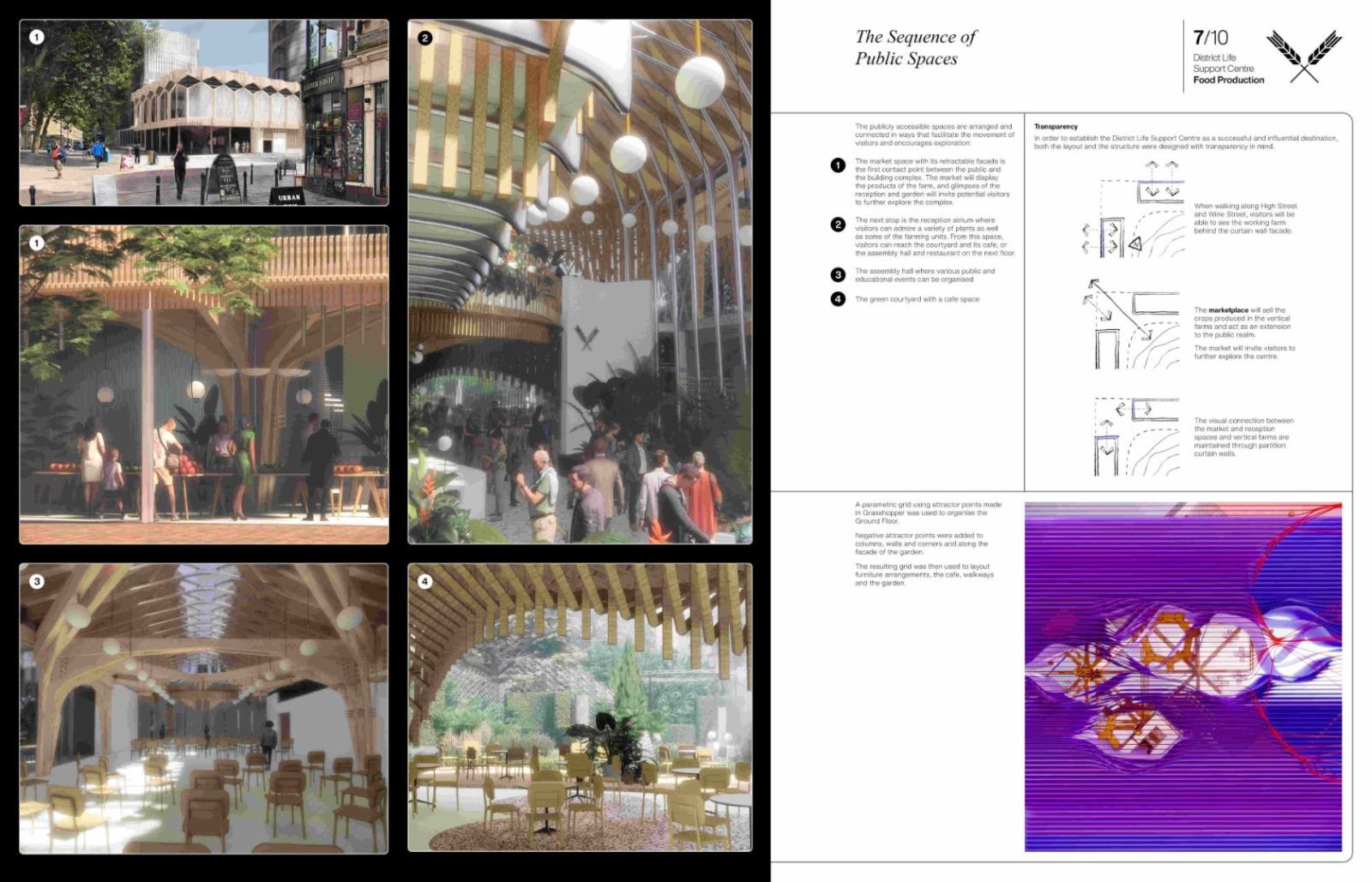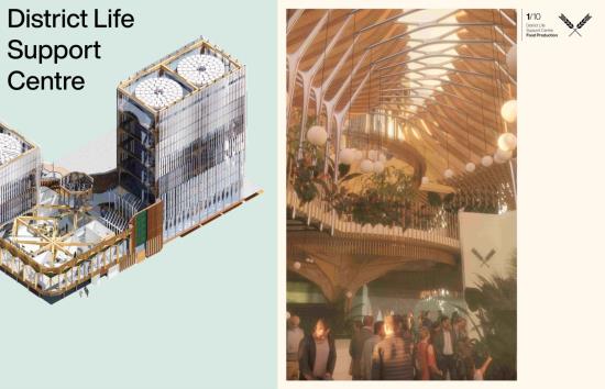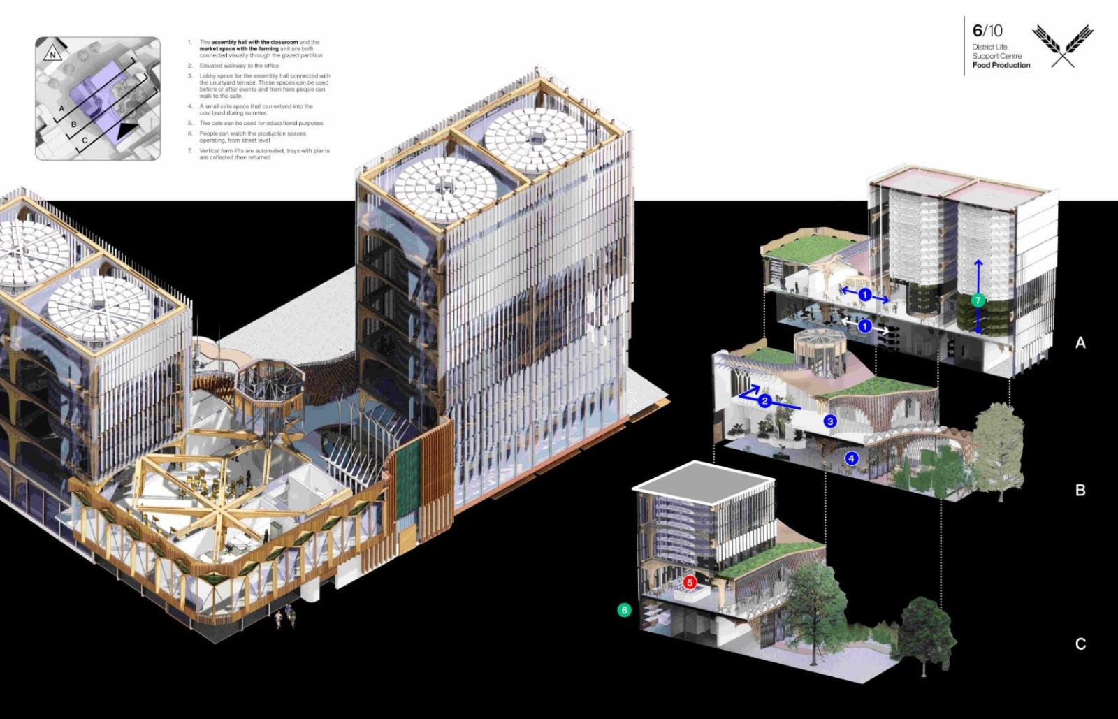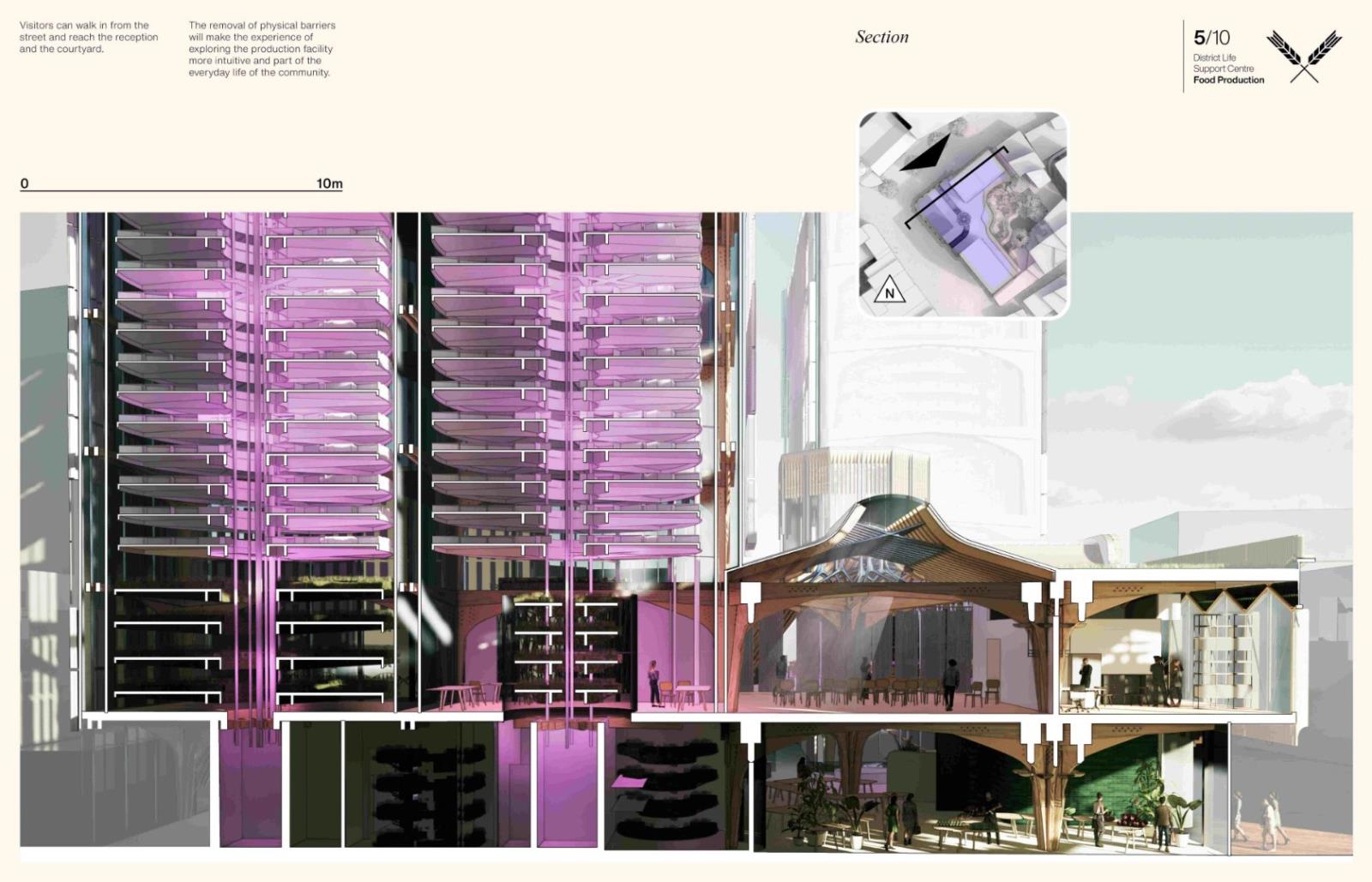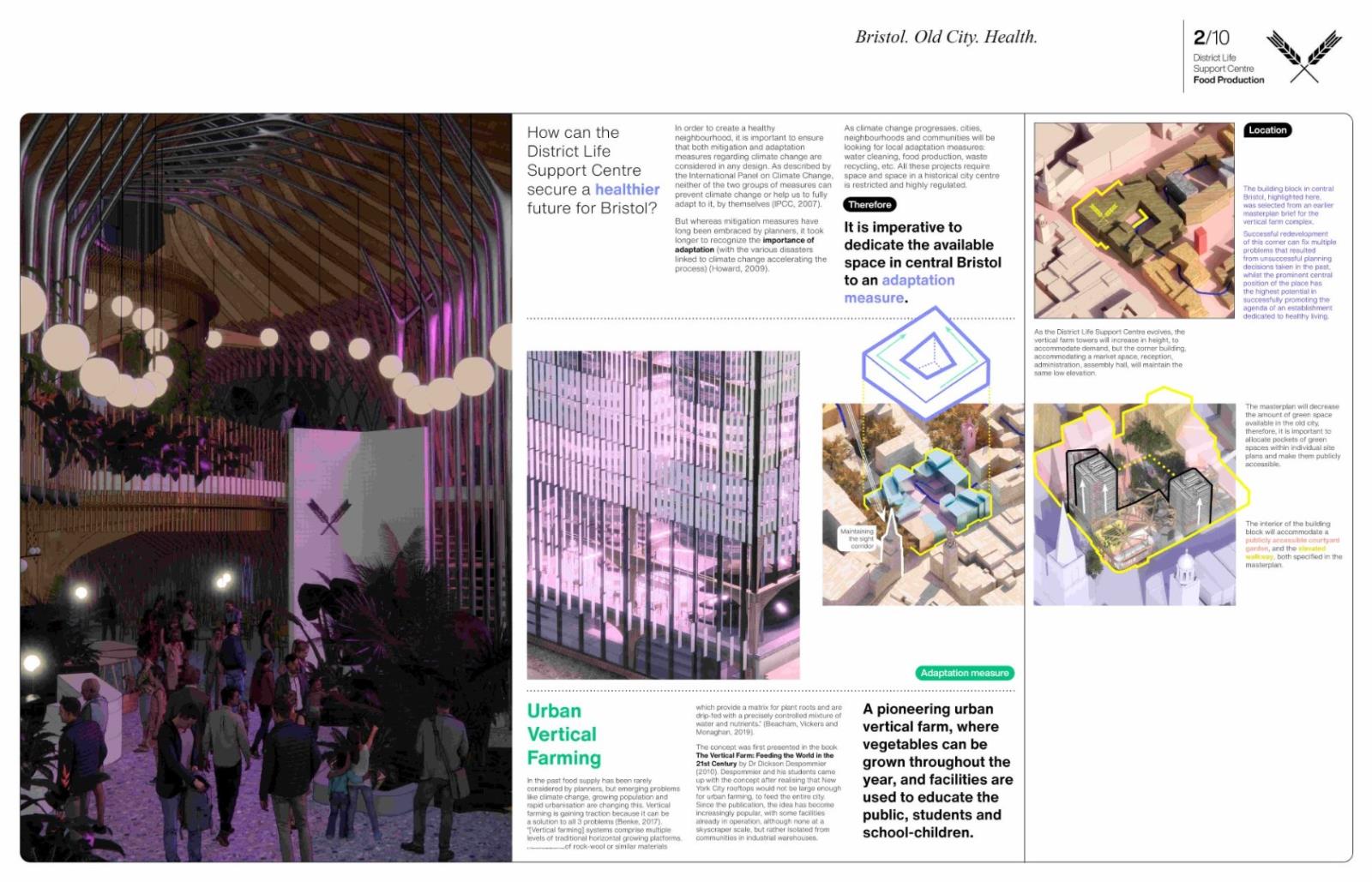 District Life Support Centre: Urban Farm Part 1 Project 2021 Lorand Gonczol University of the West of England | UK This project presents a pioneering urban vertical farm in central Bristol, where vegetables can be grown throughout the year, and where facilities are used to educate the public, students, and schoolchildren.The establishment will teach and inform the local community about the implications of climate change and the measures that are taken to adapt.The public will be able to acquire a clear understanding of the food production process.Food production at the local level will reduce pollution resulting from food delivery/transport, pesticides will be completely eliminated as the food is produced in a sterile environment, packaging will also be eliminated, and the neighbourhood will receive cleaner and healthier food. Tutor(s) Jonathan Bassindale