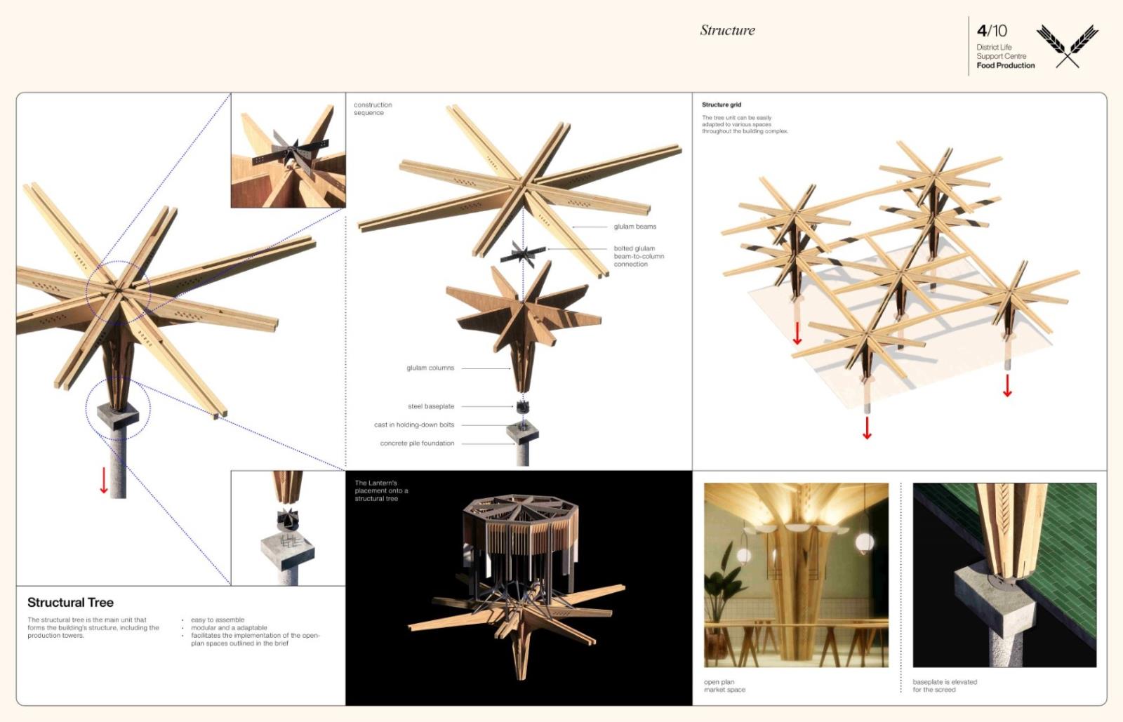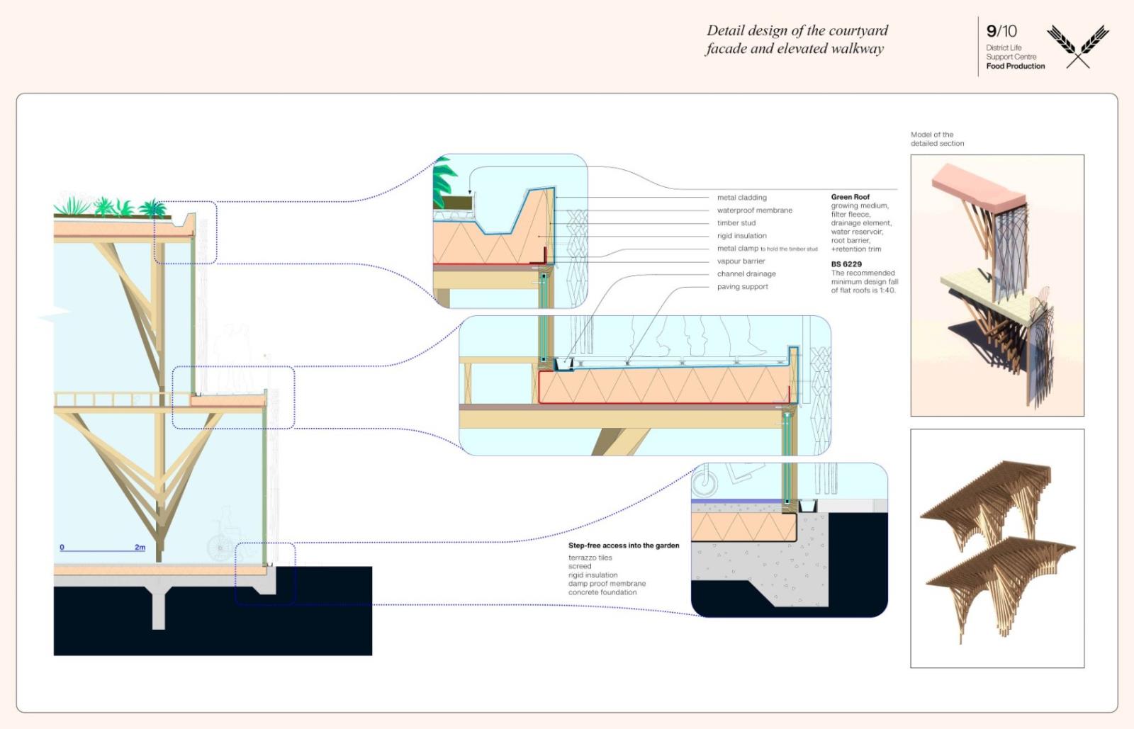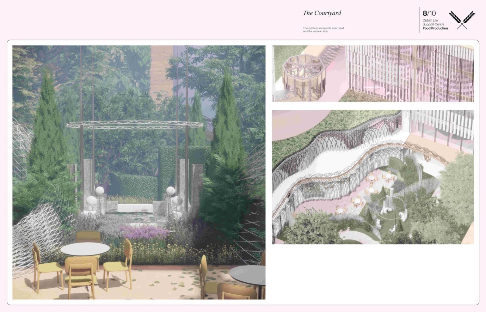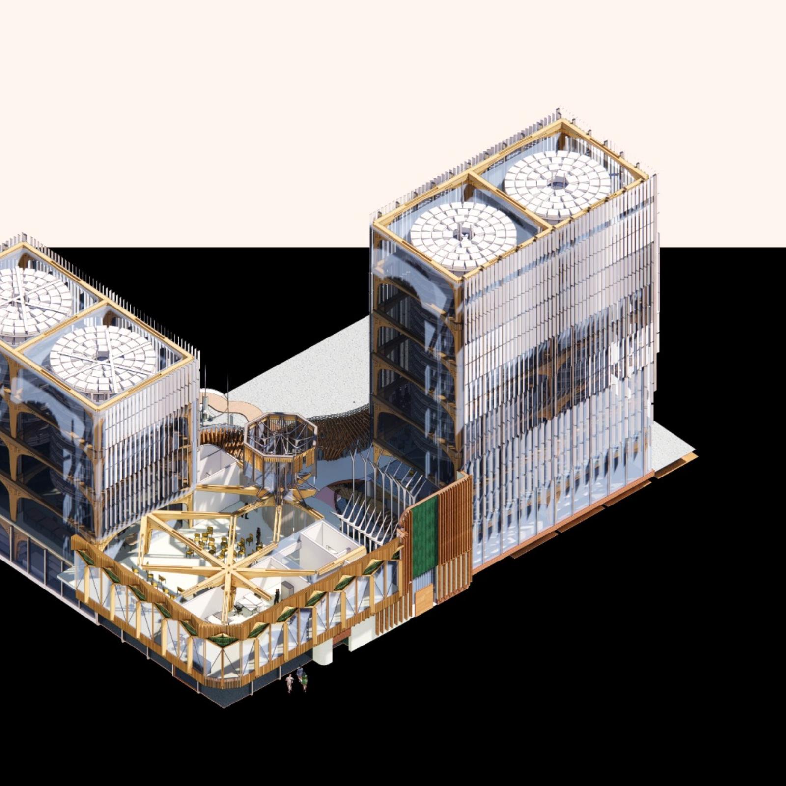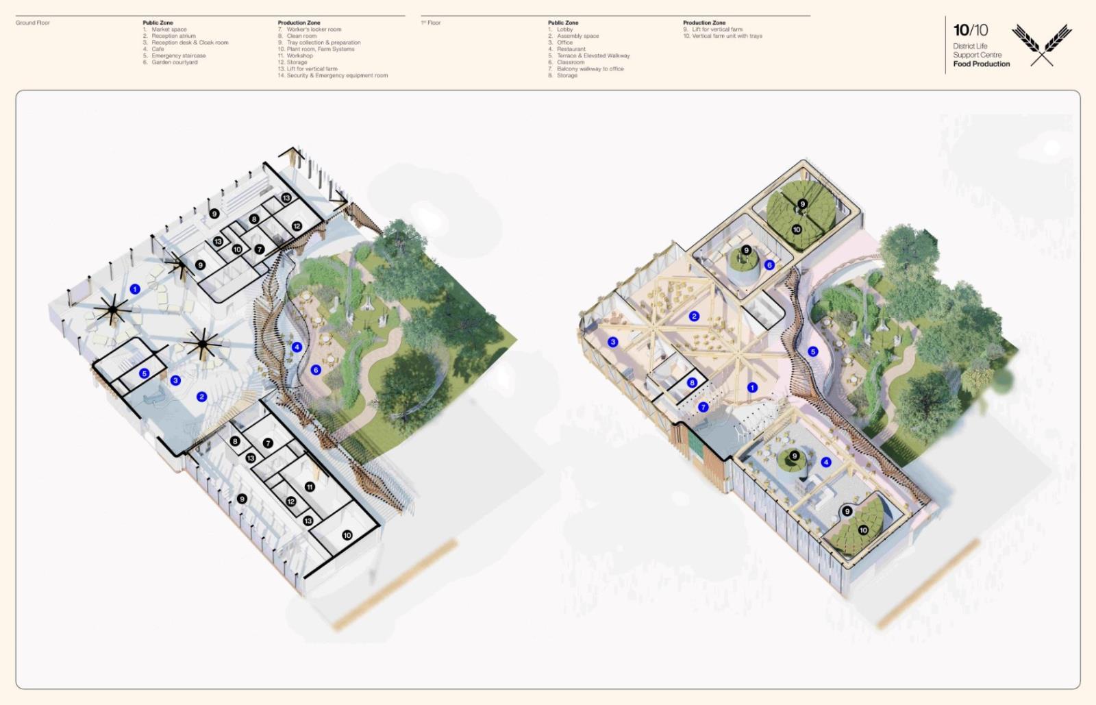 District Life Support Centre: Urban Farm Part 1 Project 2021 Lorand Gonczol University of the West of England | UK This project presents a pioneering urban vertical farm in central Bristol, where vegetables can be grown throughout the year, and where facilities are used to educate the public, students, and schoolchildren.The establishment will teach and inform the local community about the implications of climate change and the measures that are taken to adapt.The public will be able to acquire a clear understanding of the food production process.Food production at the local level will reduce pollution resulting from food delivery/transport, pesticides will be completely eliminated as the food is produced in a sterile environment, packaging will also be eliminated, and the neighbourhood will receive cleaner and healthier food. Tutor(s) Jonathan Bassindale