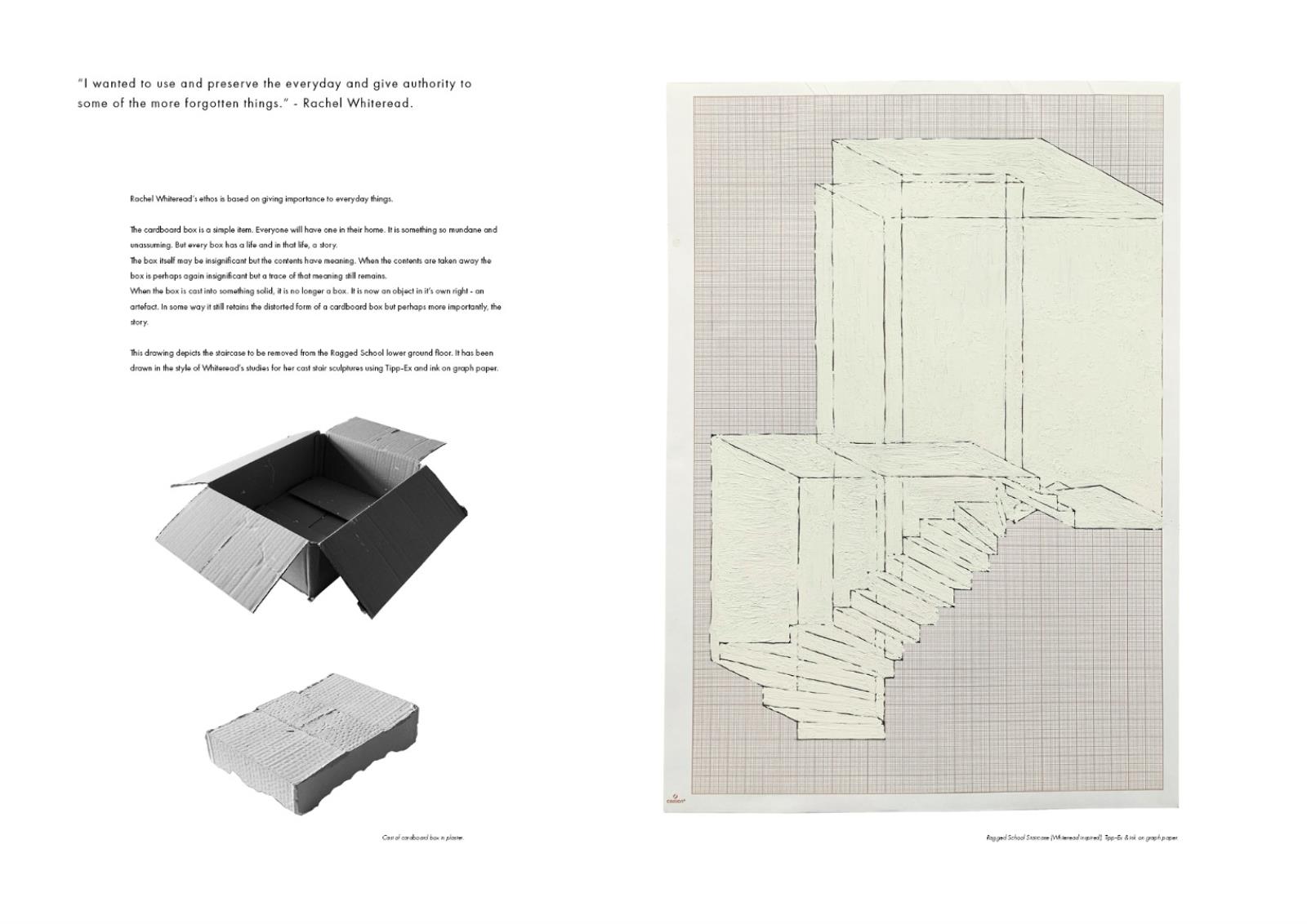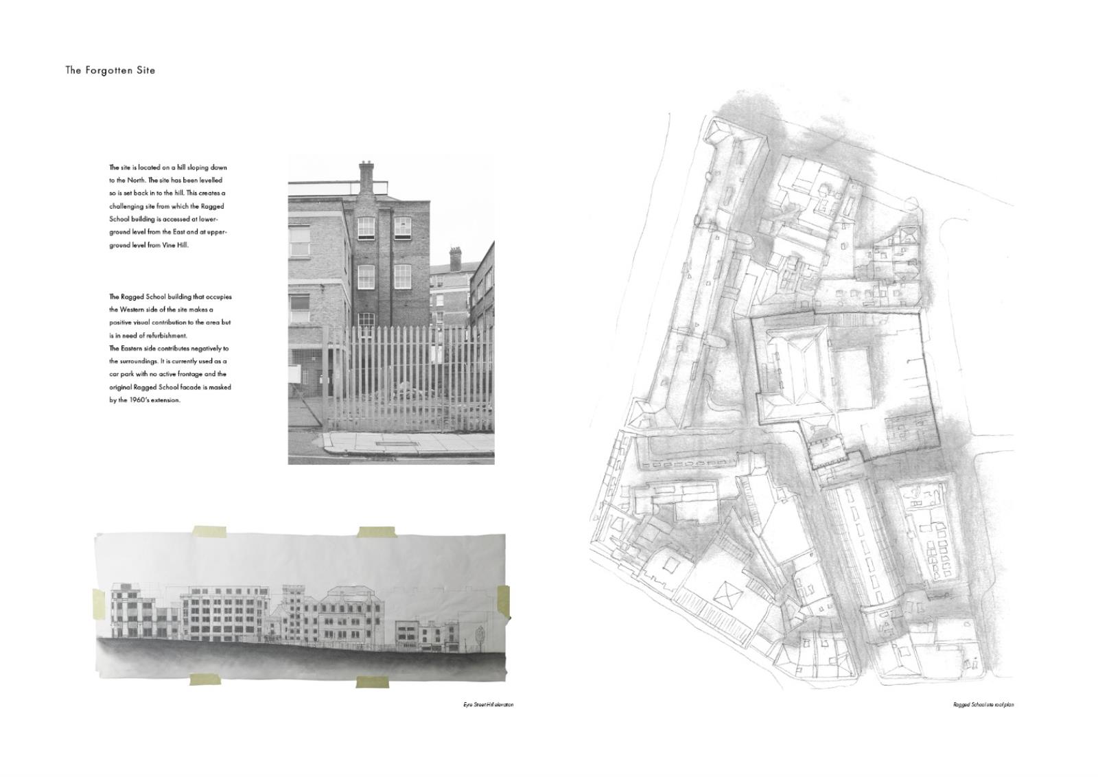 Forgotten Things Part 1 Project 2021 Thomas Joy University of East London London | UK The Clerkenwell Sculpture academy provides studio and workshop facilities as well as accommodation for eight young artists. Located in Clerkenwell, London, the site sits within the Hatton Garden Conservation Area and is sandwiched between two quiet backstreets.A public gallery is created with the adaptive re-use of the historically significant Ragged School Building on Vine Hill and a new public courtyard space for Clerkenwell is provided on a previously underused site.The combined academy and gallery would be led by Rachel Whiteread, and host visiting artists.The proposal intends to address issues faced by young artists by providing graduates the opportunity to live, work and exhibit in London whilst establishing industry connections and learning from renowned sculptors.The project responds to the works of Rachel Whiteread by adapting and utilising her ethos as an approach to the site. Tutor(s) Stephen Baty Alexander Scott-Whitby