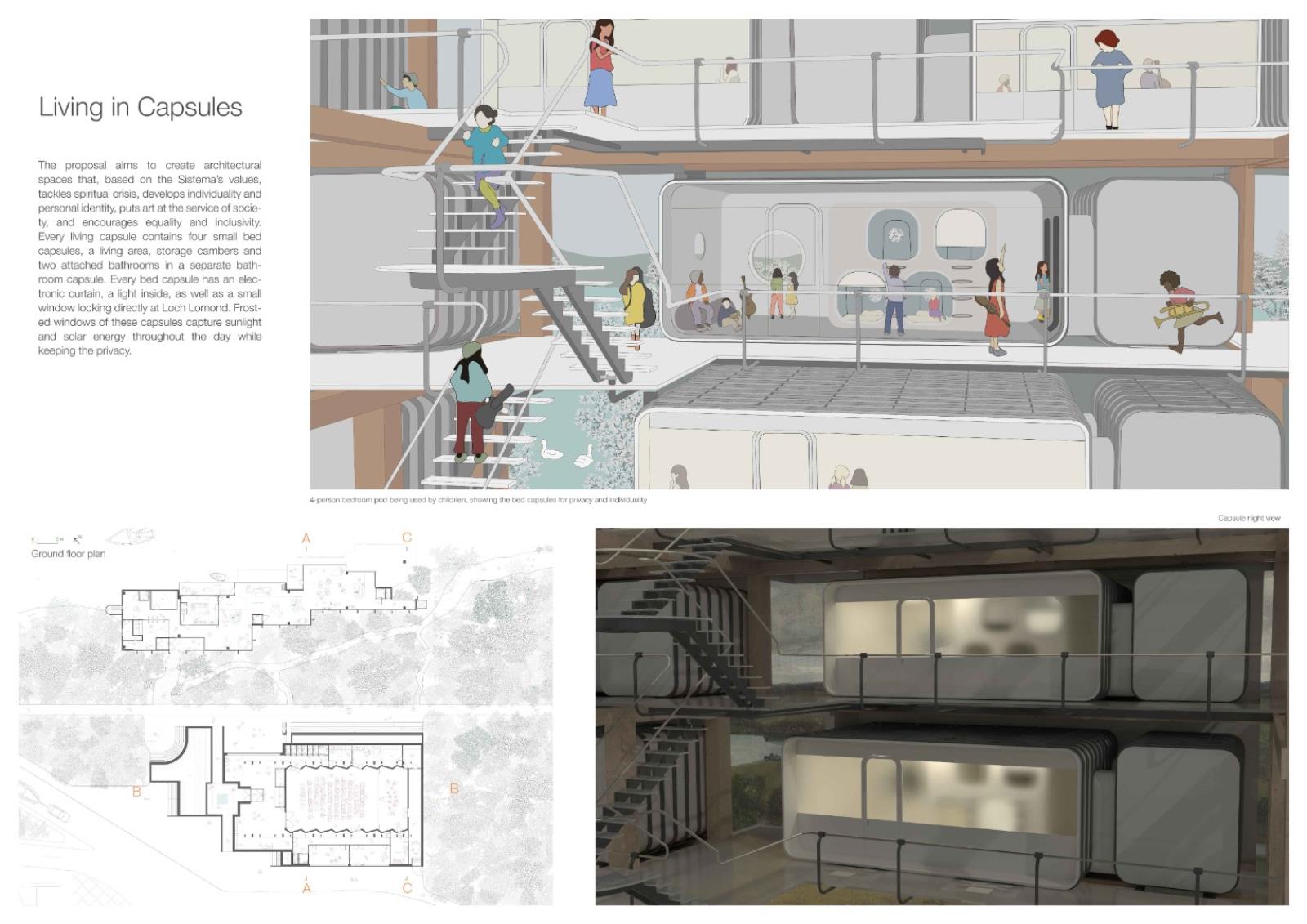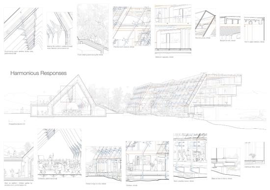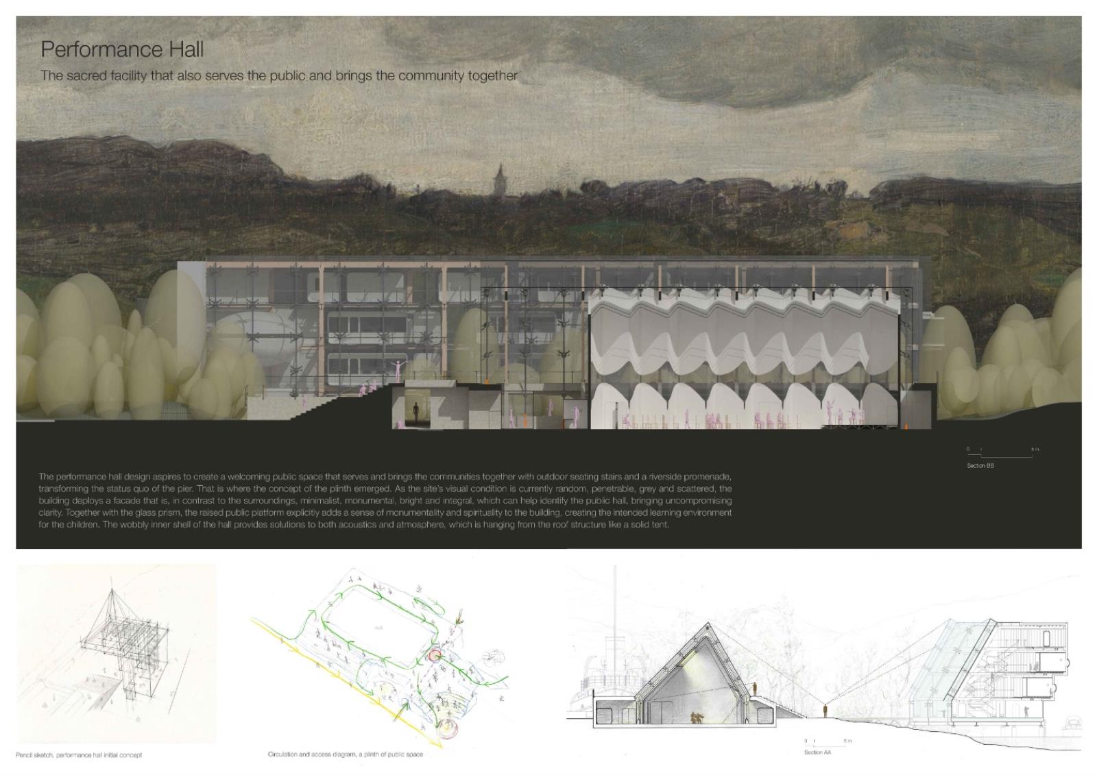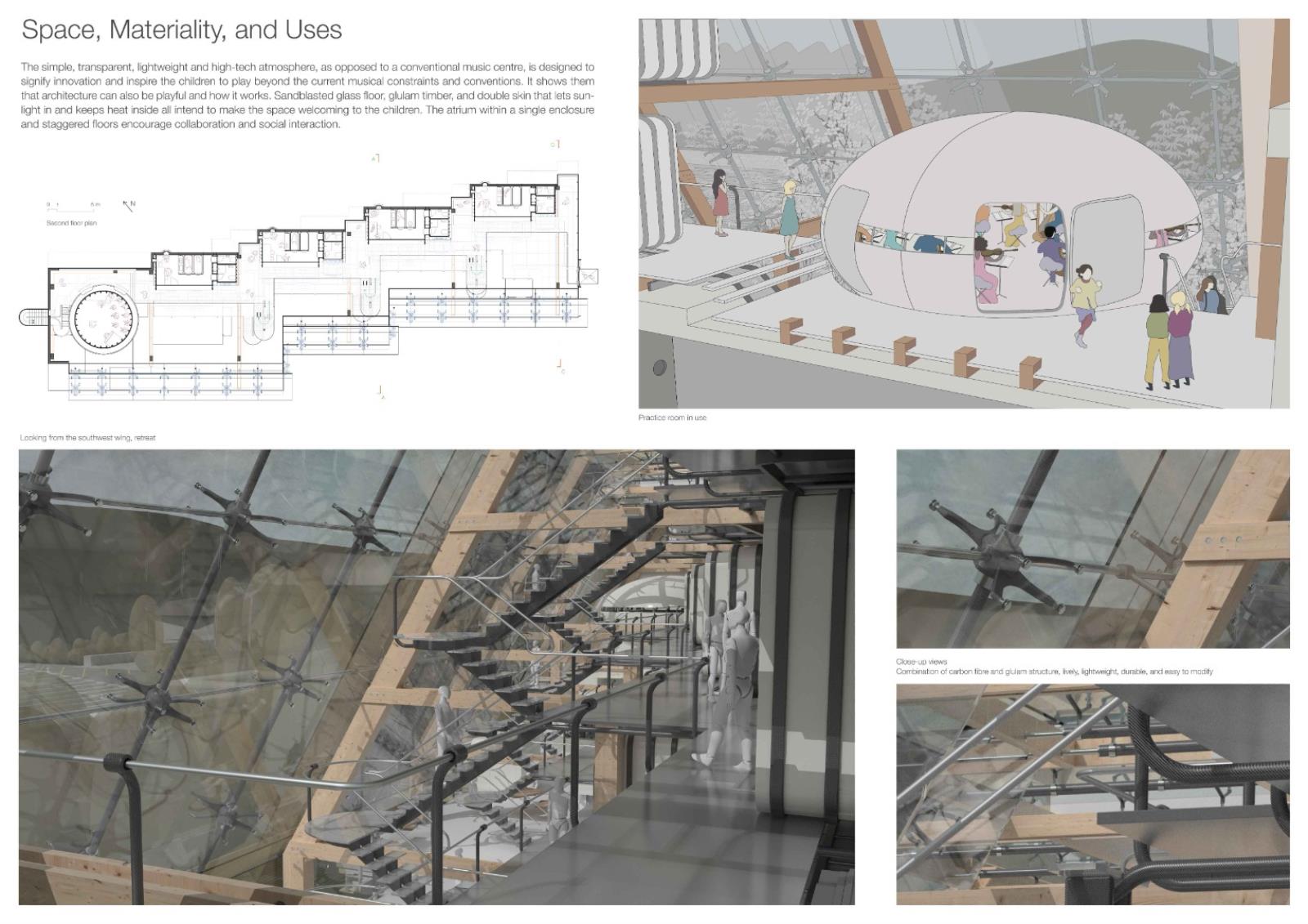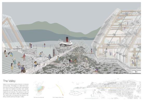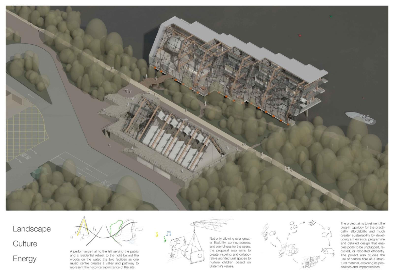 The programme, in this case, is applied to Sistema Scotland, a music charity for underprivileged children, and the site in Balloch on the shores of Loch Lomond is used as a testing ground for the programme. The design of a residential music retreat and performance hall creates a valley to represent the site’s historical significance and architectural spaces to nurture children based on Sistema’s values.