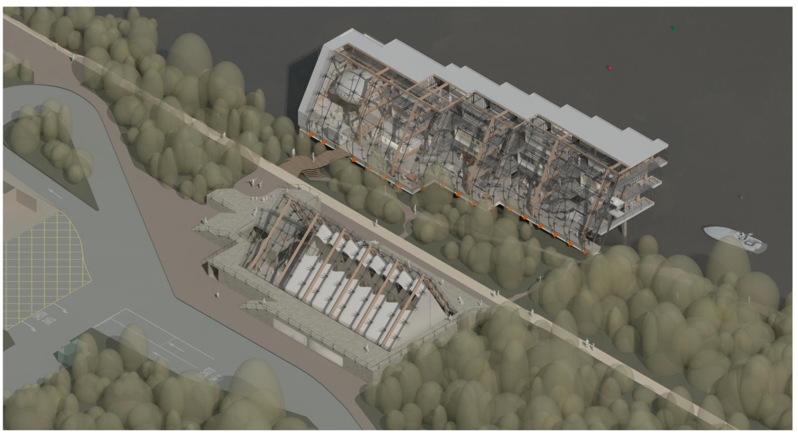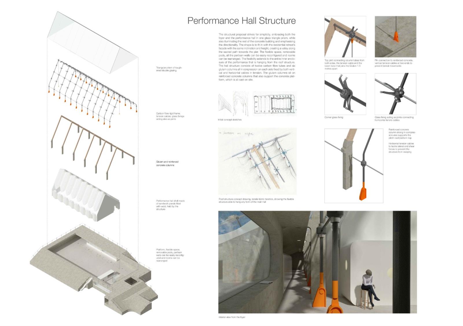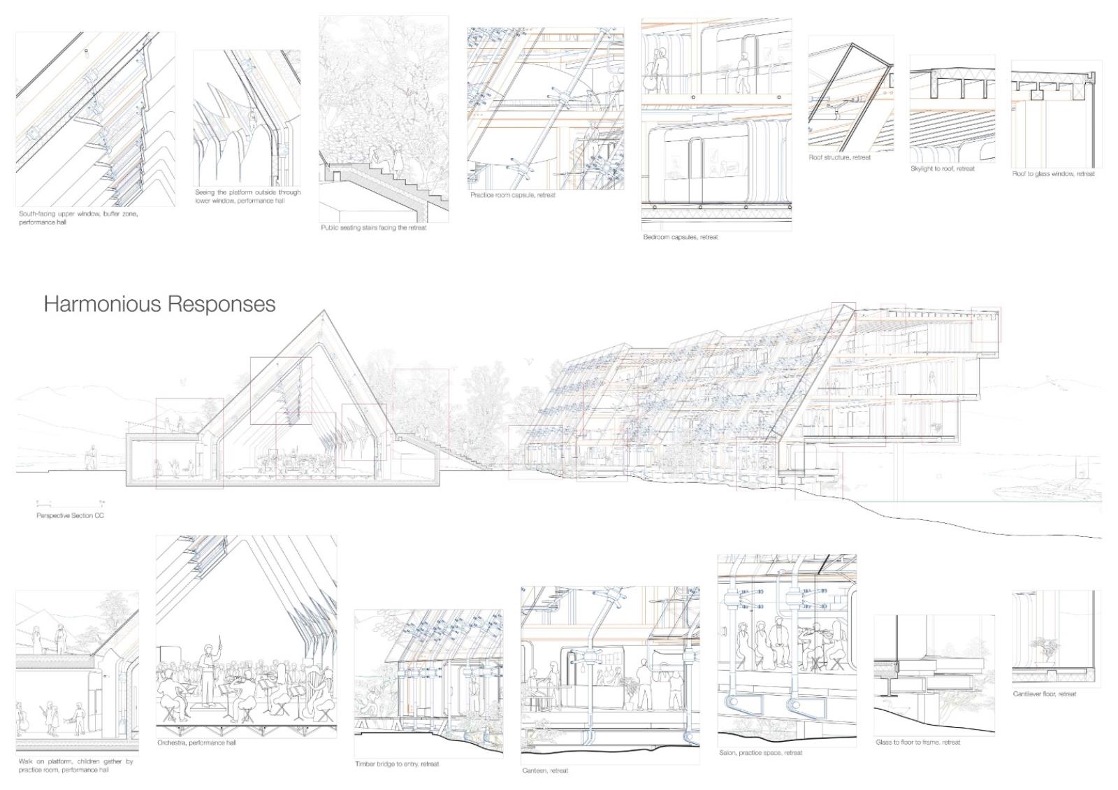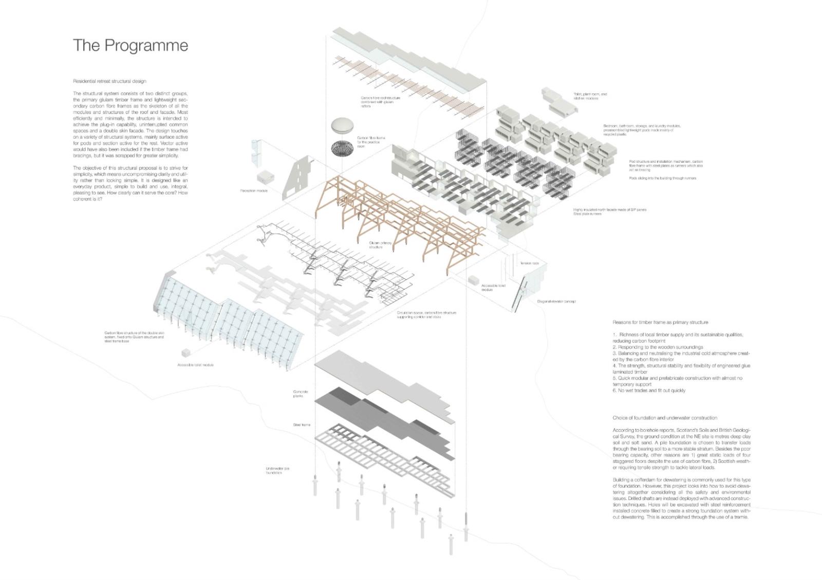 The programme, in this case, is applied to Sistema Scotland, a music charity for underprivileged children, and the site in Balloch on the shores of Loch Lomond is used as a testing ground for the programme. The design of a residential music retreat and performance hall creates a valley to represent the site’s historical significance and architectural spaces to nurture children based on Sistema’s values.