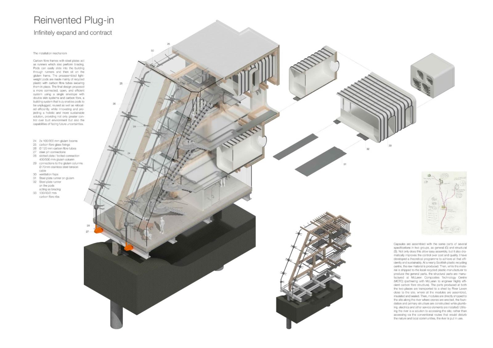 Investigating the evolution and critically examining the relevant figures and movements, key areas are identified and rethought, such as material, manufacture, transportation, and structural design. The project aims to reinvent the plug-in typology for the practicality, affordability, and much greater sustainability by developing a theoretical programme and detailed design that enables pods to be unplugged, recycled, or relocated efficiently. The project also studies the use of carbon fibre as a structural material, exploring its possibilities and impracticalities.