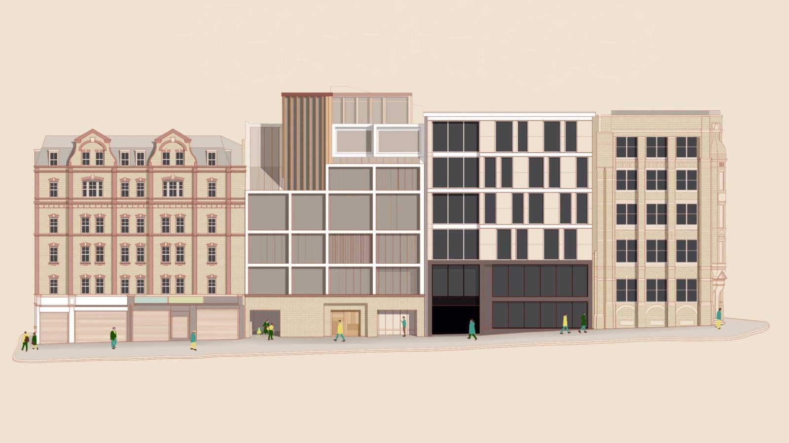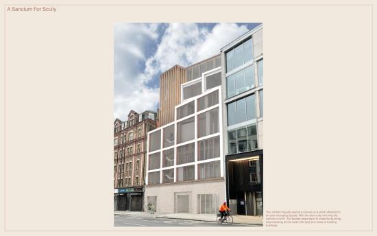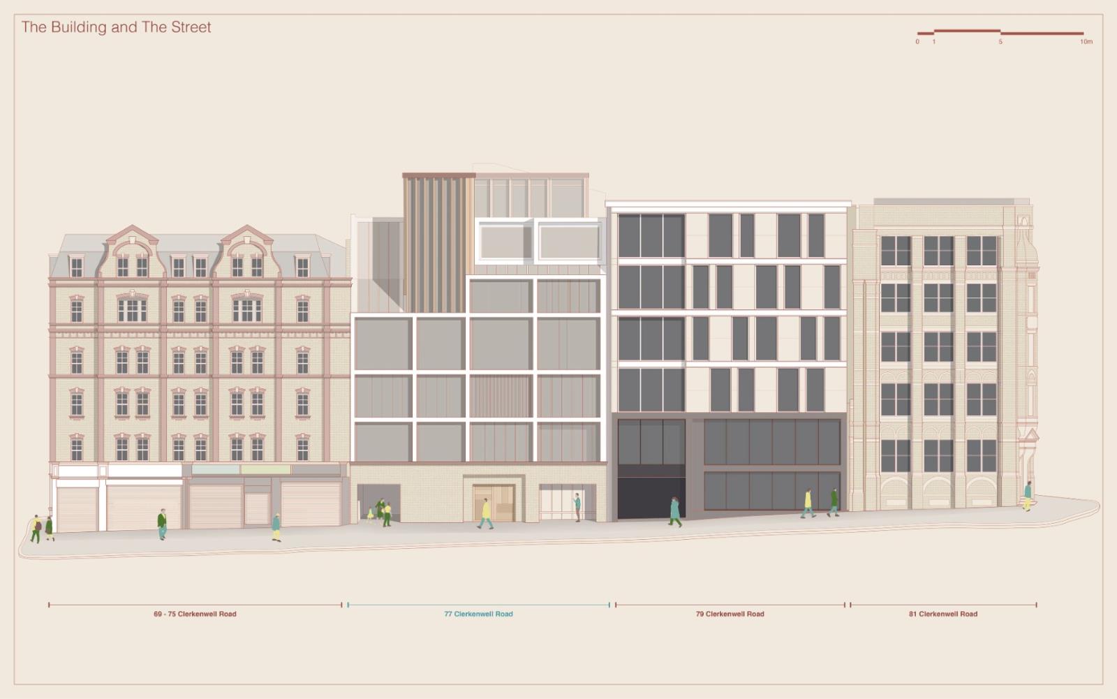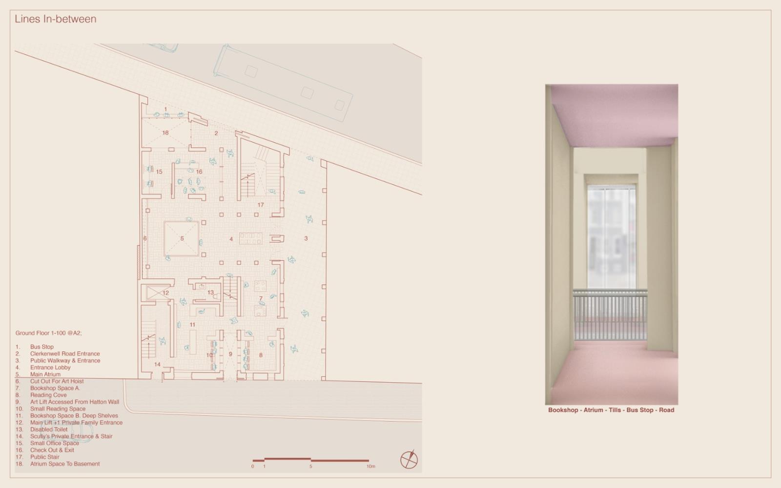 The proposal sits within the Hatton Garden Conservation Area, inhabiting the historic gap site at 77 Clerkenwell Road. To the community, it provides a four-floor bookshop, a free gallery, a route through the city, and a bus stop. For Scully, it provides a sanctum with two large studios, an archive, a garden, and a three-bedroom home with a temple on the roof surrounded by nature.