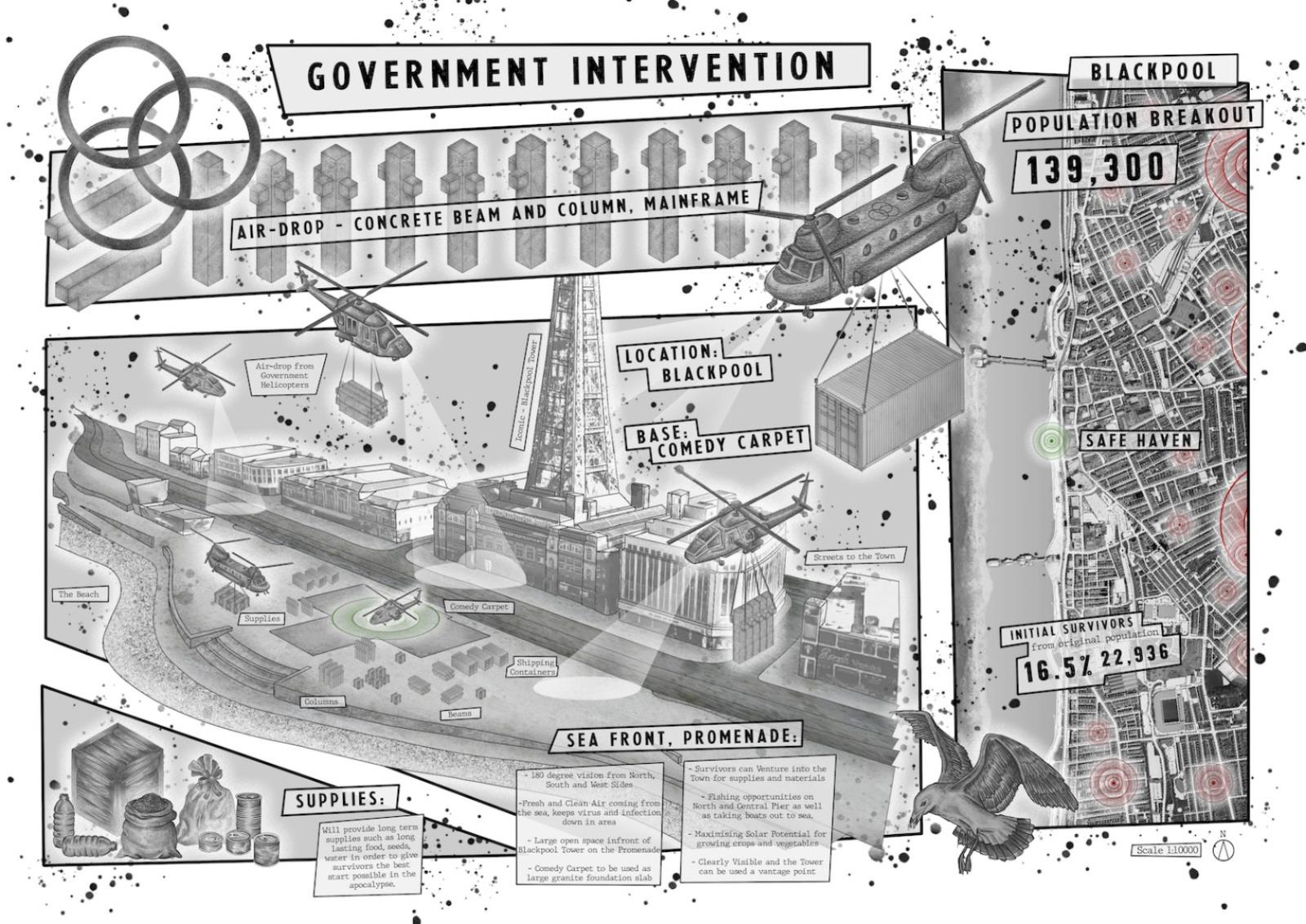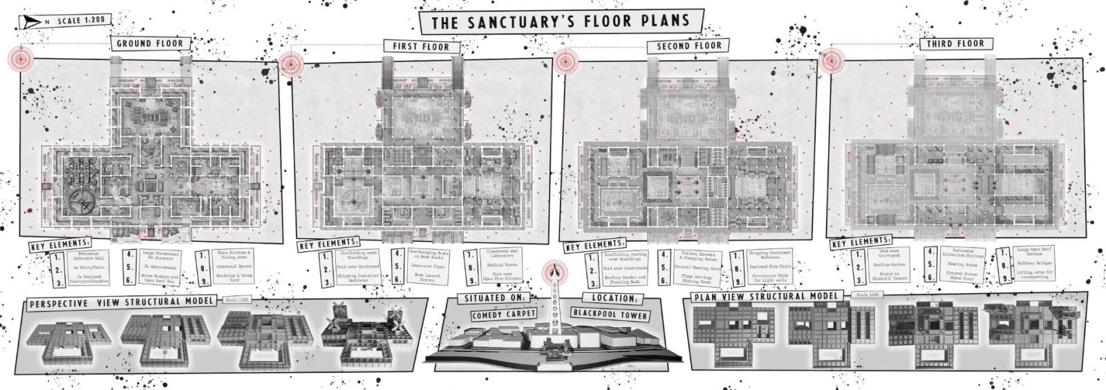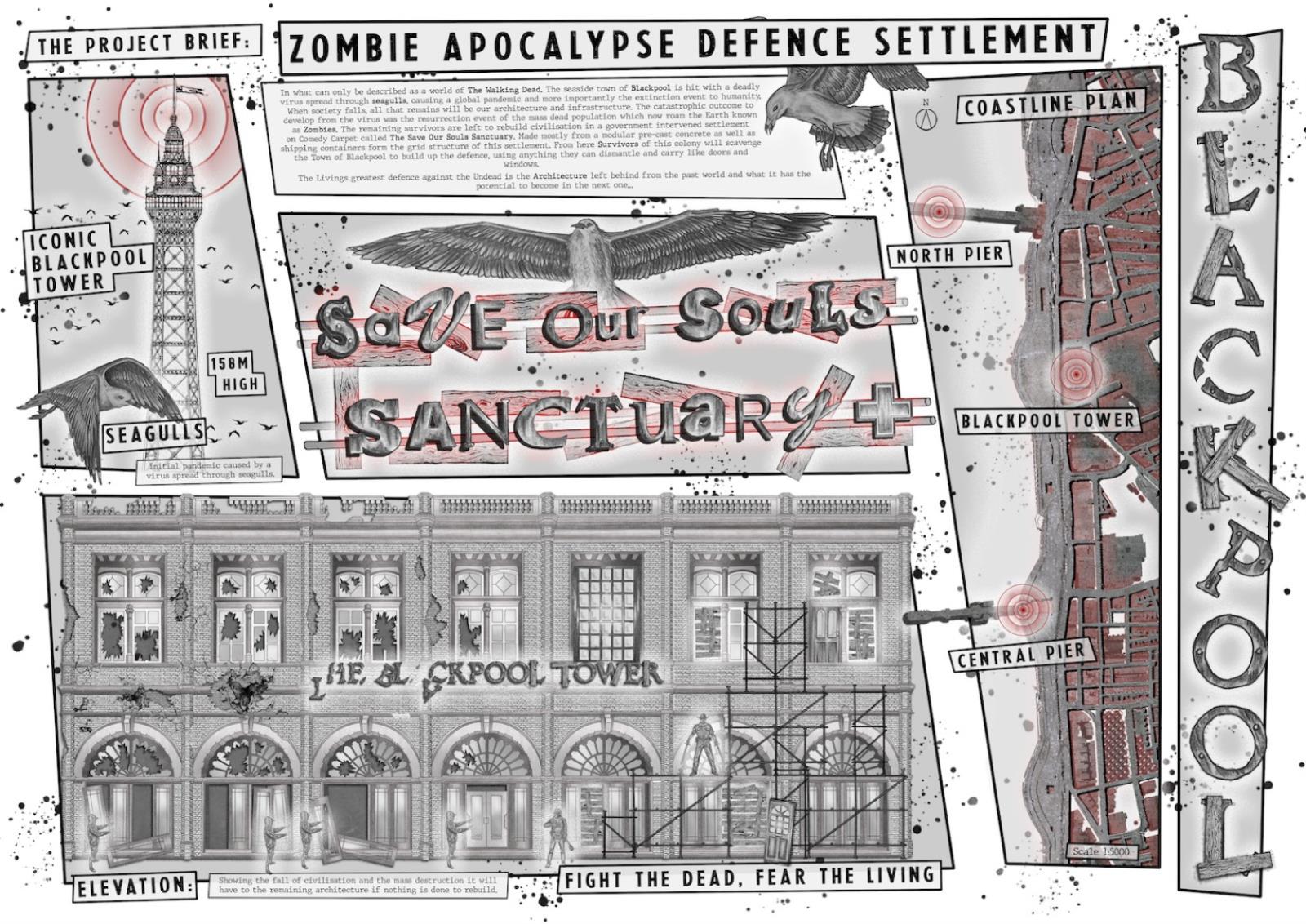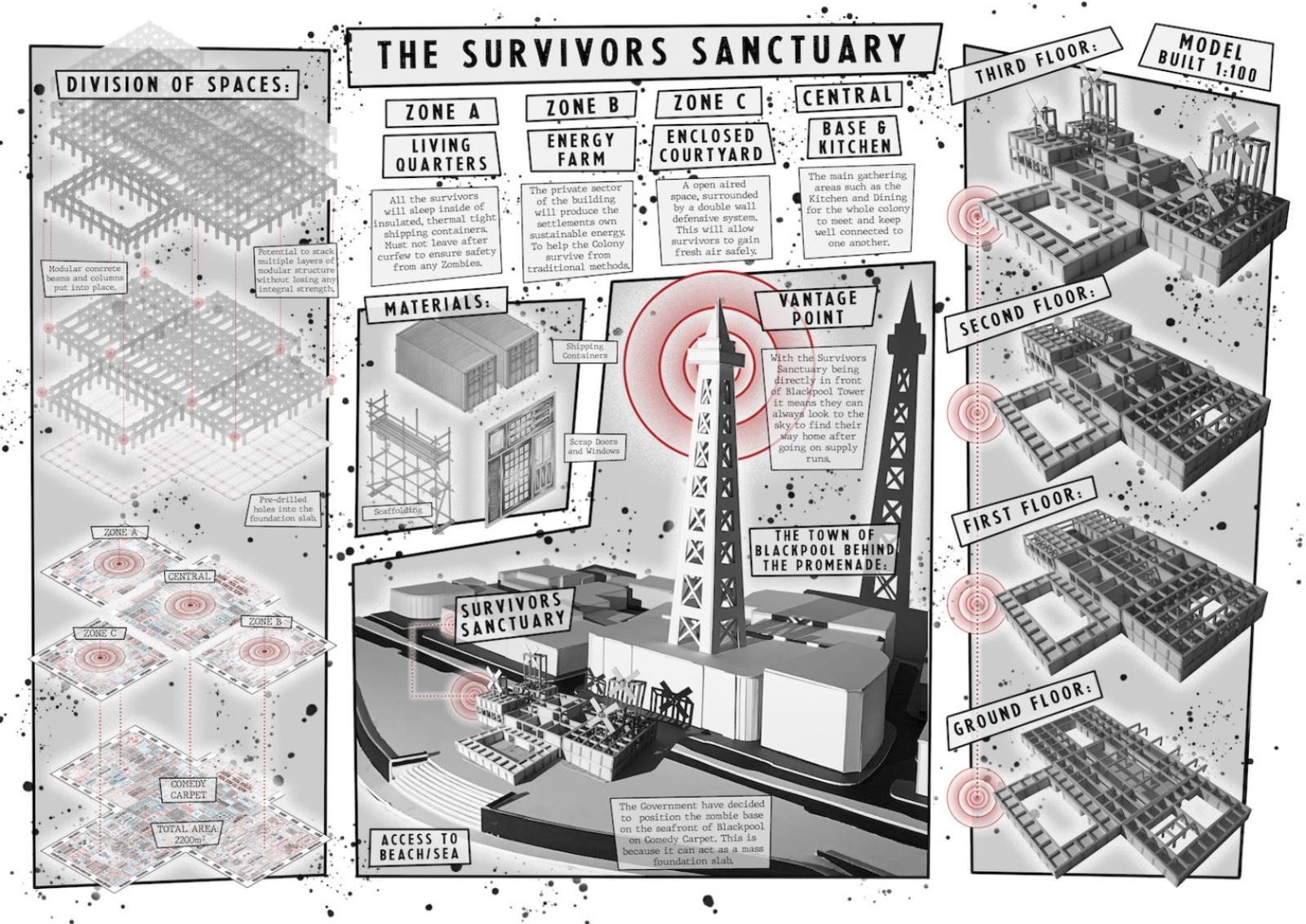 Save Our Souls Sanctuary Part 1 Project 2021 Dominic Stewart Leeds Beckett University | UK In what can only be described as a world of The Walking Dead. the seaside town of Blackpool is hit with a deadly virus spread through seagulls, causing a global pandemic and more importantly the extinction event to humanity. When society falls, all that remains will be our architecture and infrastructure. The catastrophic outcome to develop from the virus was the resurrection event of the mass dead population which now roam the Earth known as Zombies. The remaining survivors are left to rebuild civilisation in a government intervened settlement on Comedy Carpet called The Save Our Souls Sanctuary. Made mostly from modular pre-cast concrete as well as shipping containers to form the grid structure of this settlement. From here Survivors of this colony will scavenge the Town of Blackpool to build up the defence, using anything they can dismantle and carry like doors and windows.The Livings greatest defence against the Undead is the Architecture left behind from the past world and what it has the potential to become in the next one… Tutor(s) Claire Hannibal