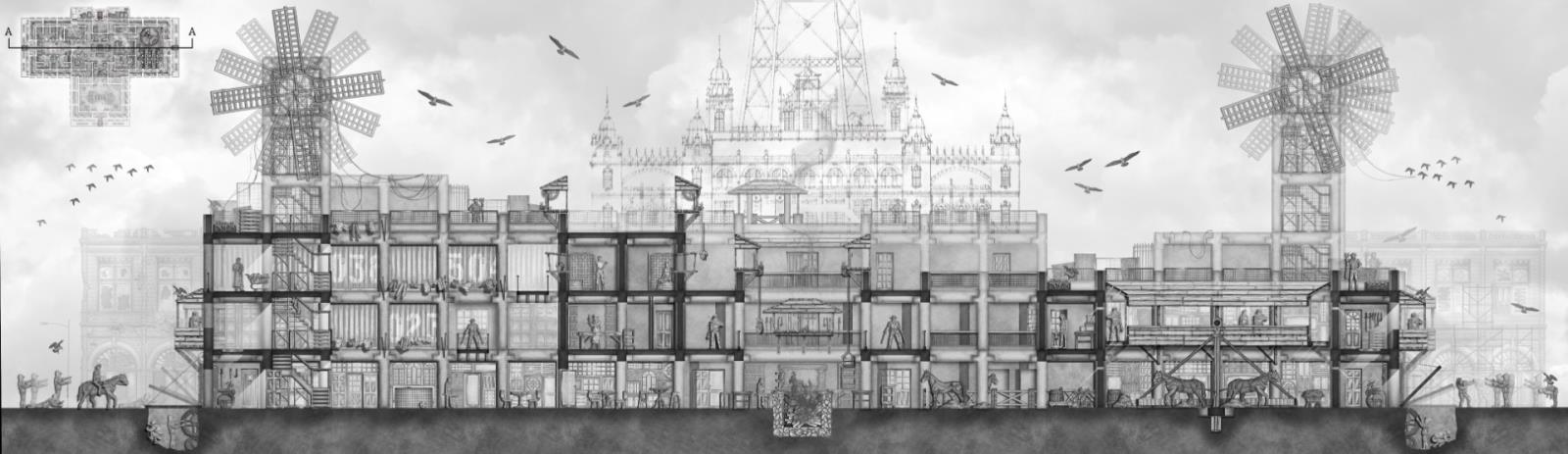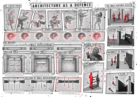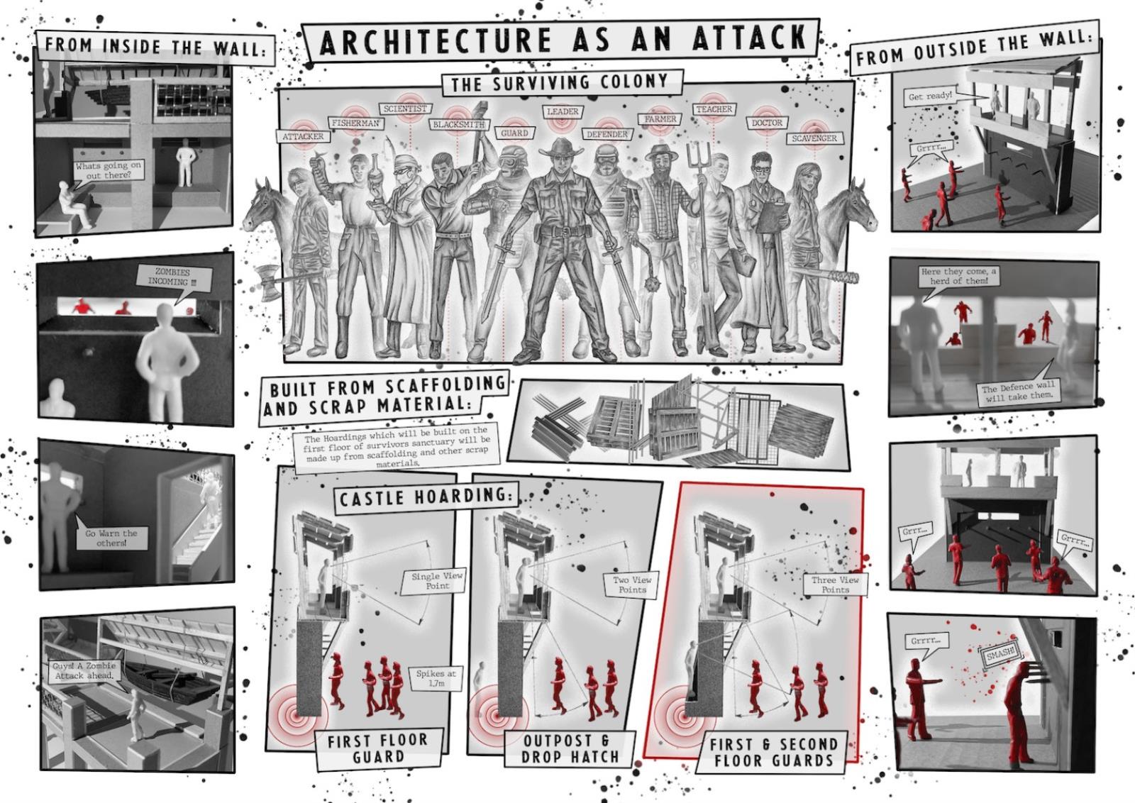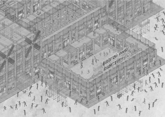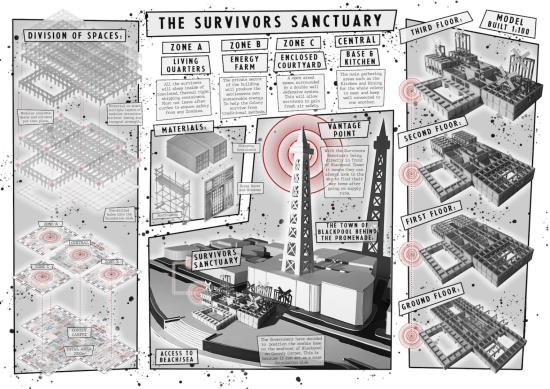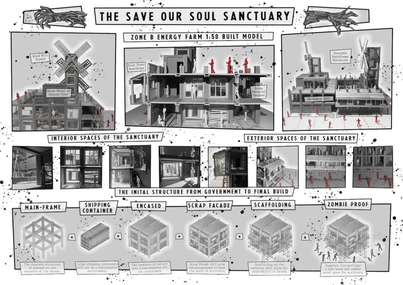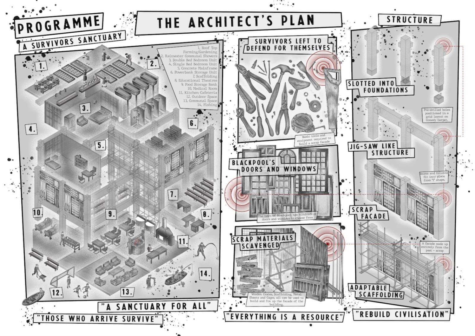 Save Our Souls Sanctuary Part 1 Project 2021 Dominic Stewart Leeds Beckett University | UK In what can only be described as a world of The Walking Dead. the seaside town of Blackpool is hit with a deadly virus spread through seagulls, causing a global pandemic and more importantly the extinction event to humanity. When society falls, all that remains will be our architecture and infrastructure. The catastrophic outcome to develop from the virus was the resurrection event of the mass dead population which now roam the Earth known as Zombies. The remaining survivors are left to rebuild civilisation in a government intervened settlement on Comedy Carpet called The Save Our Souls Sanctuary. Made mostly from modular pre-cast concrete as well as shipping containers to form the grid structure of this settlement. From here Survivors of this colony will scavenge the Town of Blackpool to build up the defence, using anything they can dismantle and carry like doors and windows.The Livings greatest defence against the Undead is the Architecture left behind from the past world and what it has the potential to become in the next one… Tutor(s) Claire Hannibal