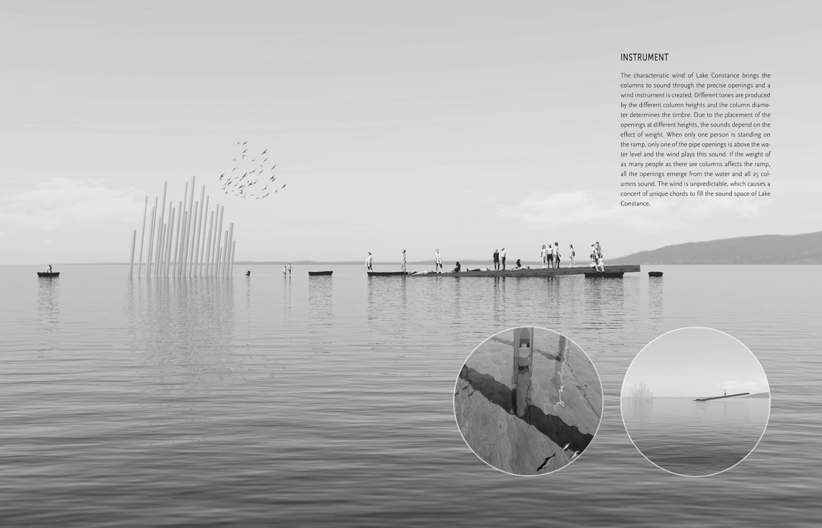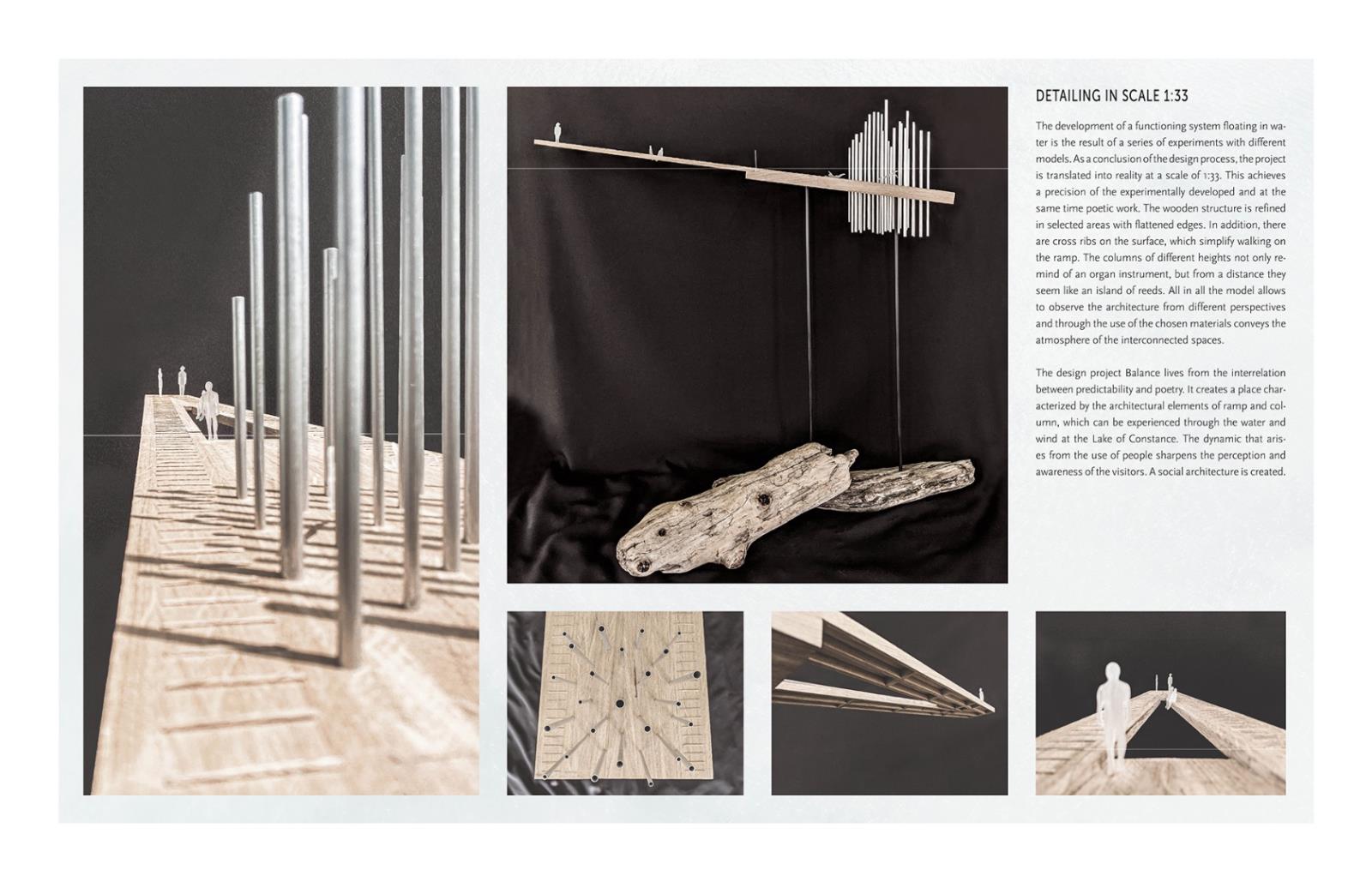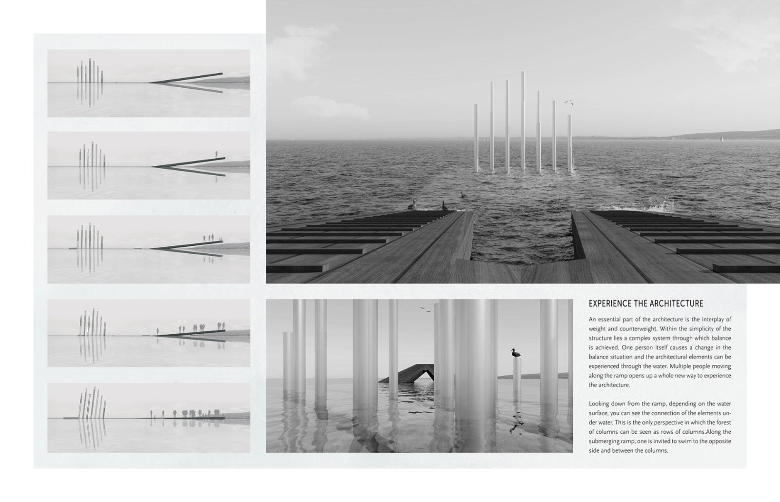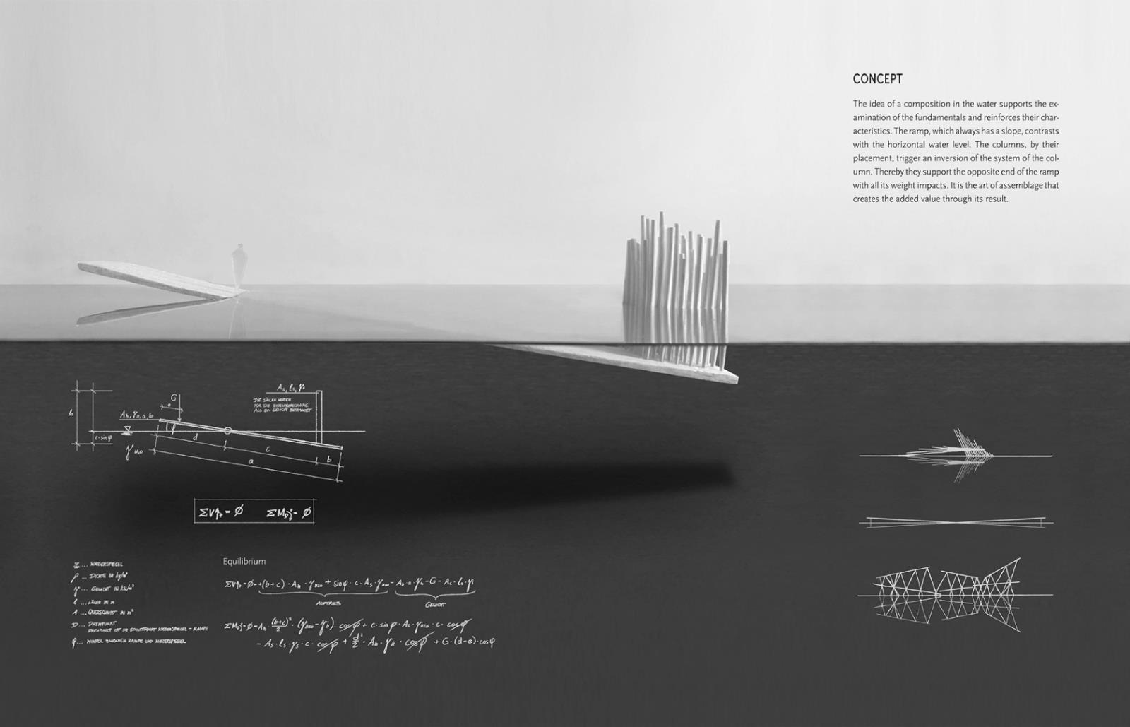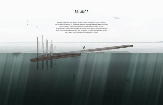 Balance Part 1 Project 2021 Lina Gasperi University of Liechtenstein | Liechtenstein The possibilities and the complex, extensive inventory of architecture in today’s world are often in danger of being forgotten, such as working with fundamental, architectural elements. Similar to curator Rem Koolhaas’ 2014 Venice Biennale, the Fundamentals design studio recognizes the importance and potential of this issue, and focuses on 16 basic architectural elements. In order to be able to examine these to their essence, this work specifically addresses two basic elements. – The ramp and the column. The design task is to create connected spaces that are defined and represented by characteristics of these two elements. The ramp and column should form the DNA of the design project. This task was approached by the methodology of poetic elaboration of a story and simultaneously through calculating and experimenting in the model.The result is a floating composition of a ramp and columns, which balances on the horizon of Lake Constance. Like the reeds, columns rise out of the water, holding by their weight the opposite end of the ramp above its reflection. The inclination contrasts with the horizontal plane of the water. An architecture is created whose essence of the elements can be experienced through water and air and lives from the constant change of time and motion. The predictability generates the precision of poetry, through whose harmony the balance is created. Tutor(s) Bianca Böckle Hugo Dworzak
