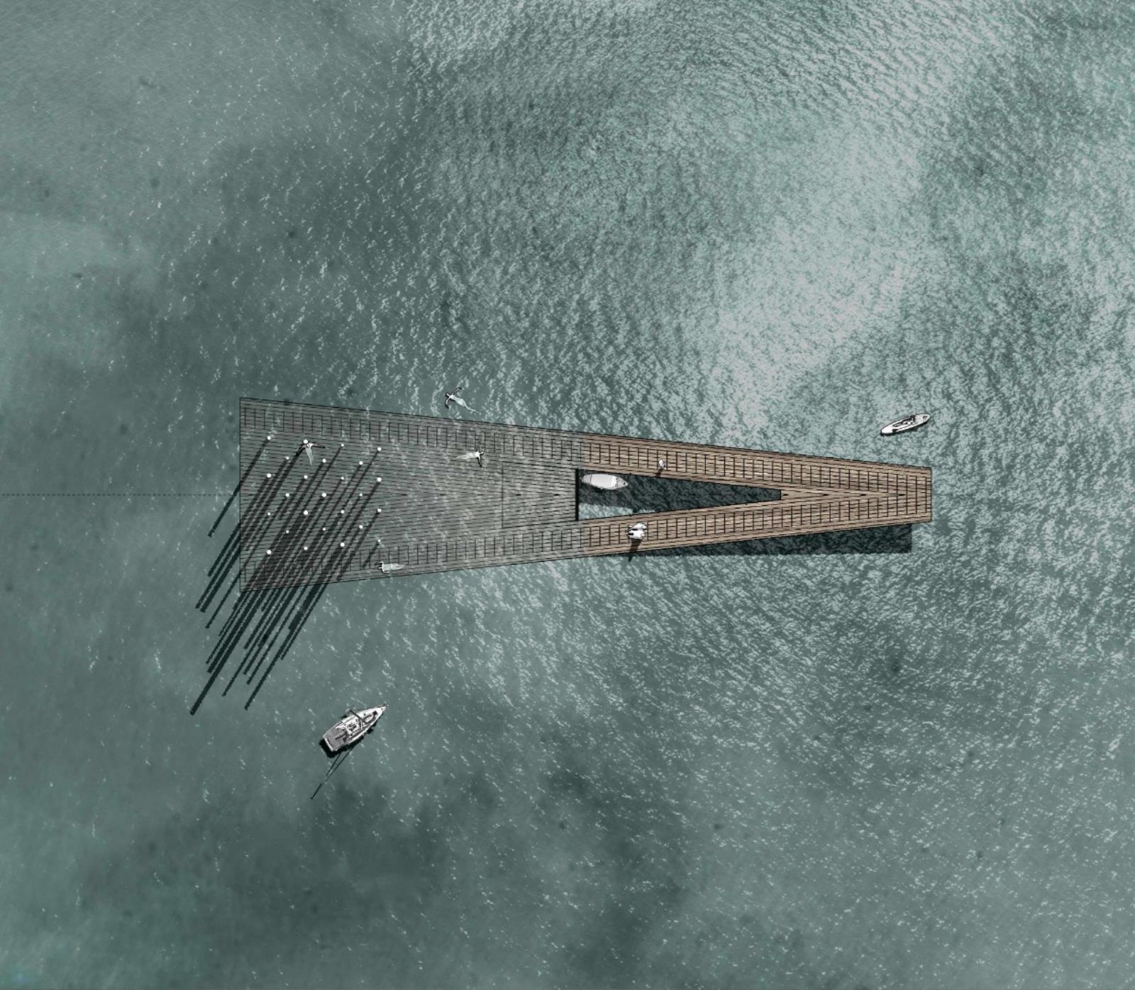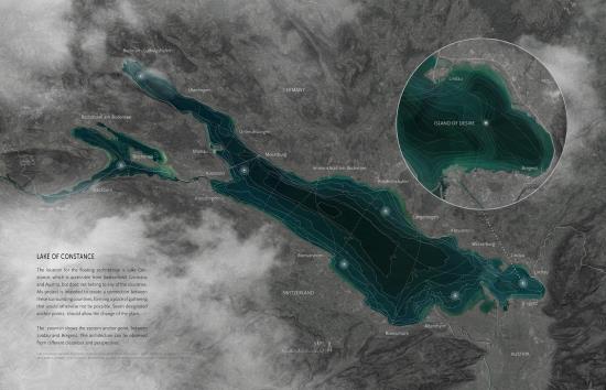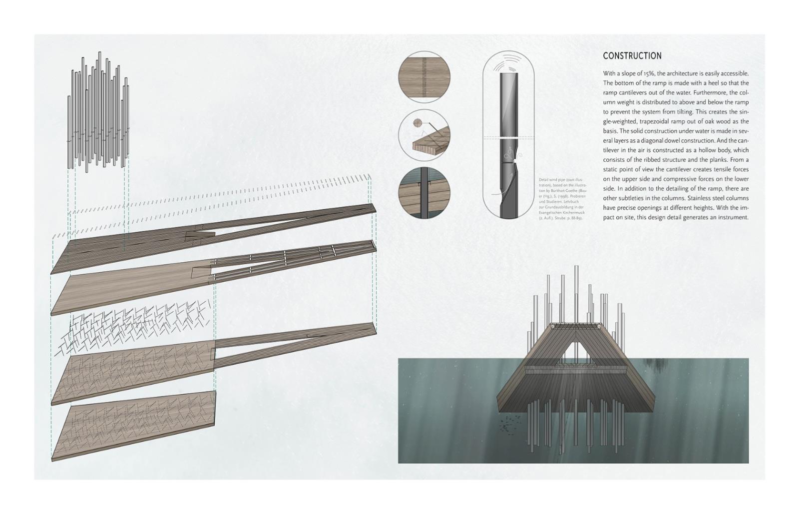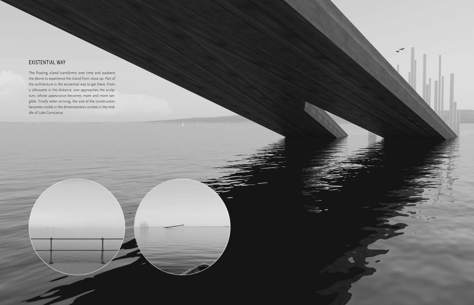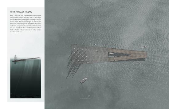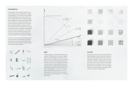 Balance Part 1 Project 2021 Lina Gasperi University of Liechtenstein | Liechtenstein The possibilities and the complex, extensive inventory of architecture in today’s world are often in danger of being forgotten, such as working with fundamental, architectural elements. Similar to curator Rem Koolhaas’ 2014 Venice Biennale, the Fundamentals design studio recognizes the importance and potential of this issue, and focuses on 16 basic architectural elements. In order to be able to examine these to their essence, this work specifically addresses two basic elements. – The ramp and the column. The design task is to create connected spaces that are defined and represented by characteristics of these two elements. The ramp and column should form the DNA of the design project. This task was approached by the methodology of poetic elaboration of a story and simultaneously through calculating and experimenting in the model.The result is a floating composition of a ramp and columns, which balances on the horizon of Lake Constance. Like the reeds, columns rise out of the water, holding by their weight the opposite end of the ramp above its reflection. The inclination contrasts with the horizontal plane of the water. An architecture is created whose essence of the elements can be experienced through water and air and lives from the constant change of time and motion. The predictability generates the precision of poetry, through whose harmony the balance is created. Tutor(s) Bianca Böckle Hugo Dworzak