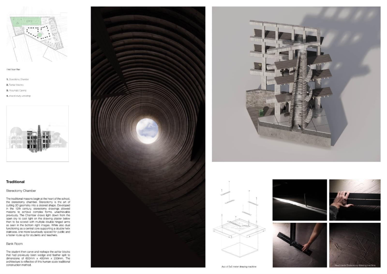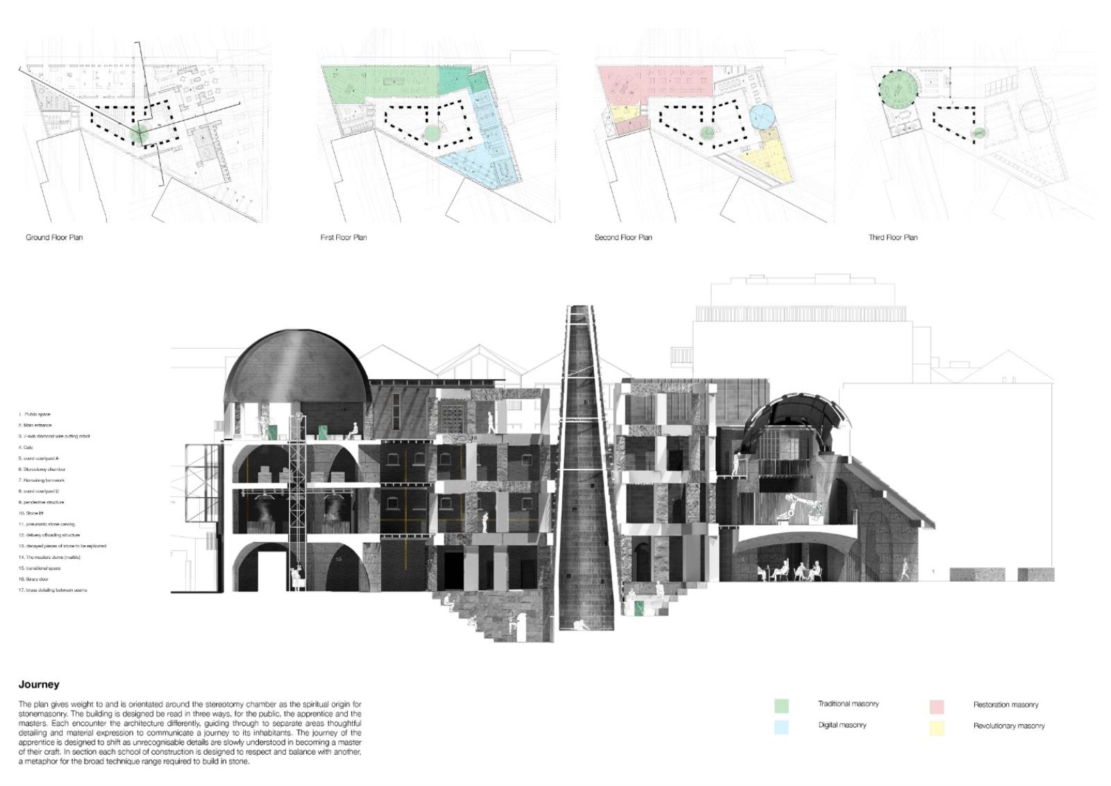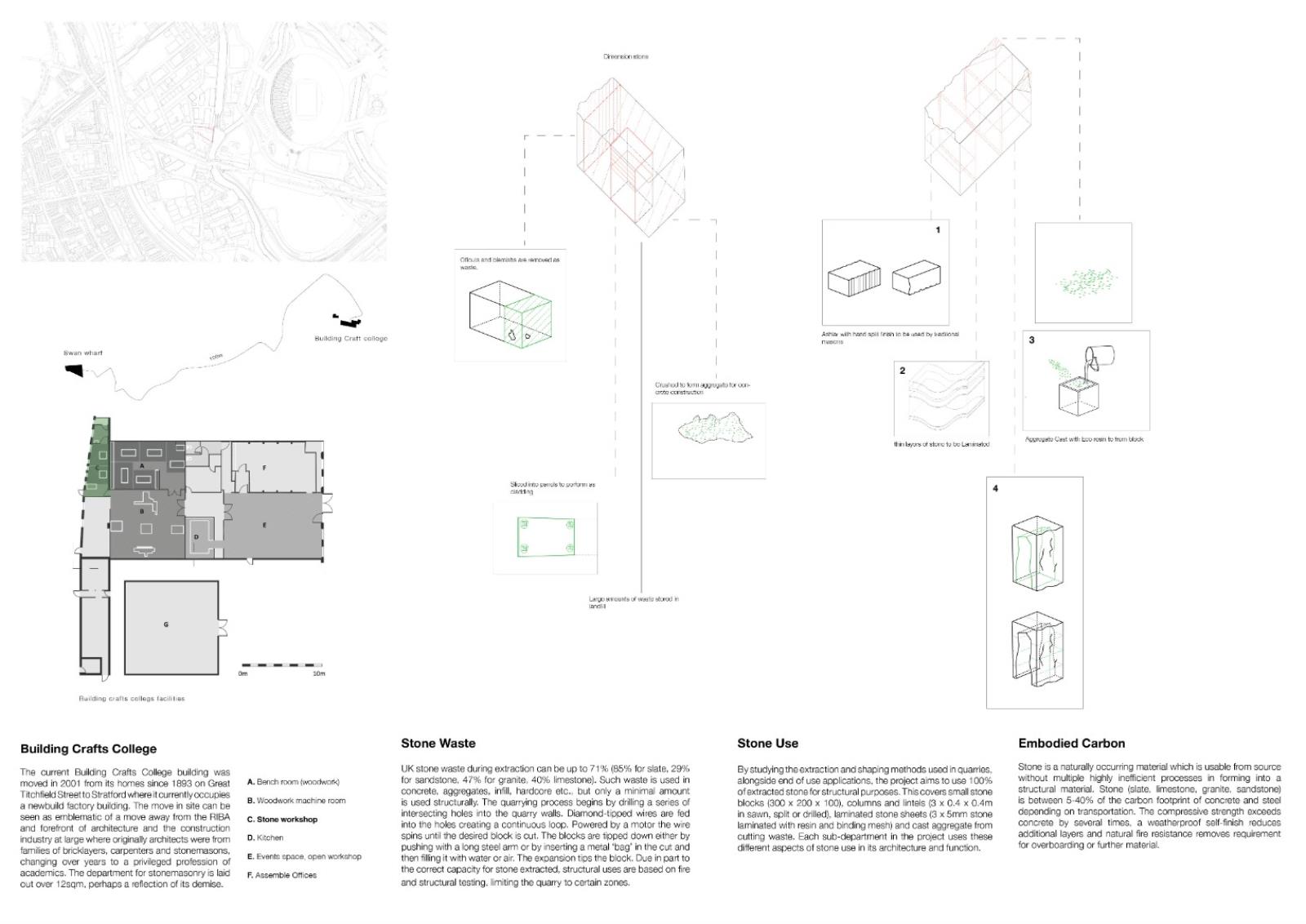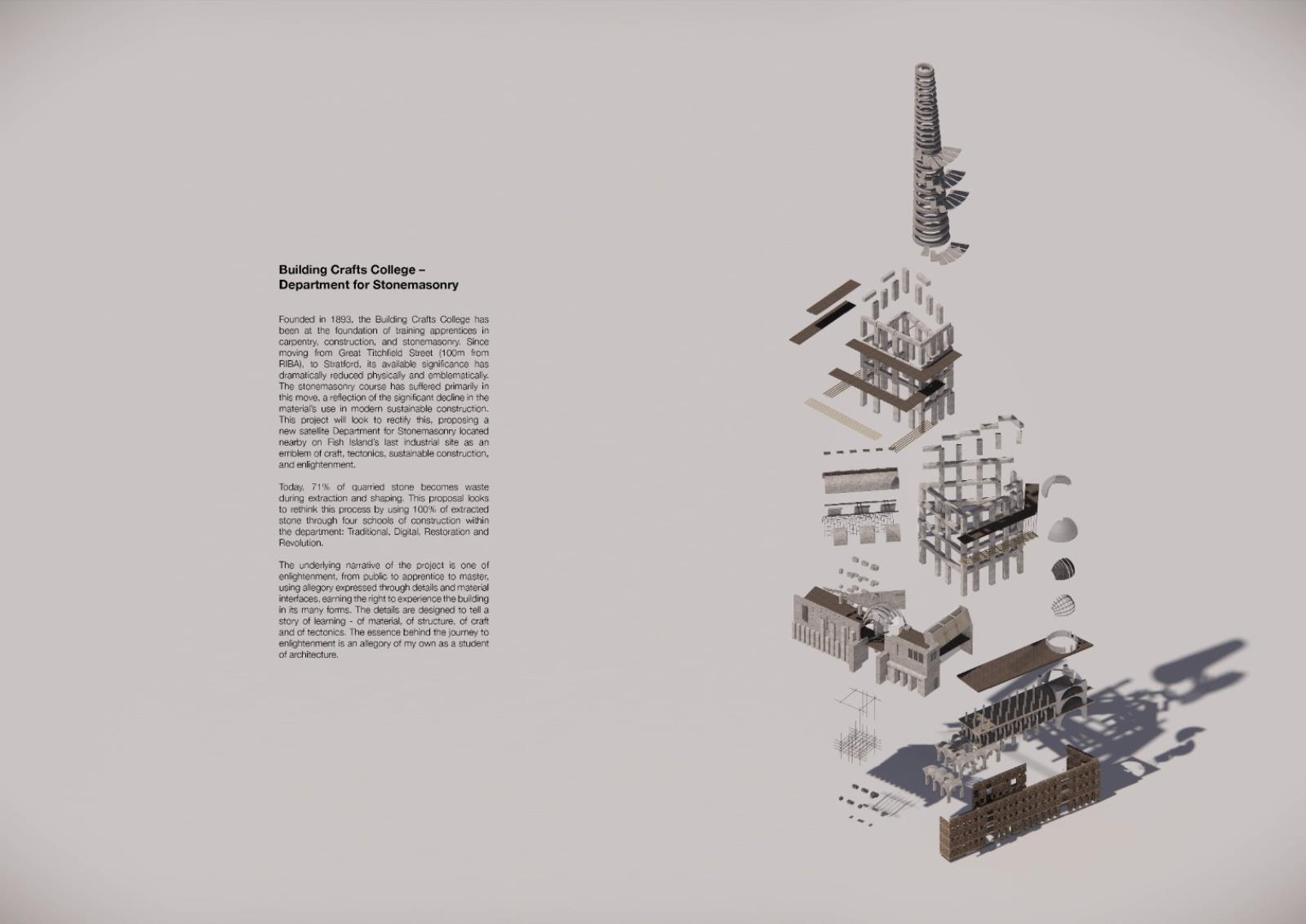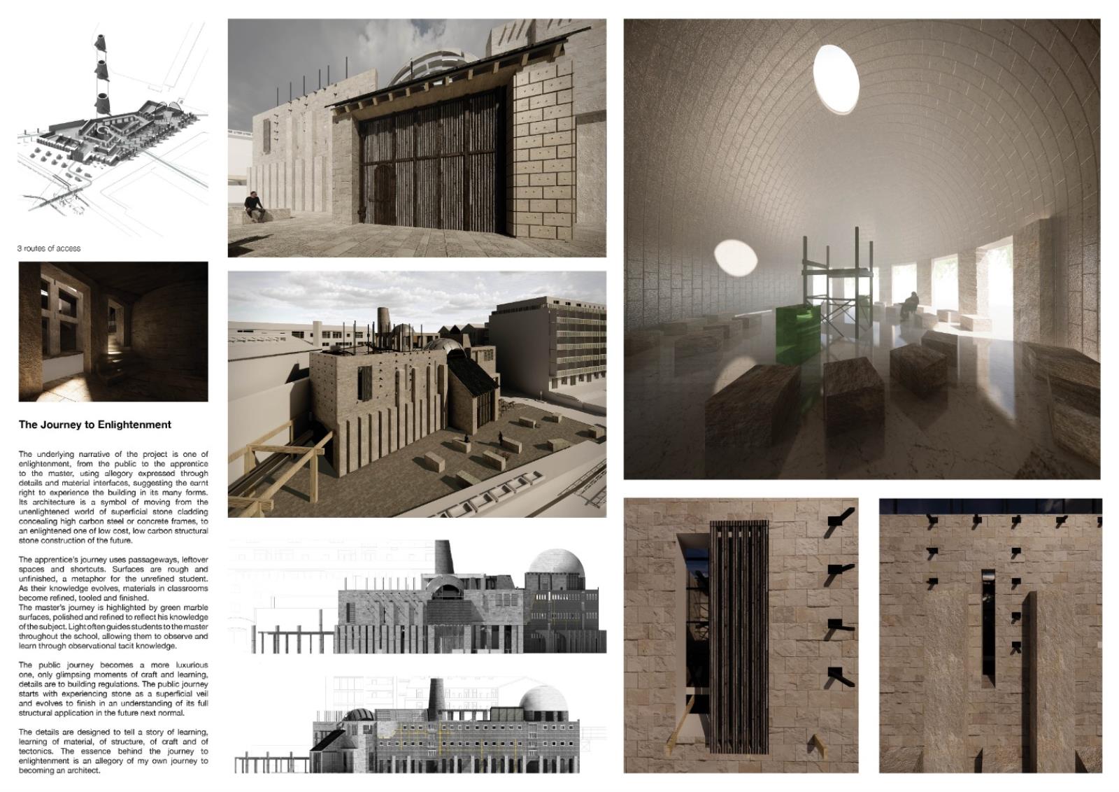 The London School of Stonemasonry Part 1 Project 2021 Jordan Panayi University for the Creative Arts | UK Building Crafts College – Department for StonemasonryFounded in 1893, the Building Crafts College has been at the foundation of training apprentices in carpentry, construction, and stonemasonry. Since moving from Great Titchfield Street (100m from RIBA), to Stratford, its available significance has dramatically reduced physically and emblematically. The stonemasonry course has suffered primarily in this move, a reflection of the significant decline in the material’s use in modern sustainable construction. This project will look to rectify this, proposing a new satellite Department for Stonemasonry located nearby on Fish Island’s last industrial site as an emblem of craft, tectonics, sustainable construction, and enlightenment.Today, 71% of quarried stone becomes waste during extraction and shaping. This proposal looks to rethink this process by using 100% of extracted stone through four schools of construction within the department: Traditional, Digital, Restoration and Revolution.The underlying narrative of the project is one of enlightenment, from public to apprentice to master, using allegory expressed through details and material interfaces, earning the right to experience the building in its many forms. The details are designed to tell a story of learning - of material, of structure, of craft and of tectonics. The essence behind the journey to enlightenment is an allegory of my own as a student of architecture. Tutor(s) Alex Cotterill