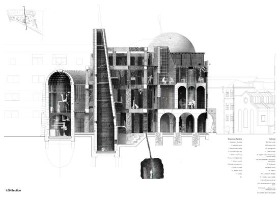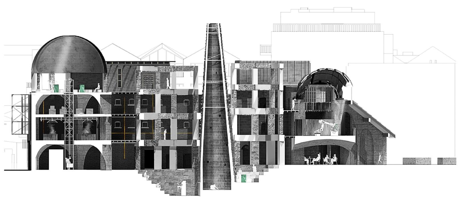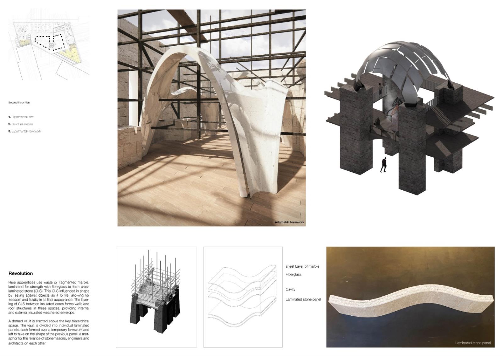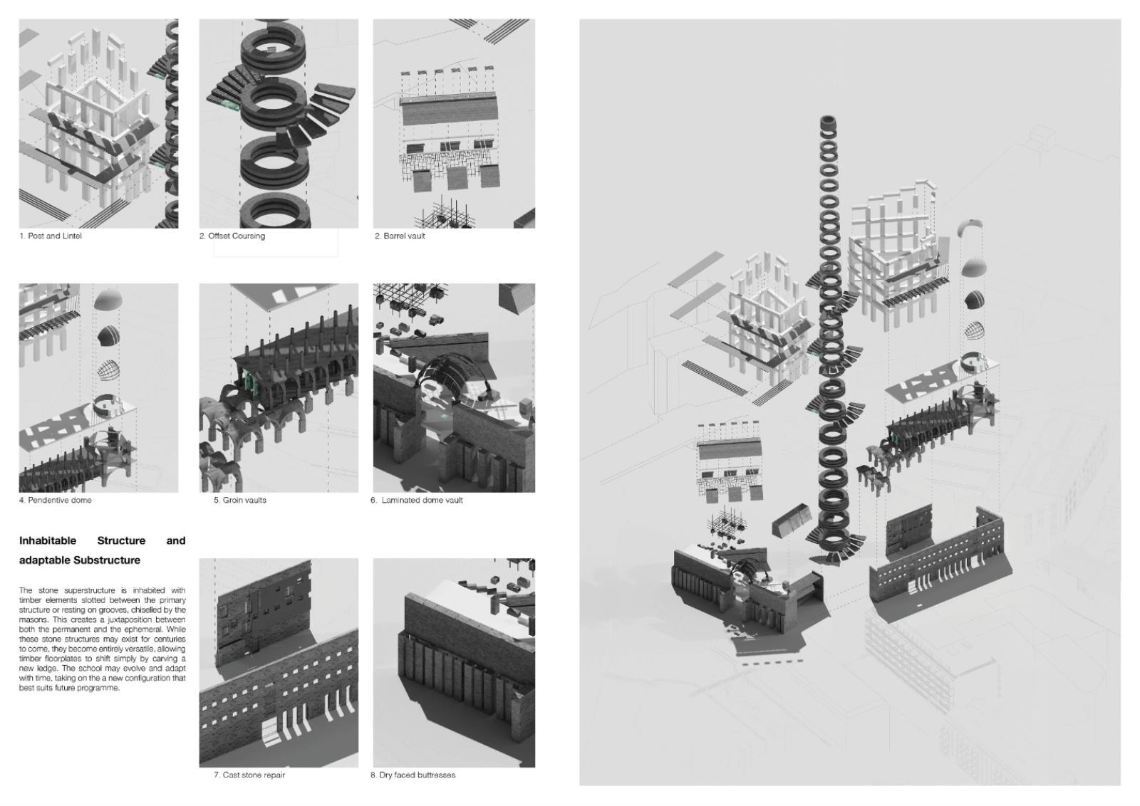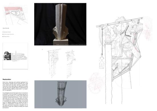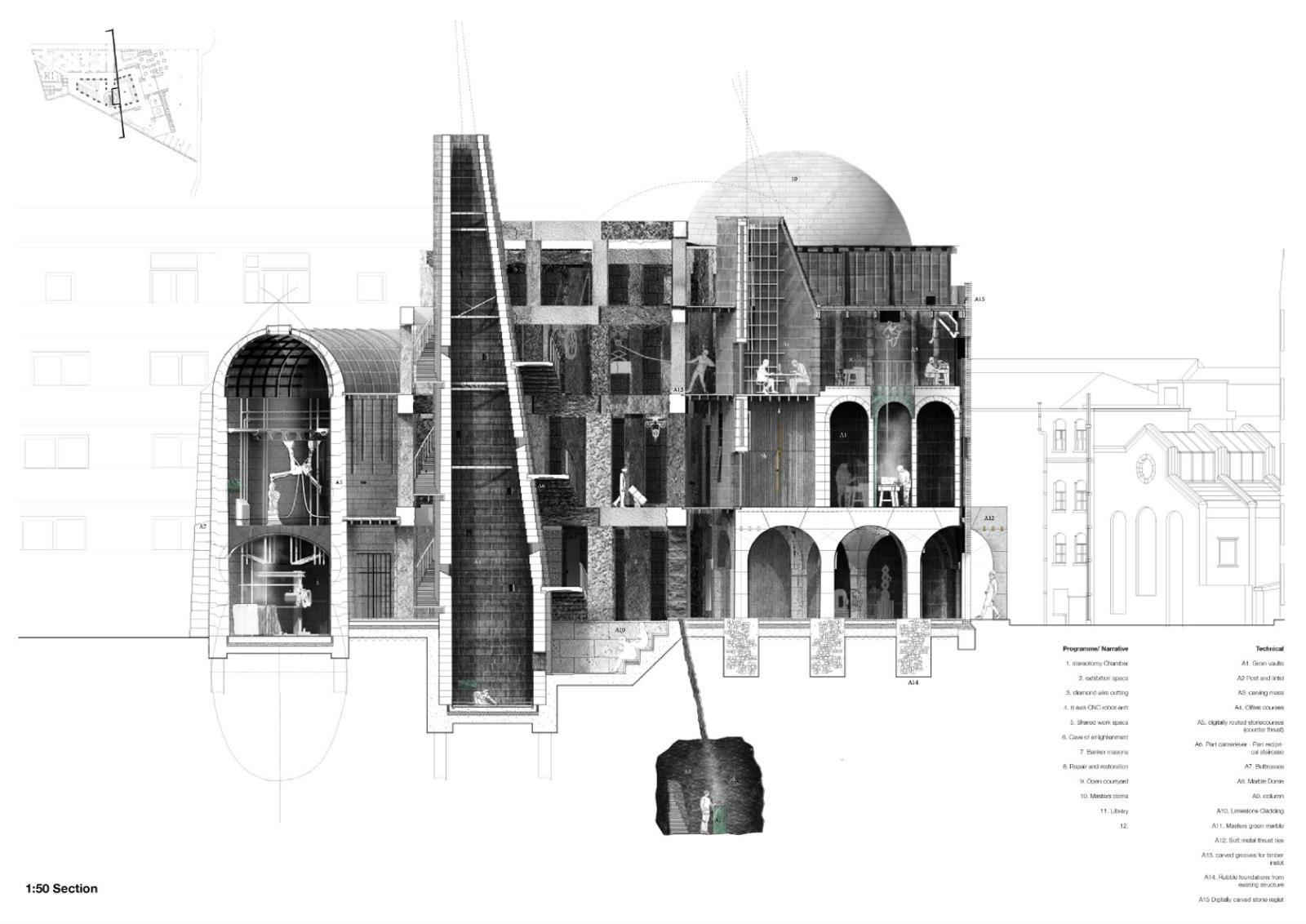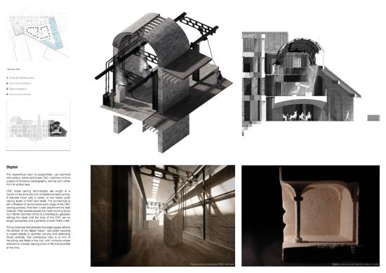 The London School of Stonemasonry Part 1 Project 2021 Jordan Panayi University for the Creative Arts | UK Building Crafts College – Department for StonemasonryFounded in 1893, the Building Crafts College has been at the foundation of training apprentices in carpentry, construction, and stonemasonry. Since moving from Great Titchfield Street (100m from RIBA), to Stratford, its available significance has dramatically reduced physically and emblematically. The stonemasonry course has suffered primarily in this move, a reflection of the significant decline in the material’s use in modern sustainable construction. This project will look to rectify this, proposing a new satellite Department for Stonemasonry located nearby on Fish Island’s last industrial site as an emblem of craft, tectonics, sustainable construction, and enlightenment.Today, 71% of quarried stone becomes waste during extraction and shaping. This proposal looks to rethink this process by using 100% of extracted stone through four schools of construction within the department: Traditional, Digital, Restoration and Revolution.The underlying narrative of the project is one of enlightenment, from public to apprentice to master, using allegory expressed through details and material interfaces, earning the right to experience the building in its many forms. The details are designed to tell a story of learning - of material, of structure, of craft and of tectonics. The essence behind the journey to enlightenment is an allegory of my own as a student of architecture. Tutor(s) Alex Cotterill