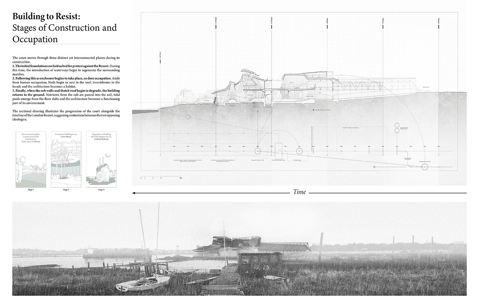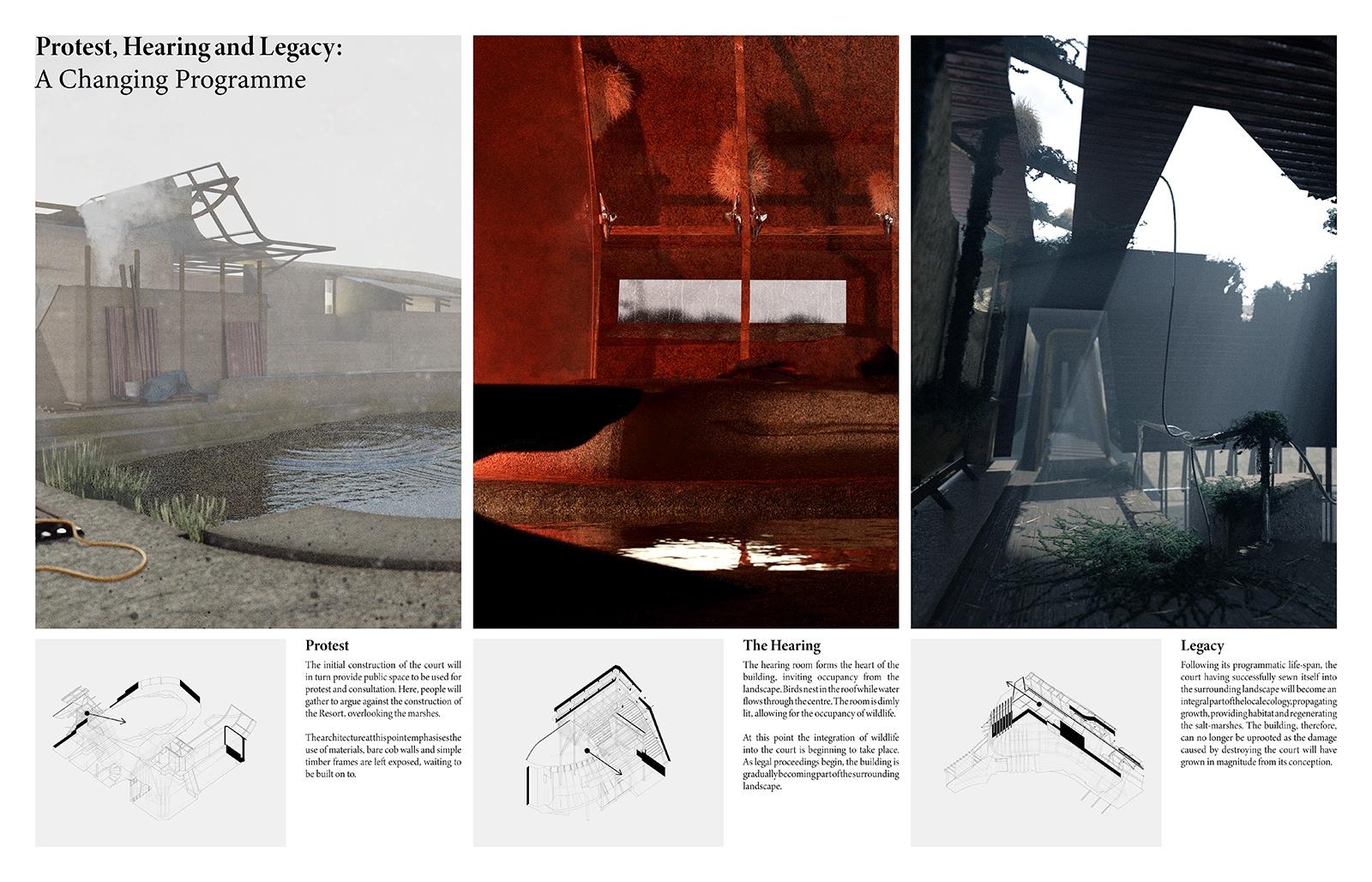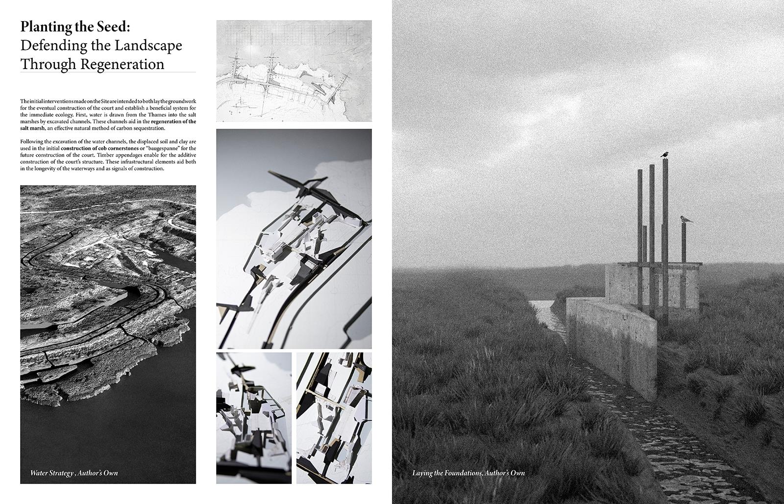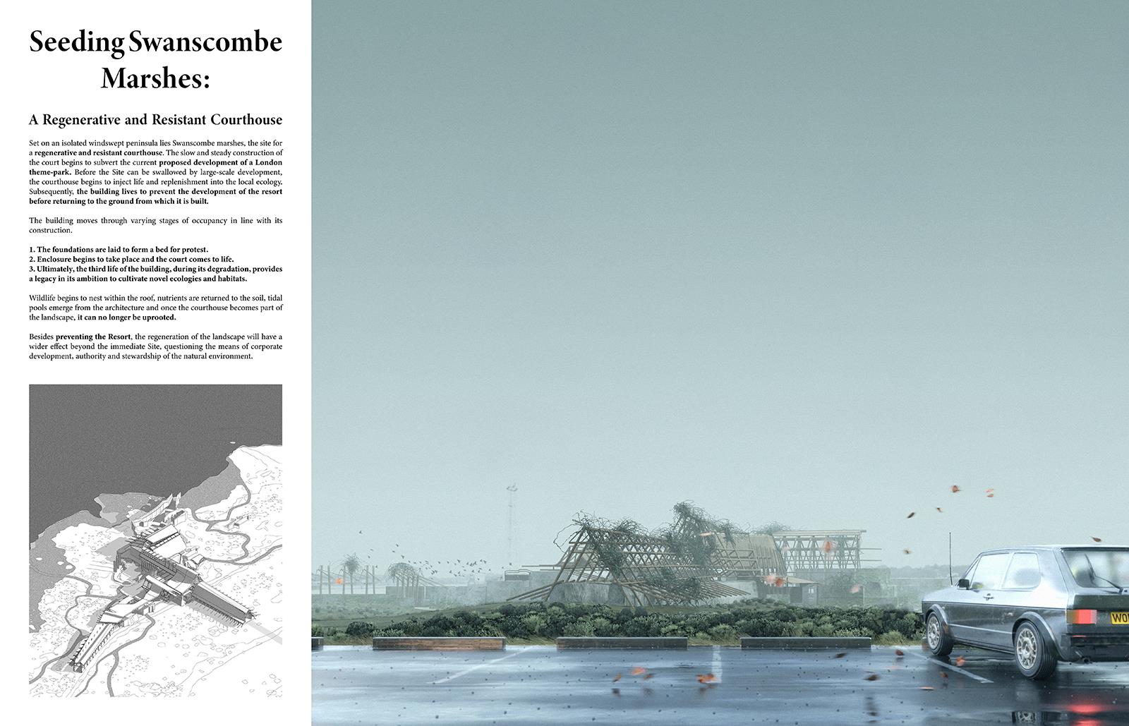 Seeding Swanscombe Marshes Part 1 Project 2021 Ben Foulkes The Bartlett School of Architecture, UCL | UK Set on an isolated windswept peninsula lies Swanscombe marshes, the site for a regenerative and resilient courthouse. The slow and steady construction of the court begins to subvert the current proposed development of a London theme-park. Before the Site can be swallowed by large-scale development, the courthouse begins to inject life and replenishment into the local ecology. Subsequently, the courthouse lives to prevent the development of the resort before returning to the ground from which it is built.The building moves through varying stages of occupancy in line with its construction. The foundations are laid to form a bed for protest. Enclosure begins to take place and the court comes to life. Ultimately, the second life of the building, during its degradation, provides a legacy in its ambition to cultivate novel ecologies and habitats. Wildlife begins to nest within the roof, nutrients are returned to the soil, tidal pools emerge from the architecture and once the courthouse becomes part of the landscape, it can no longer be uprooted.The regeneration of the landscape will have a wider effect beyond the immediate Site, questioning the means of construction, authority and stewardship of the natural environment. Tutor(s) Mr Chee-Kit Lai Douglas Miller