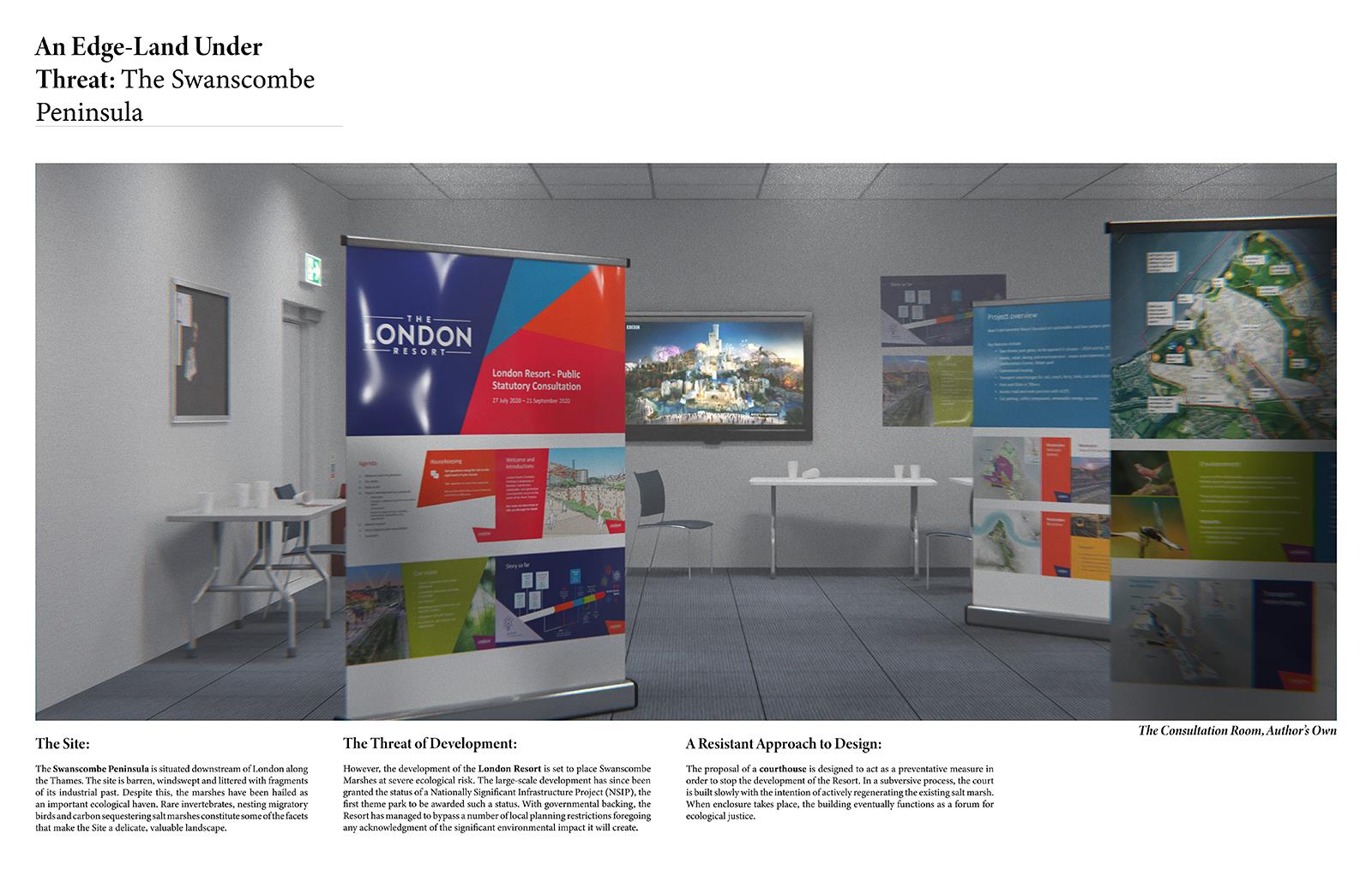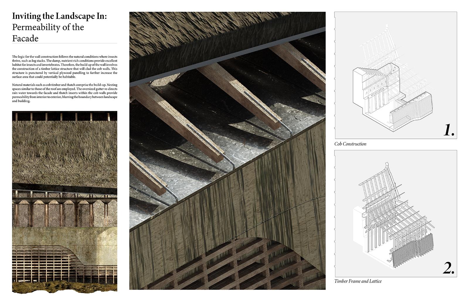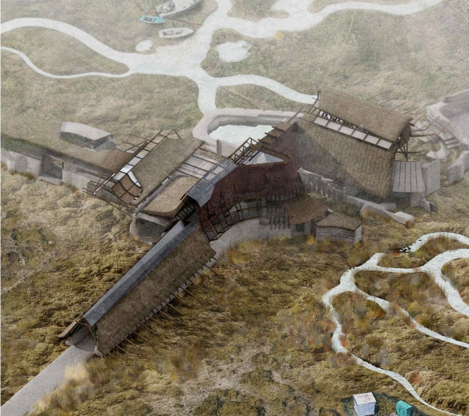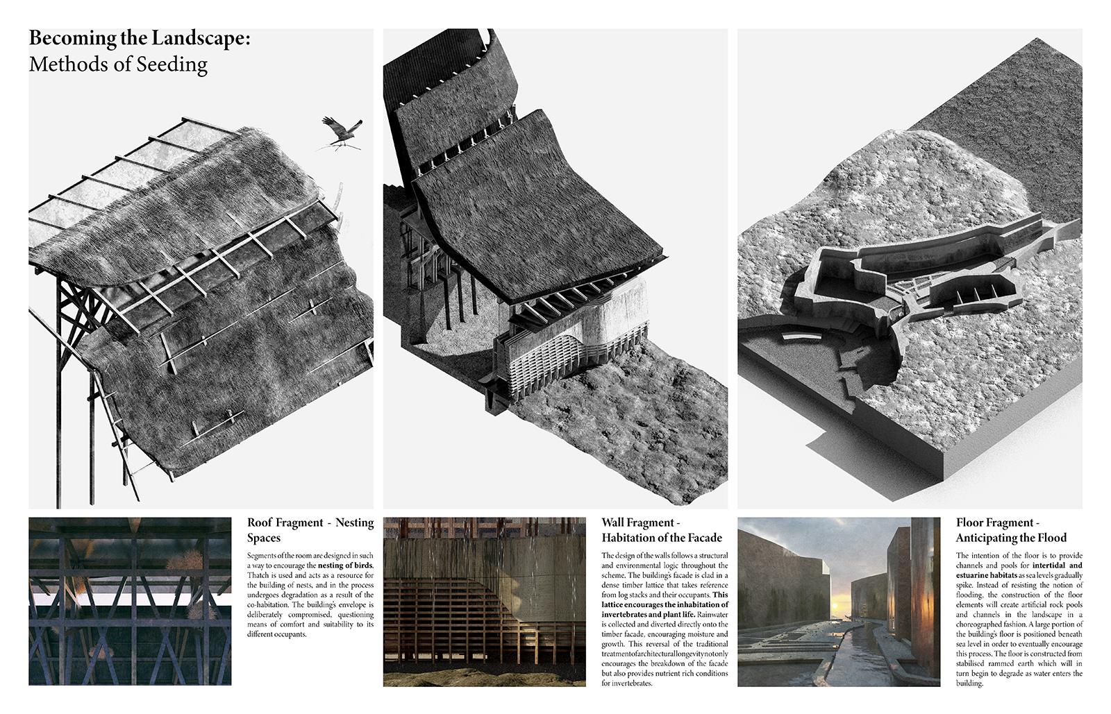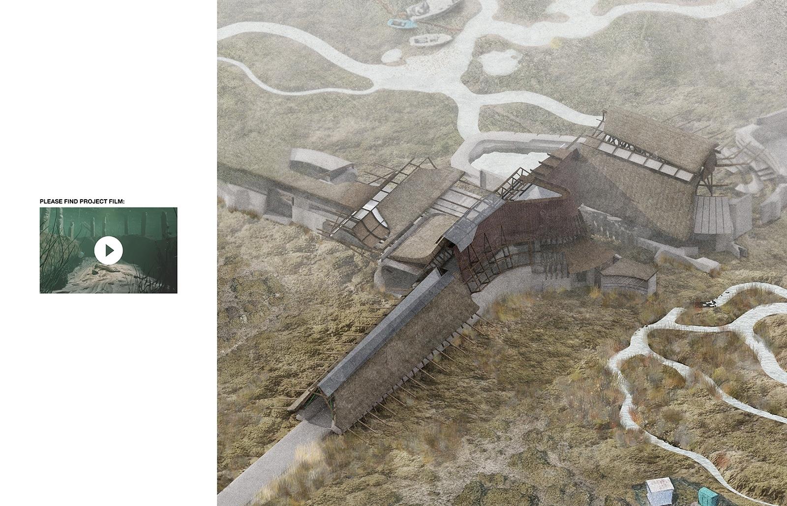 Seeding Swanscombe Marshes Part 1 Project 2021 Ben Foulkes The Bartlett School of Architecture, UCL | UK Set on an isolated windswept peninsula lies Swanscombe marshes, the site for a regenerative and resilient courthouse. The slow and steady construction of the court begins to subvert the current proposed development of a London theme-park. Before the Site can be swallowed by large-scale development, the courthouse begins to inject life and replenishment into the local ecology. Subsequently, the courthouse lives to prevent the development of the resort before returning to the ground from which it is built.The building moves through varying stages of occupancy in line with its construction. The foundations are laid to form a bed for protest. Enclosure begins to take place and the court comes to life. Ultimately, the second life of the building, during its degradation, provides a legacy in its ambition to cultivate novel ecologies and habitats. Wildlife begins to nest within the roof, nutrients are returned to the soil, tidal pools emerge from the architecture and once the courthouse becomes part of the landscape, it can no longer be uprooted.The regeneration of the landscape will have a wider effect beyond the immediate Site, questioning the means of construction, authority and stewardship of the natural environment. Tutor(s) Mr Chee-Kit Lai Douglas Miller