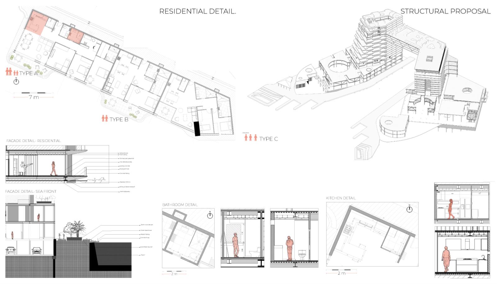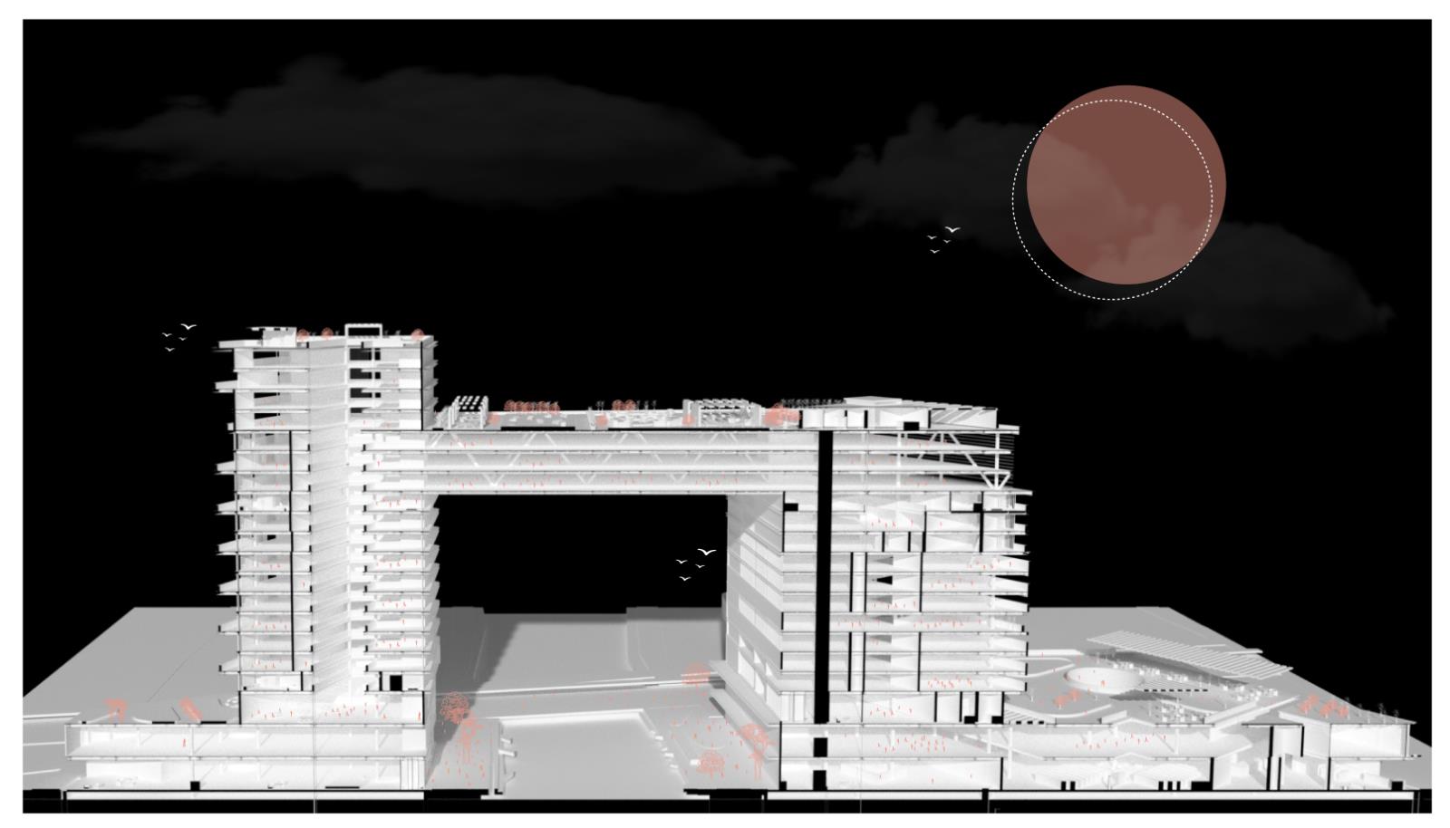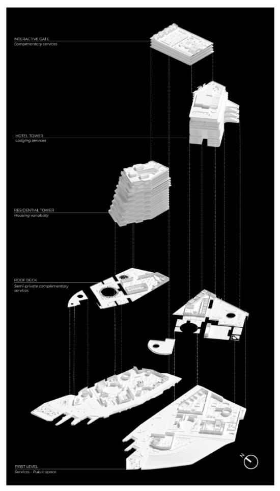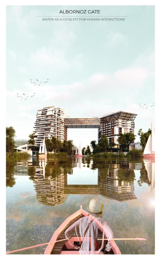 21st Century Habitat Part 1 Project 2021 Esteban Cuellar GutierrezMaria Molina Ruiz Pontifical Xavierian University | Colombia This project is situated in the city of Cartagena, Colombia. Since colonial times, the protective responsibility of the fortresses detonated a physical rupture of the territory, affecting dynamics of implantation and urbanization. Currently, the city is clearly segmented, generating social inequality and territorial disconnection. Furthermore, the ecological deterioration due to geographic modification in response to population growth and the growth of industrial and port areas results in a city that is slowly drowning into its own difficulties.Climate change and sea live rise are threatening to practically disappear this World Heritage City in the next fifty years. Hence, we start our proposal from a new urban plan that restructures the development of the city for the future, where hydric bodies and green areas are the structural elements. These results into a new citadel that appropriates water as the base of mobilization and human interactions.Inside this citadel, the project ends in a block development. Our choice responds architecturally and volumetrically as the gate of the citadel, a system of buildings that carry out a centre of cultural and touristic activities, all based on the importance of water being the catalyst of human interactions. Tutor(s) Ioannis Aris Alexiou