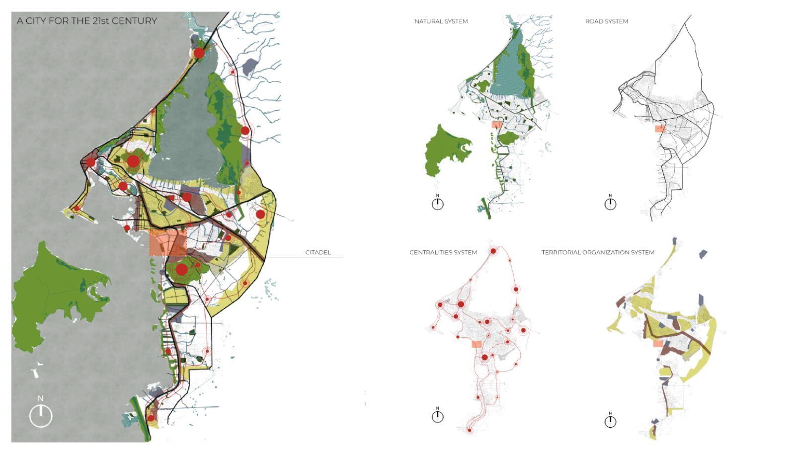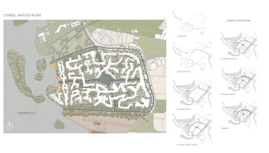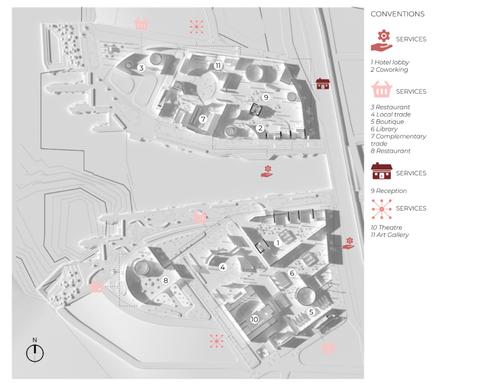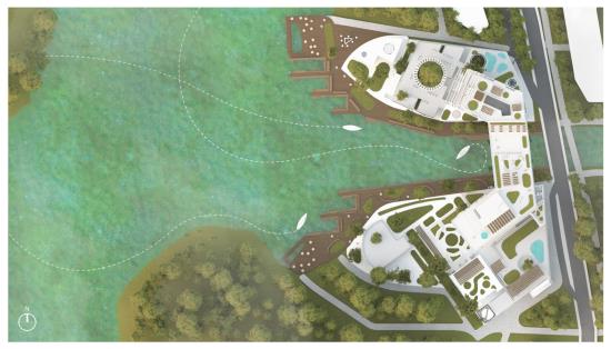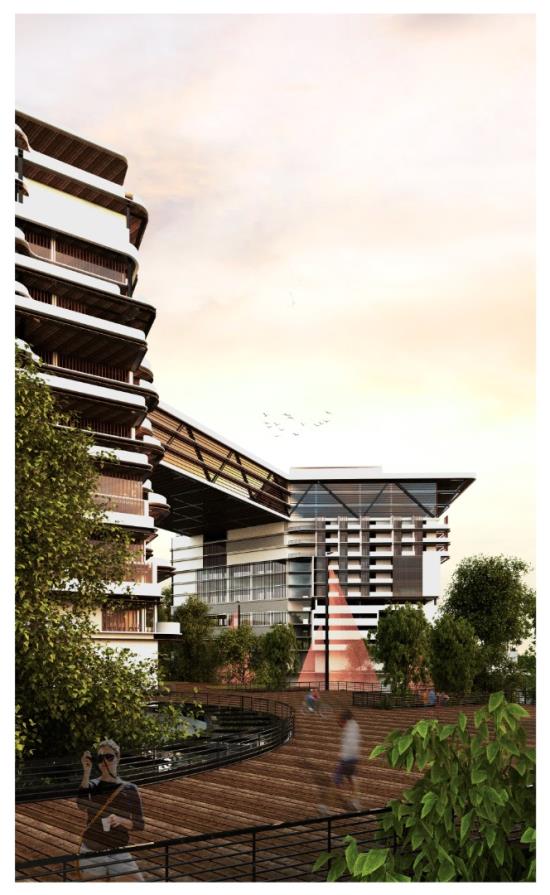 21st Century Habitat Part 1 Project 2021 Esteban Cuellar GutierrezMaria Molina Ruiz Pontifical Xavierian University | Colombia This project is situated in the city of Cartagena, Colombia. Since colonial times, the protective responsibility of the fortresses detonated a physical rupture of the territory, affecting dynamics of implantation and urbanization. Currently, the city is clearly segmented, generating social inequality and territorial disconnection. Furthermore, the ecological deterioration due to geographic modification in response to population growth and the growth of industrial and port areas results in a city that is slowly drowning into its own difficulties.Climate change and sea live rise are threatening to practically disappear this World Heritage City in the next fifty years. Hence, we start our proposal from a new urban plan that restructures the development of the city for the future, where hydric bodies and green areas are the structural elements. These results into a new citadel that appropriates water as the base of mobilization and human interactions.Inside this citadel, the project ends in a block development. Our choice responds architecturally and volumetrically as the gate of the citadel, a system of buildings that carry out a centre of cultural and touristic activities, all based on the importance of water being the catalyst of human interactions. Tutor(s) Ioannis Aris Alexiou
