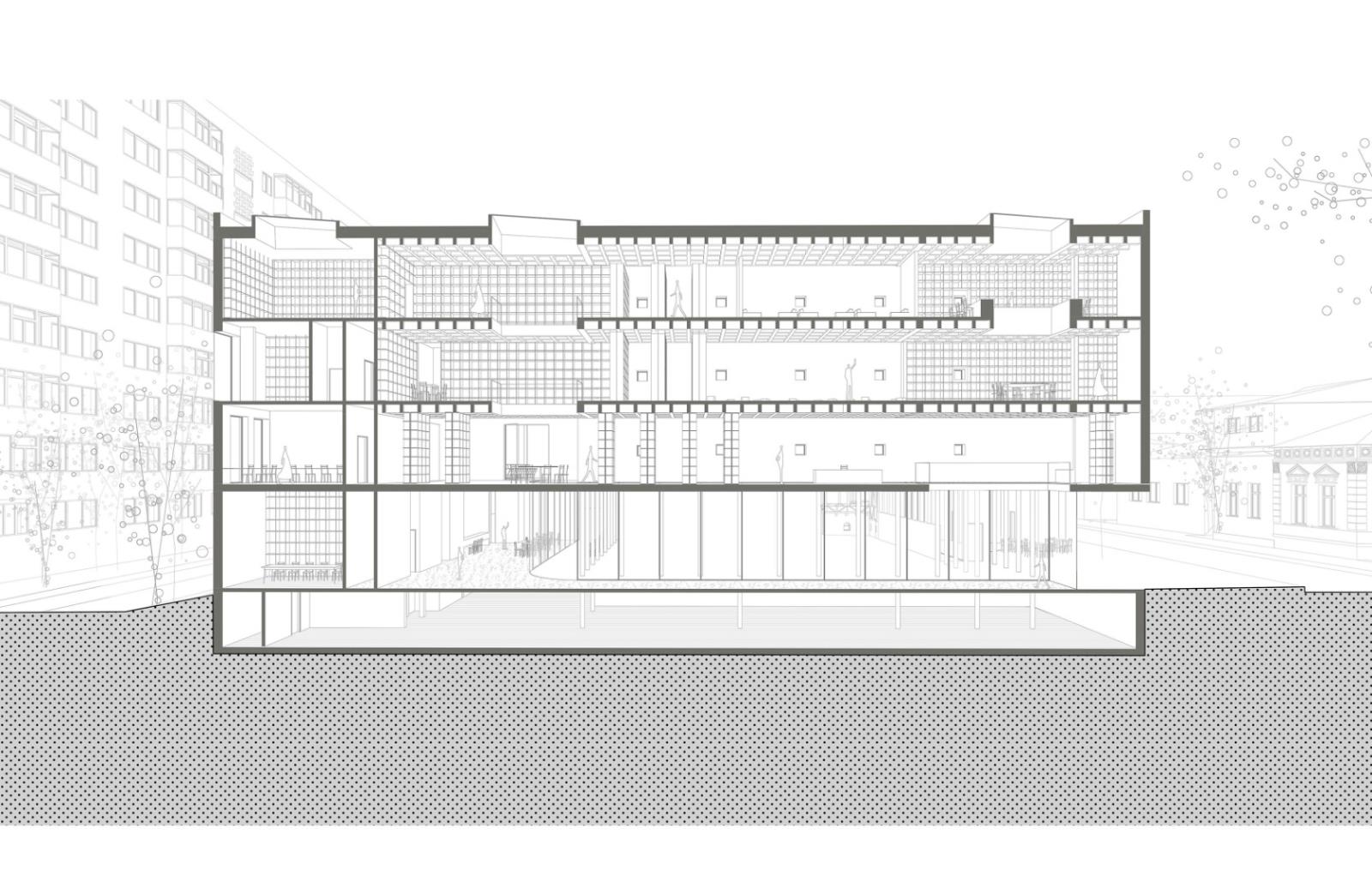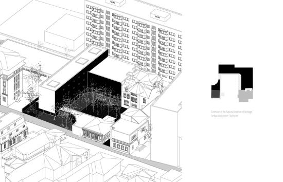 Extension of the National Institute of Heritage, Bucharest Part 1 Project 2021 Adrian Andrei Ion Mincu University of Architecture and Urbanism | Romania I wanted to integrate through the proposed volume the patrimony house into the project and the project into the actual tissue. Therefore, I proposed joining a volume with proportions taken from the Targovet house, that would make the transition between the existent and the new. This transition continues on the porch with portic from the house, which developes and gives the perimetral limits on 3 sides the garden generated by my project.The relation with the street is made through a plaza that includes the caffe which is joined to the blind wall of the Targovet house, the principal acces in the building and the acces to the garden intermediate by the portico. In the interior of the ensemble, the functions with the highest public characteristics are placed at the ground level of the building, in great relation with the garden, implicit with the Targovet House. The National Institute of Heritage archive is situated in the first part of the volume, being developed on 3 levels, and on the other hand, the multifunctional sala, the workshops and temporary accommodation are placed in the volume that is joined with the blind wall in the back of the site. UPDATED TEST Tutor(s) Andra Panait