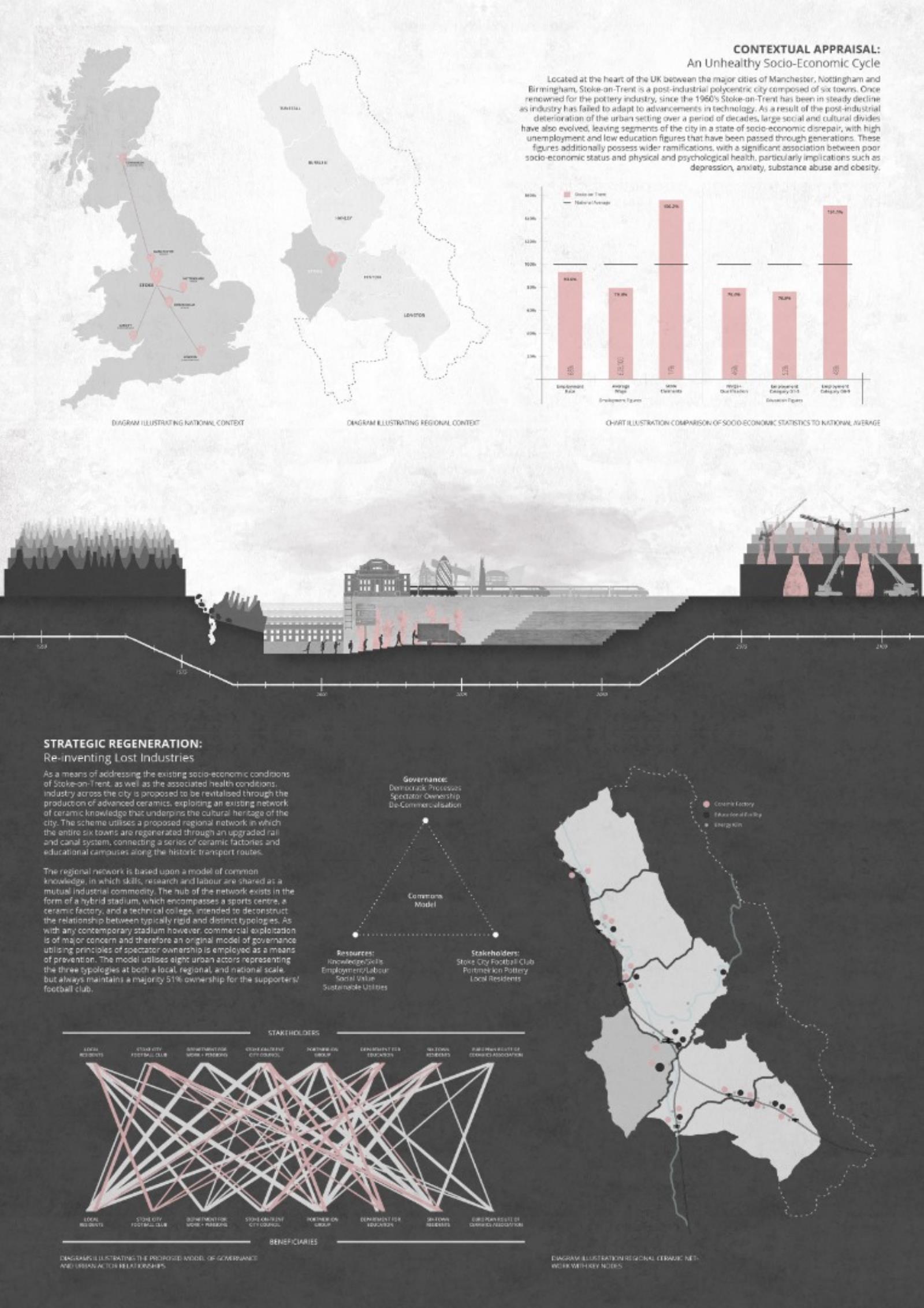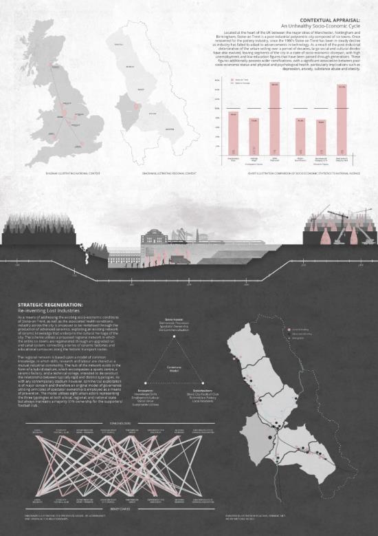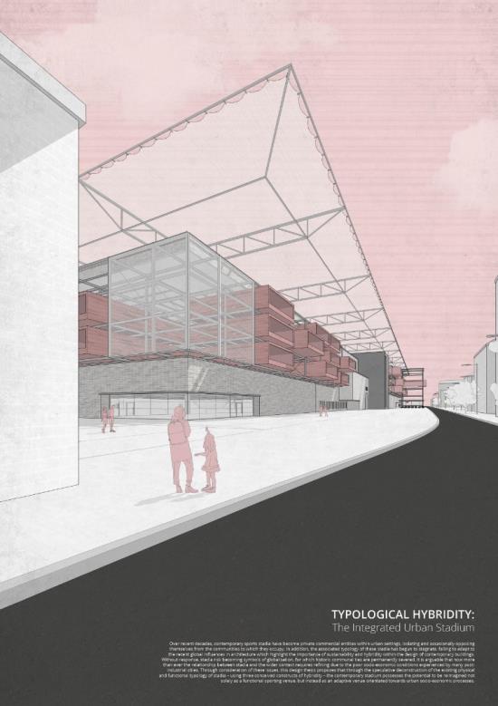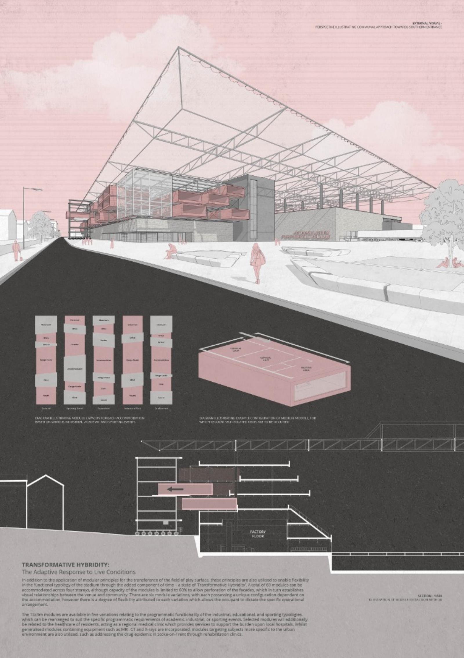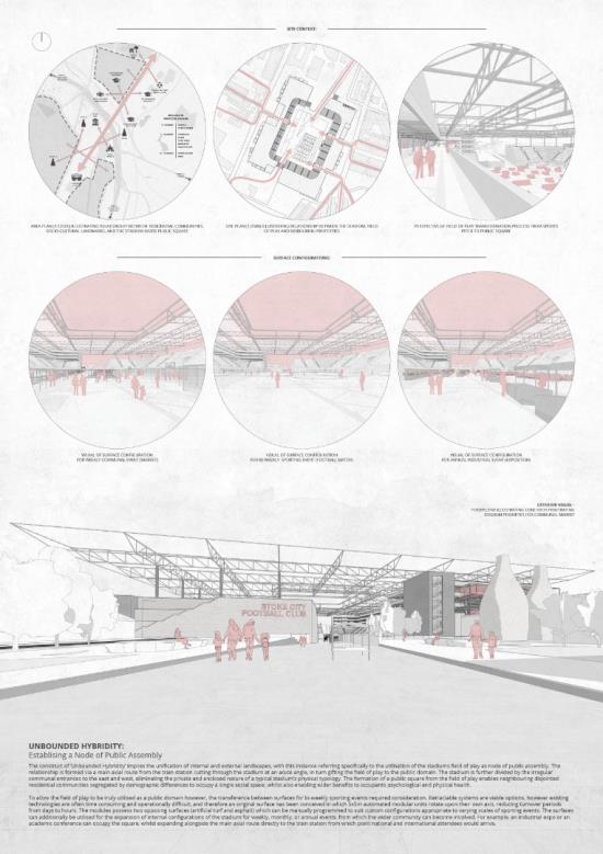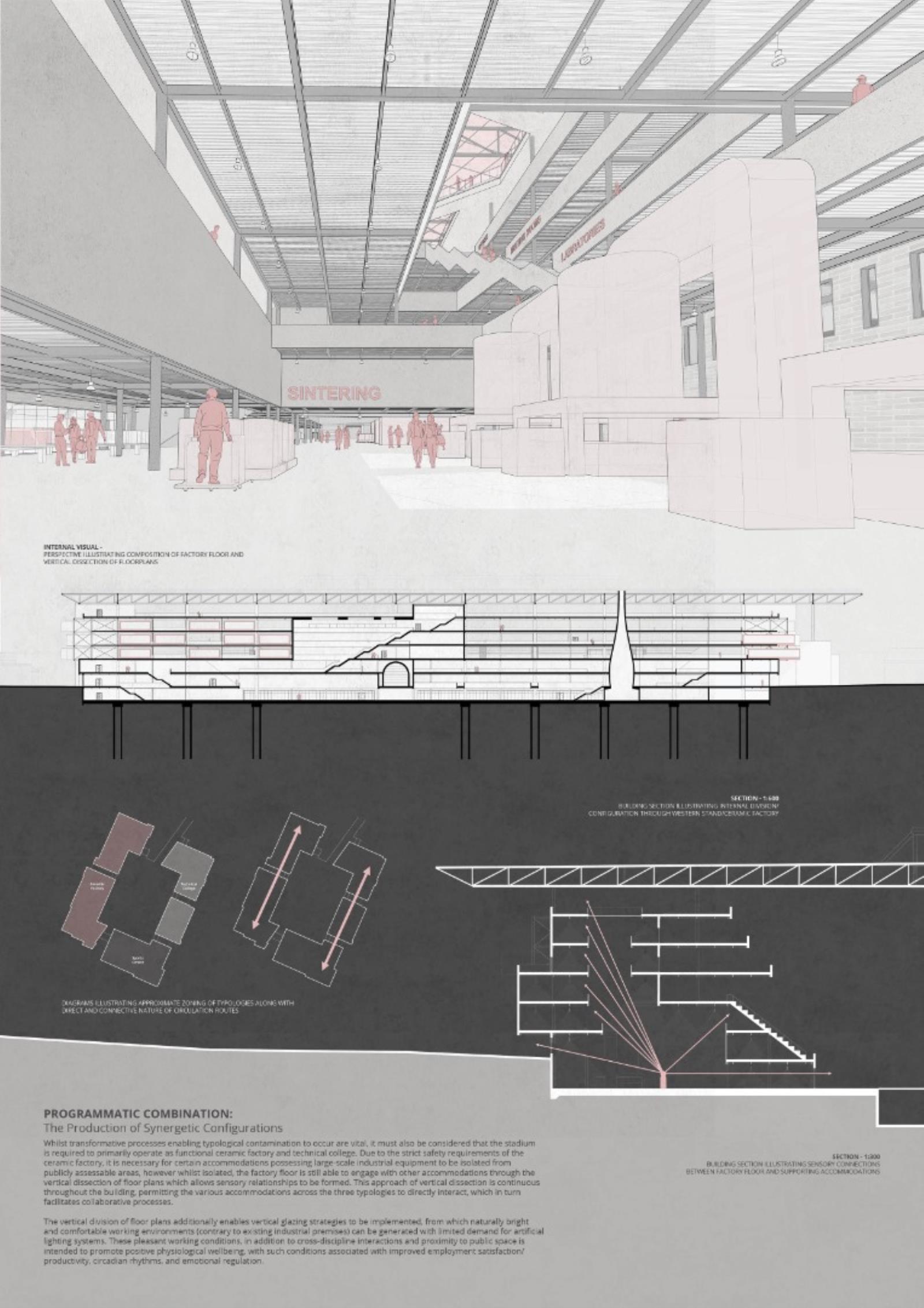 Typological Hybridity: The Integrated Urban Stadium Part 2 Project 2021 Jordan Halliday University of Huddersfield | UK A speculative deconstruction of the existing physical and functional typology of stadia utilising conceived constructs of hybridity to reimagine the contemporary and future stadium as not solely a functional sporting venue, but instead as an adaptive venue orientated towards urban socio-economic processes.Stoke-on-Trent is a city plagued by remnants of historic industrial processes, with a poor socio-economic cycle limiting future growth. However, building on this industrial heritage, the project proposes a regional advanced ceramics network. The hub of the network takes the form of a hybrid stadium, encompassing a ceramic factory, technical college, and sports centre, and which unites disjoined residential communities along an axial route towards the train station. Internally, the vertical dissection of floorplans, in connection with residential accommodations along dominant circulation routes and vertical lighting strategies encourages a comfortable working environment in which sensory relations between the typologies are formed. The modularisation of accommodations, in addition to complexity-dependent configurations, enable adaptability and responsiveness to live urban conditions, whether it be for a specific event, or for gradual socio-economic adjustments. Tutor(s) Ioanni Delsante Hazem Ziada
