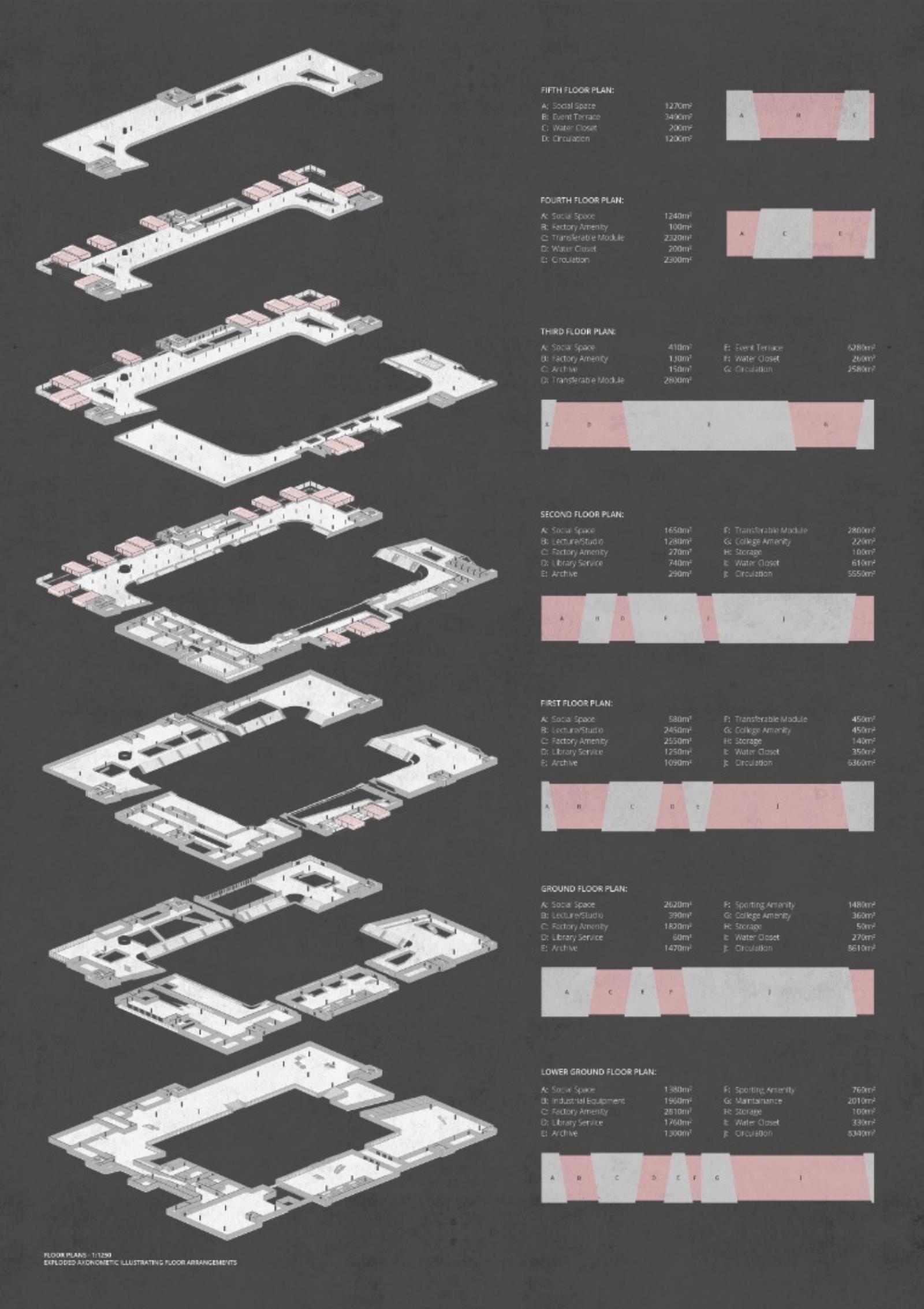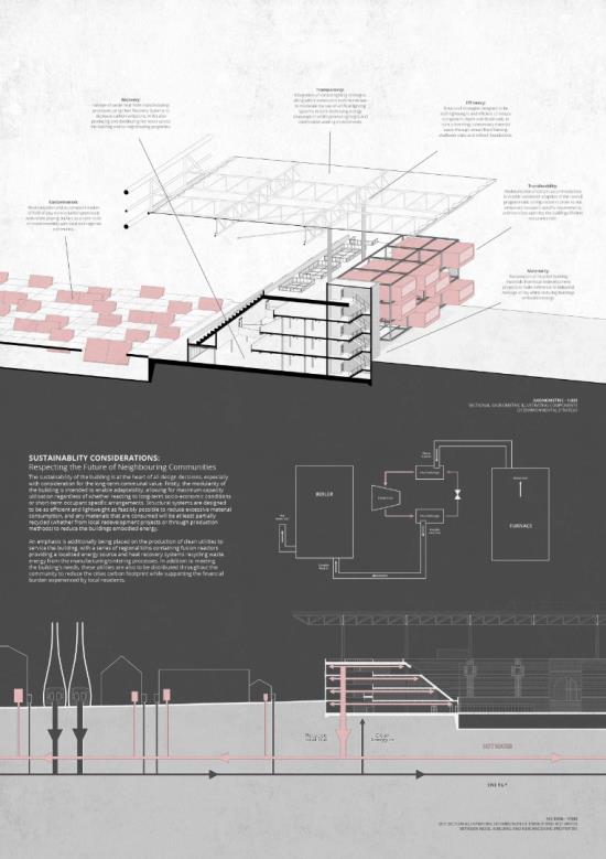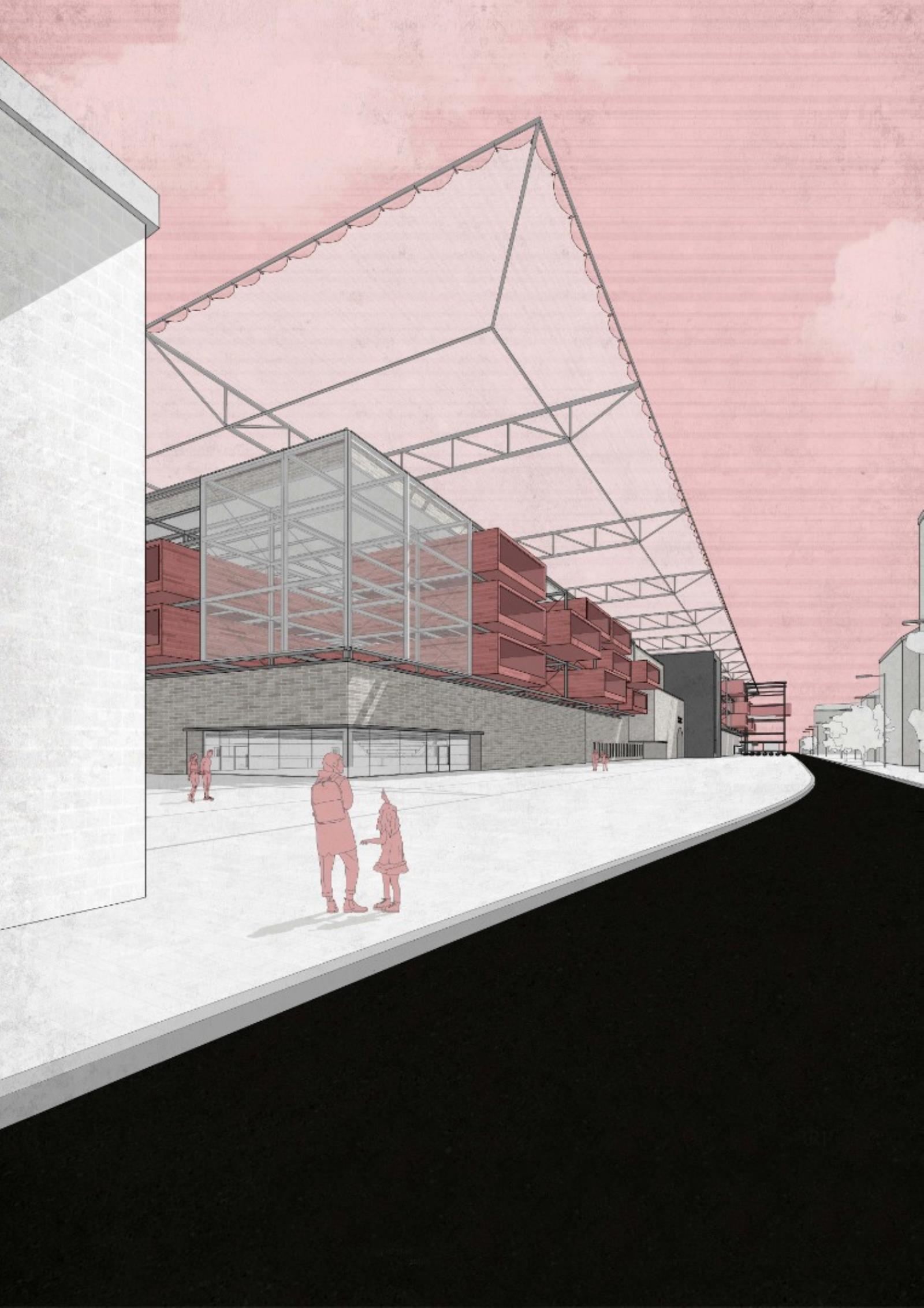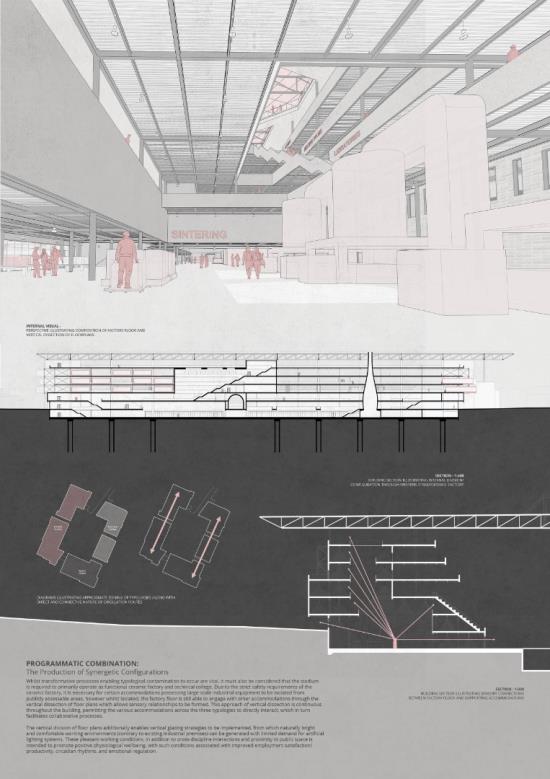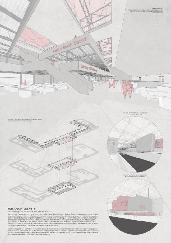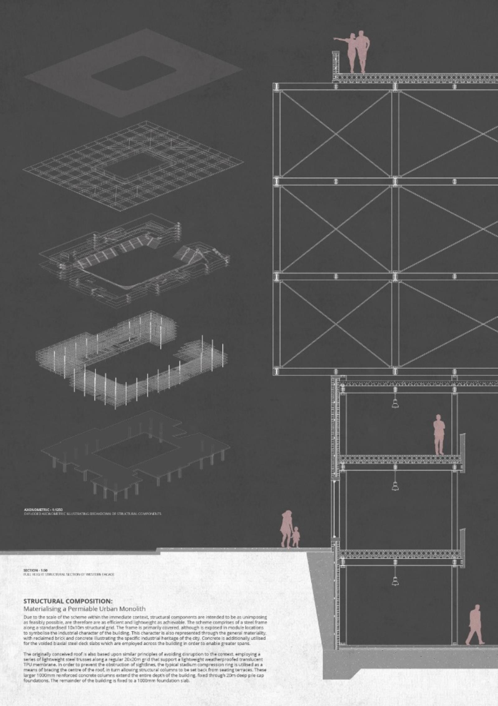 Typological Hybridity: The Integrated Urban Stadium Part 2 Project 2021 Jordan Halliday University of Huddersfield | UK A speculative deconstruction of the existing physical and functional typology of stadia utilising conceived constructs of hybridity to reimagine the contemporary and future stadium as not solely a functional sporting venue, but instead as an adaptive venue orientated towards urban socio-economic processes.Stoke-on-Trent is a city plagued by remnants of historic industrial processes, with a poor socio-economic cycle limiting future growth. However, building on this industrial heritage, the project proposes a regional advanced ceramics network. The hub of the network takes the form of a hybrid stadium, encompassing a ceramic factory, technical college, and sports centre, and which unites disjoined residential communities along an axial route towards the train station. Internally, the vertical dissection of floorplans, in connection with residential accommodations along dominant circulation routes and vertical lighting strategies encourages a comfortable working environment in which sensory relations between the typologies are formed. The modularisation of accommodations, in addition to complexity-dependent configurations, enable adaptability and responsiveness to live urban conditions, whether it be for a specific event, or for gradual socio-economic adjustments. Tutor(s) Ioanni Delsante Hazem Ziada