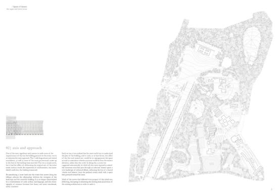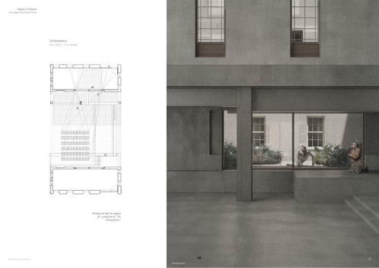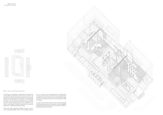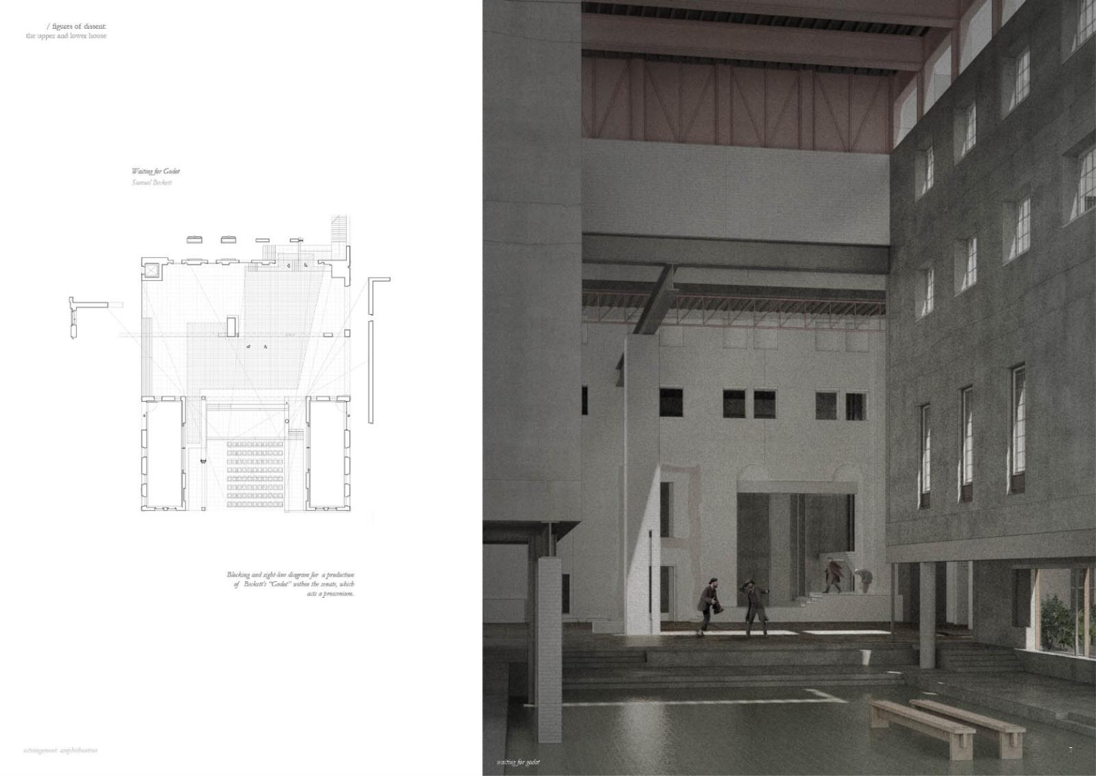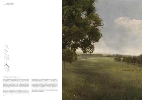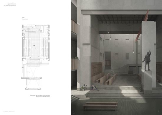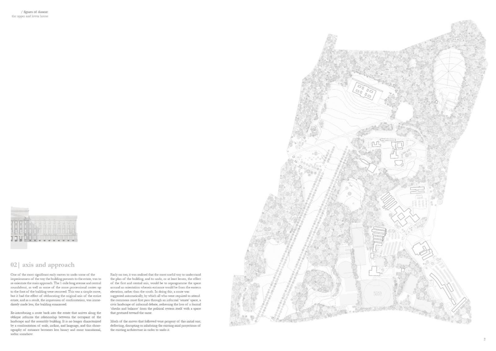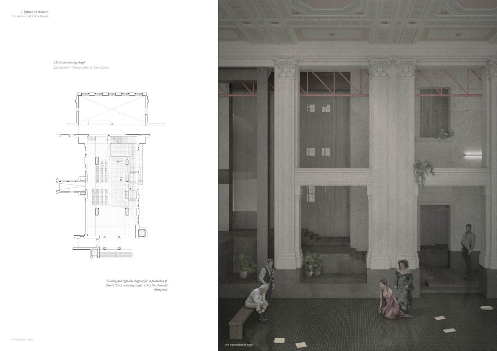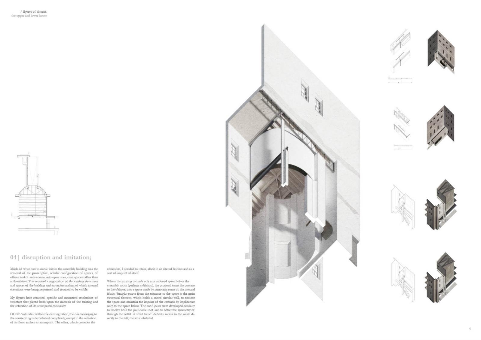 Figures of Dissent: The Upper and Lower House Part 2 Project 2021 Anna Crew Queen's University Belfast | UK The project is a re-imagining and undoing of Parliament Buildings at Stormont. The found language of the building, and the hegemonic ideals of power and government it projects, are entered into as one half of a critical conversation. What follows is the enactment of a spatial dialogue by the exertion instead spatial ‘figures’- configurations of structure and space that act to obfuscate, disrupt, subvert and inhabit the armature of the old parliament.These figures, rather than sharing in any commonality of materiality or language, share instead an intonation; each, in facilitating some new move within the space, some removal of fabric or more general recalcitrance, responds to the existing by at first heightening anticipation for a continued order before acting to refute it. The consequence of this is to permit the renegotiation of a social order by the spatial contradiction of one former, which is permitted to exist only residually.The resulting spaces, both ‘senate’ and commons, are then ‘made-strange’ in an act of further meta-fiction by the staging of selected theatre pieces within them, re-casting these spaces of government, and their ensuing rituals, as equally as indulgent of their own constructed-ness as the ?gures that permit their production. Tutor(s) Catherine Blaney Colm Moore