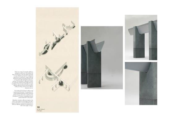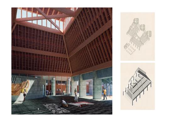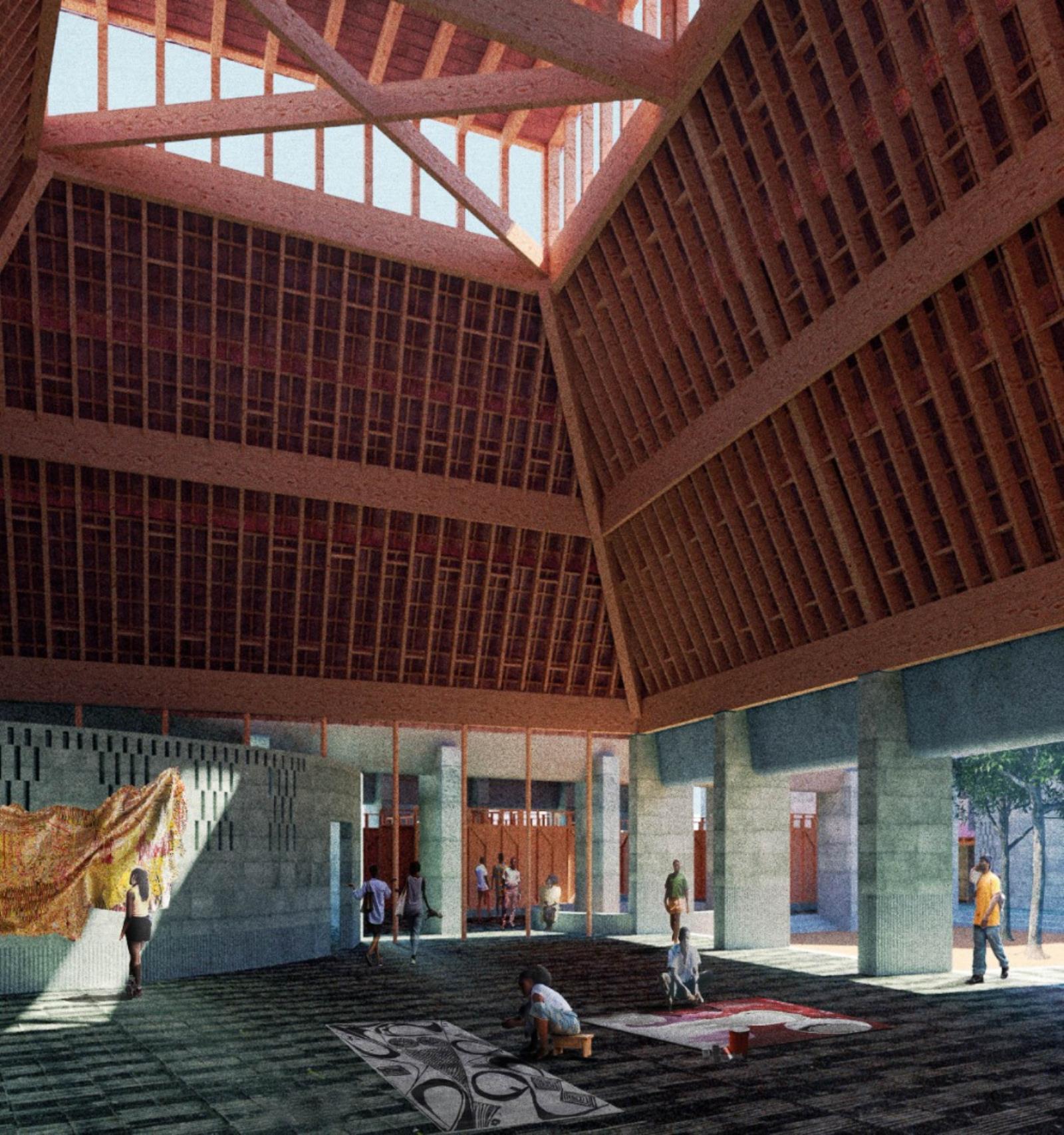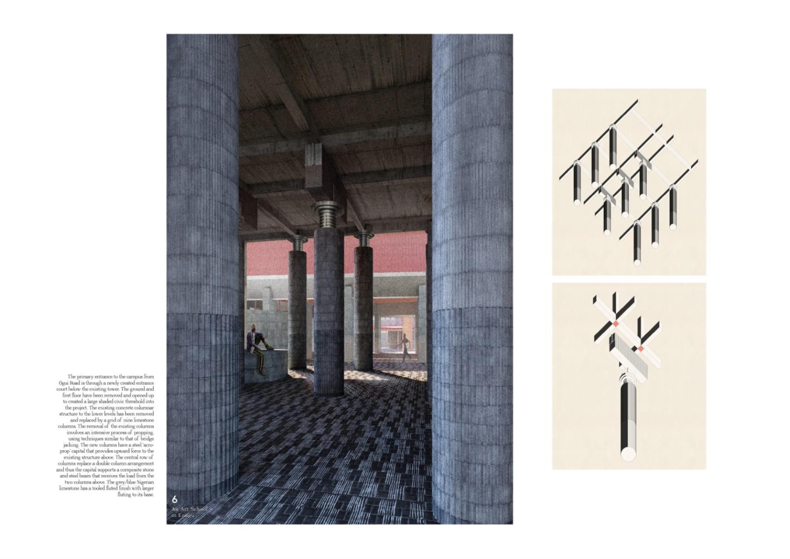 An Art School in Enugu Part 2 Project 2021 Finian Reece-Thomas Kingston University Kingston | UK This project has developed from a reading of the novel Purple Hibiscus by Chimimanda Ngozi Adichie. Set in post-colonial Enugu, Nigeria, the book tells the story of a country troubled by its hierarchical power structures such as those of politics, religion and the family unit. The inherent tension between tradition and modernity is explicated through the protagonist, Kambili, who finds liberation from her complex childhood environment in the progressive household of her auntie. This project, set in an imagined future on from the book, sees characters of the story establish a non-hierarchical institution for the teaching of creative disciplines in Enugu.The proposal sees the radical reuse of an existing 1960s tower, transformed into a new institution for the teaching of art in central Enugu. The architectural language of the project has explored ideas of textiles and weaving in both an attitude towards space as well as towards the tectonics of the building fabric - an approach guided by the challenging climate of south eastern Nigeria. Informed by both the pre-colonial palaces of western Africa and the compound house typology specific to much of urban Africa, the school utilises low embodied carbon materials and employs a range of passive environmental strategies to construct a spatially fluid and environmentally sustainable institution that provides the infrastructure for a new form of cultural reproduction in Enugu. Tutor(s) Andrew Clancy Laura Evans