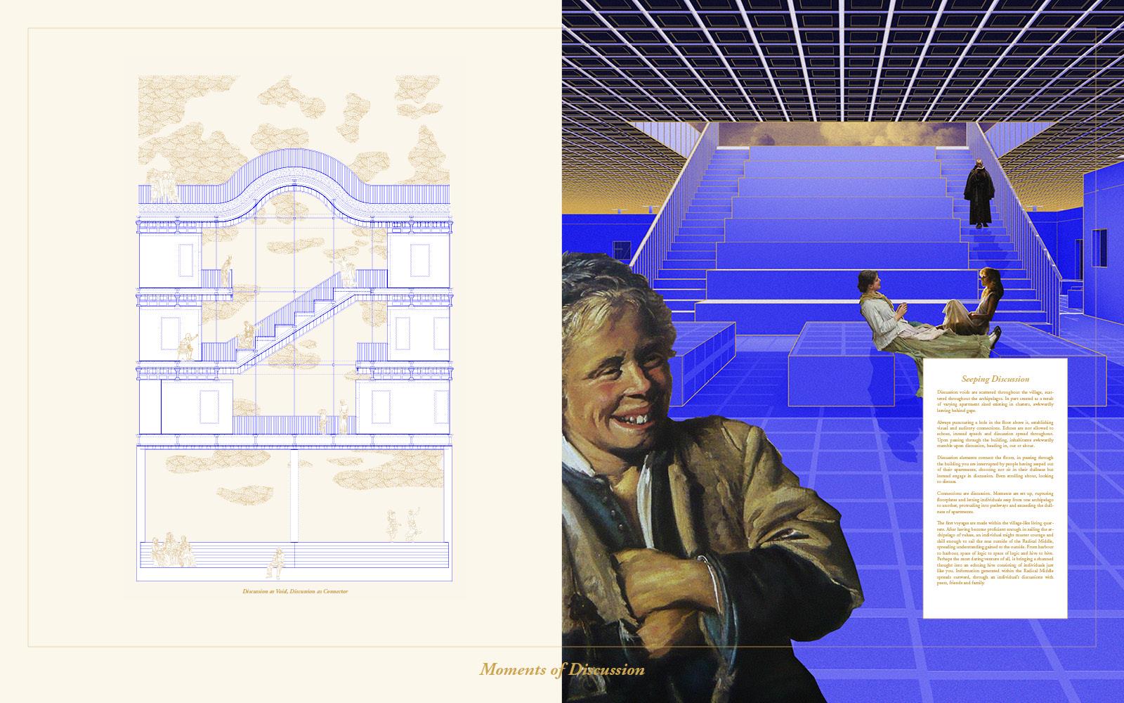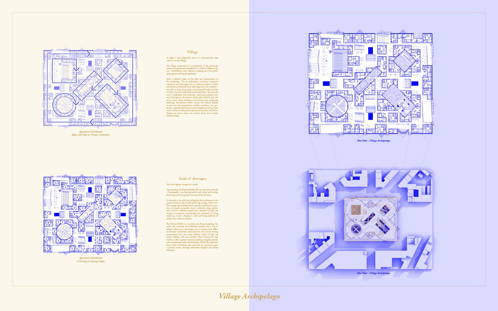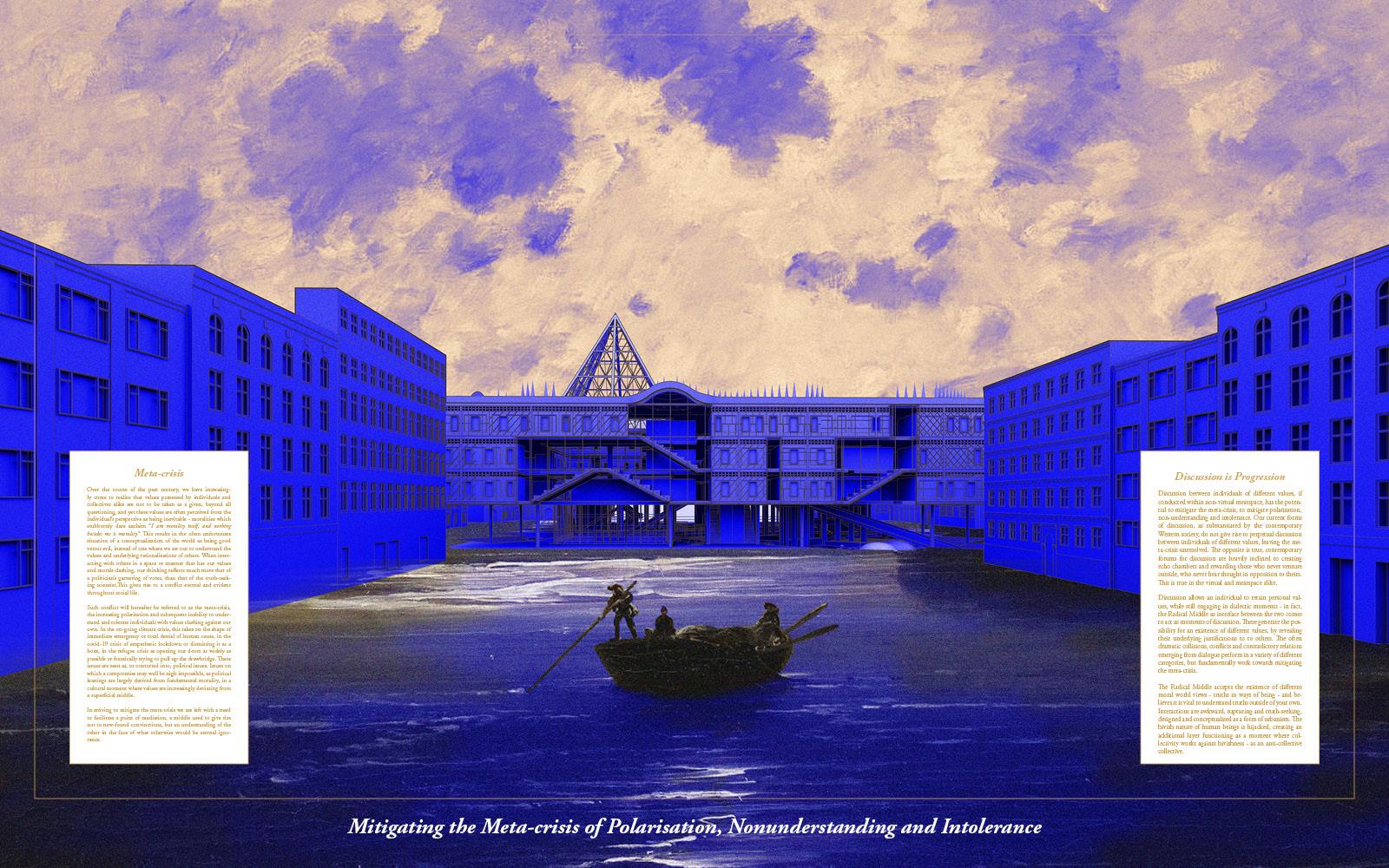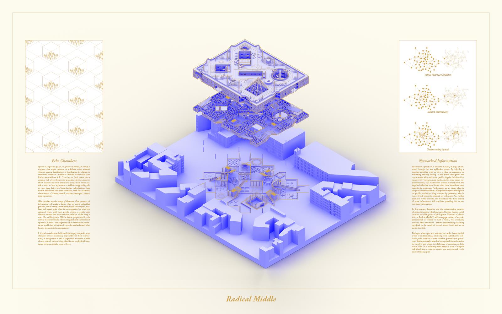 Middle – Mitigating the Meta-crisis of Polarisation, Nonunderstanding and Intolerance as Products of Underlying Differences Part 2 Project 2021 André Backlund Umeå University | Sweden The meta-crisis reveals itself in all other crises, as an underlying layer of increasing polarisation and subsequent inability to understand individuals whose values clash against our own. We need to facilitate a middle.Discussion has the potential to mitigate the meta-crisis. Currents forms of discussion as substantiated by the contemporary Western society do not give rise to perpetual discussion between individuals of different values. Instead favouring hivishness, constantly at risk of turning into echo chambers - the scourge of discussion.Radical Middle sets up a series of archipelagos, extracting individuals from their echo chambers and plunging them into discussion. A model working against the otherwise segregating city is constructed by locating and reshuffling values in the spatial, using a three-point model relying on relationships between class status, apartment size and individual values. Having located values in the spatial, these are reshuffled into the Village. A collective perpetually working against echoes.As above, so below, awkward and rupturing public moments occur. Hyper-populated conditions hijack our hivish instincts, forcing otherwise separated and echoing groups into discussion along soft, plinth-like transitions.Perpetually occurring moments of discussion between individuals of different values leave behind a web of understanding spreading throughout society, mitigating the meta-crisis. Tutor(s) Amalia Katopodis Robert Mull Sangram Shirke