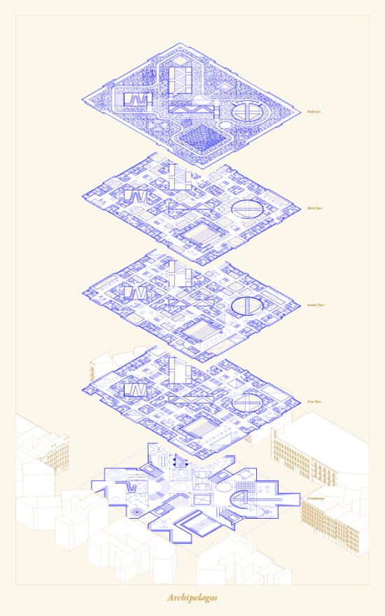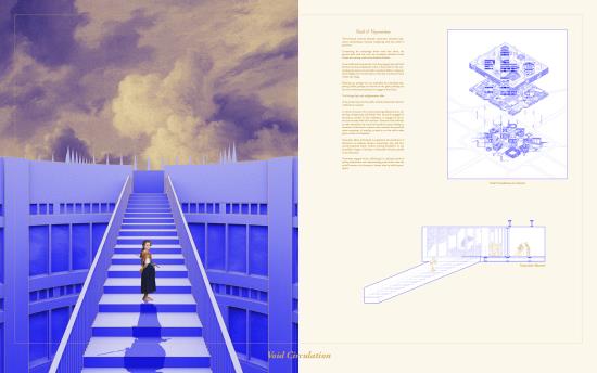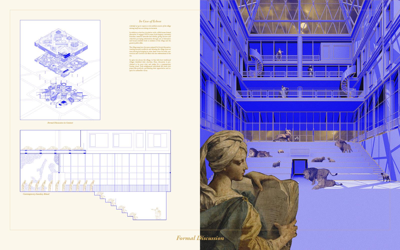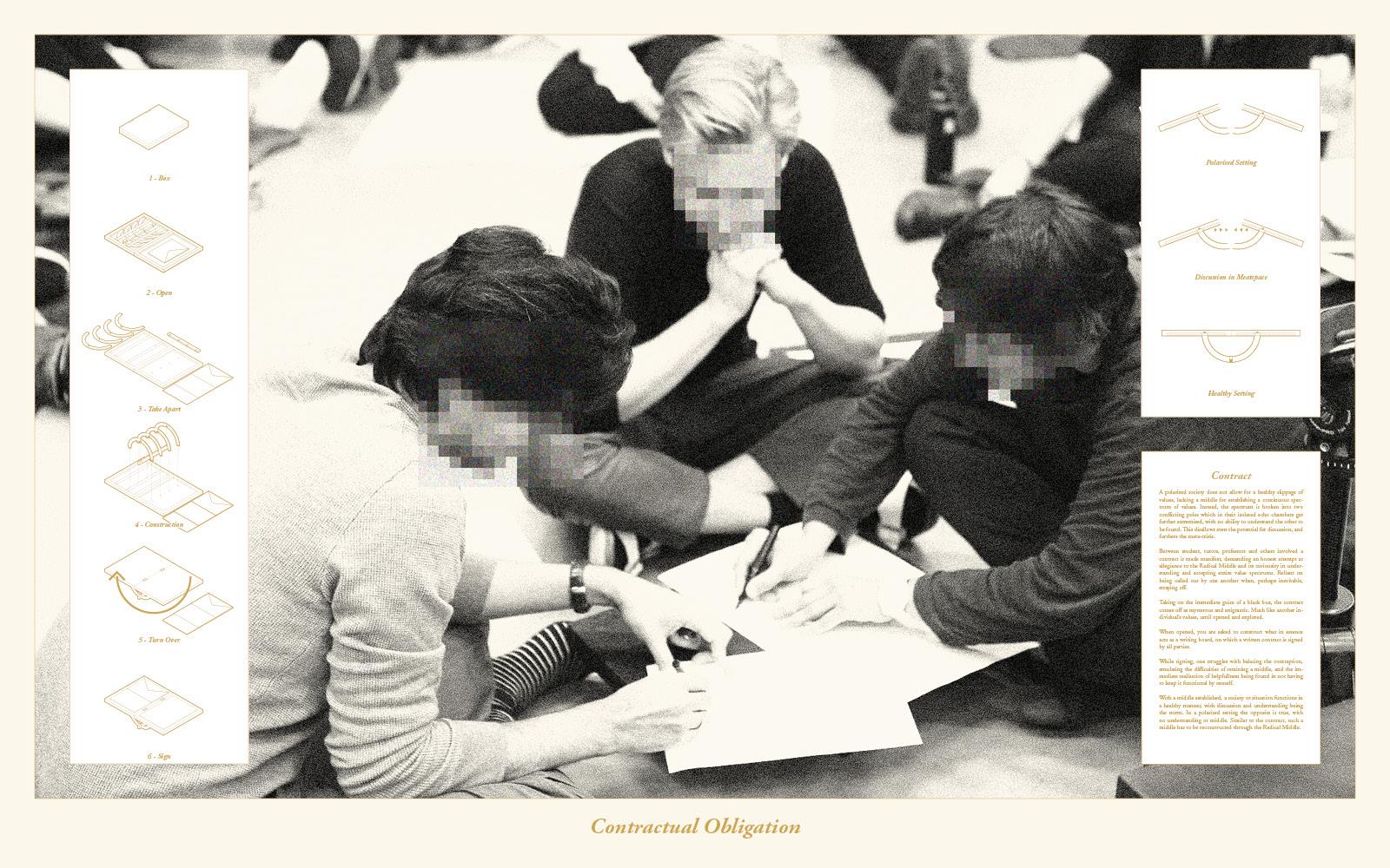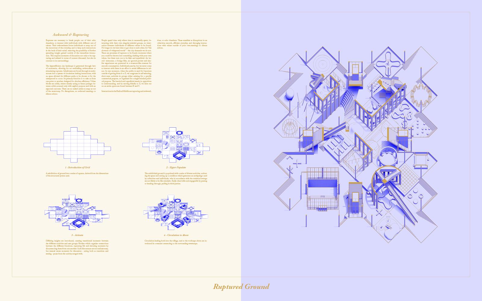 Middle – Mitigating the Meta-crisis of Polarisation, Nonunderstanding and Intolerance as Products of Underlying Differences Part 2 Project 2021 André Backlund Umeå University | Sweden The meta-crisis reveals itself in all other crises, as an underlying layer of increasing polarisation and subsequent inability to understand individuals whose values clash against our own. We need to facilitate a middle.Discussion has the potential to mitigate the meta-crisis. Currents forms of discussion as substantiated by the contemporary Western society do not give rise to perpetual discussion between individuals of different values. Instead favouring hivishness, constantly at risk of turning into echo chambers - the scourge of discussion.Radical Middle sets up a series of archipelagos, extracting individuals from their echo chambers and plunging them into discussion. A model working against the otherwise segregating city is constructed by locating and reshuffling values in the spatial, using a three-point model relying on relationships between class status, apartment size and individual values. Having located values in the spatial, these are reshuffled into the Village. A collective perpetually working against echoes.As above, so below, awkward and rupturing public moments occur. Hyper-populated conditions hijack our hivish instincts, forcing otherwise separated and echoing groups into discussion along soft, plinth-like transitions.Perpetually occurring moments of discussion between individuals of different values leave behind a web of understanding spreading throughout society, mitigating the meta-crisis. Tutor(s) Amalia Katopodis Robert Mull Sangram Shirke