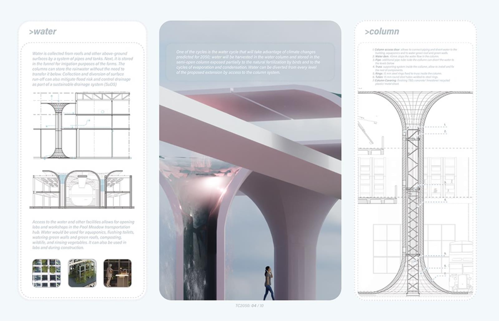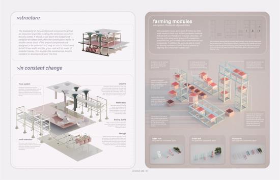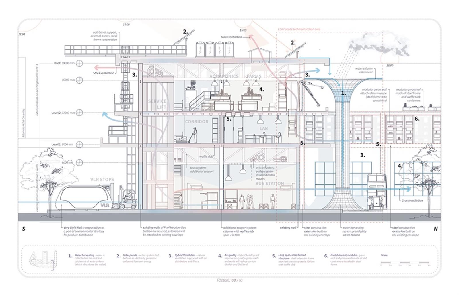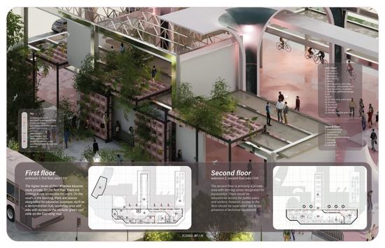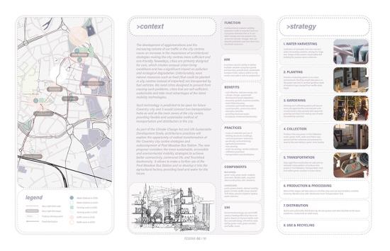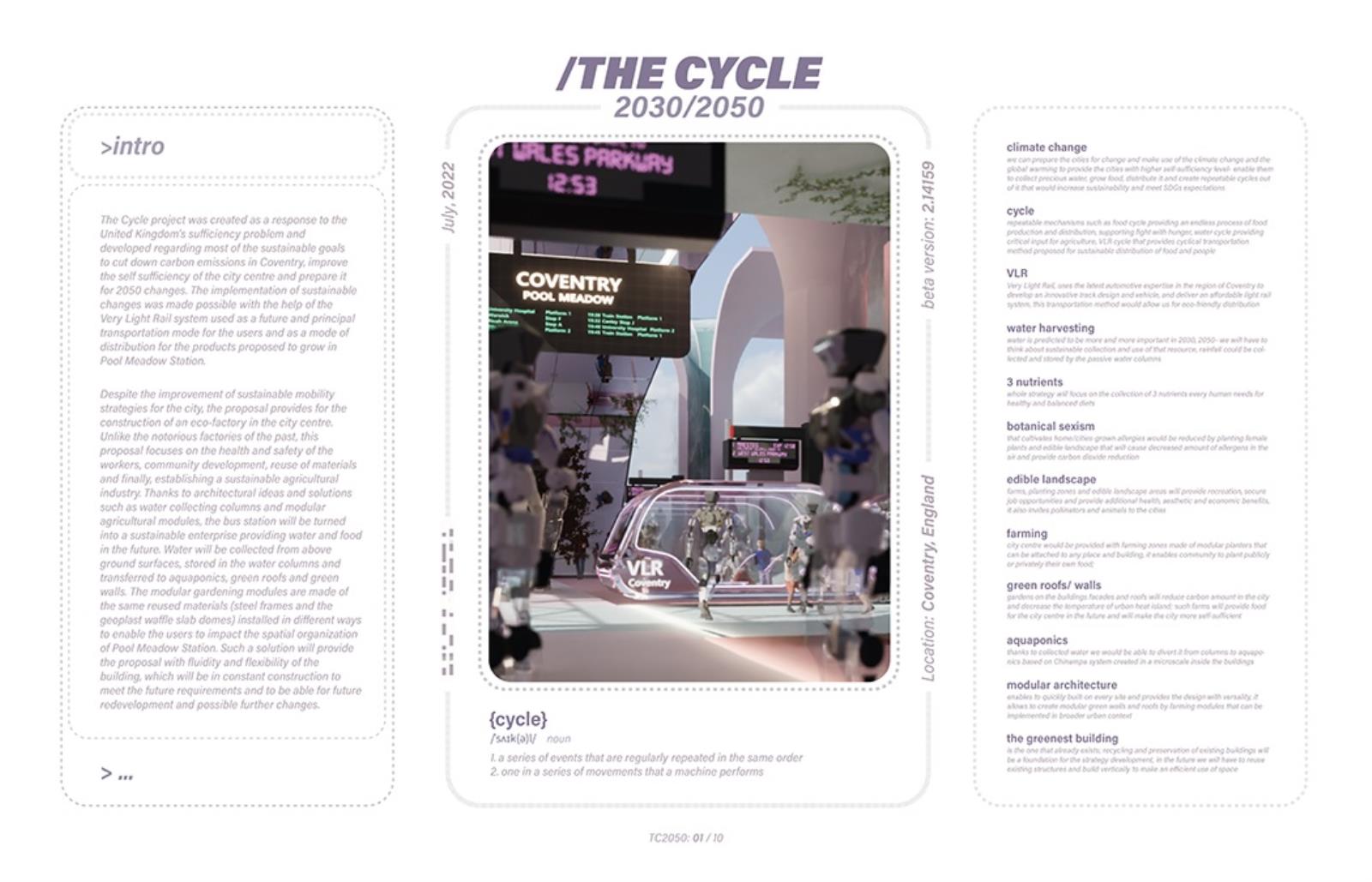 The Cycle Part 1 Project 2022 Kamil Przybylski Coventry University | UK The Cycle- retrofuturistic project was created as a response to the United Kingdom’s sufficiency problem and developed regarding most of the sustainable goals to cut down carbon emissions, improve the self-sufficiency of the city centre and prepare it for 2050 climatic changes and demands.The implementation of sustainable solutions was made possible with help of the Very Light Rail system used as a future and principal transportation mode for the users and as a mode of distribution for the produce proposed to grow in Pool Meadow Bus Station.The proposal provides for the construction of an eco-factory in the city centre. Unlike the notorious factories of the past, this proposal focuses on the health and safety of the workers, community development, reuse of materials and finally, establishing a sustainable agricultural industry. Thanks to architectural ideas and solutions such as water collecting columns and modular agricultural modules, the bus station will be turned into a sustainable enterprise providing water and food in the future. The new station project aims to achieve fluidity and flexibility of the building, which will be in constant construction changes to meet the future requirements and to be able for future redevelopment. Tutor(s) Tulika Gadakari Hossein Sadri
