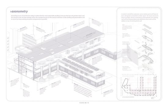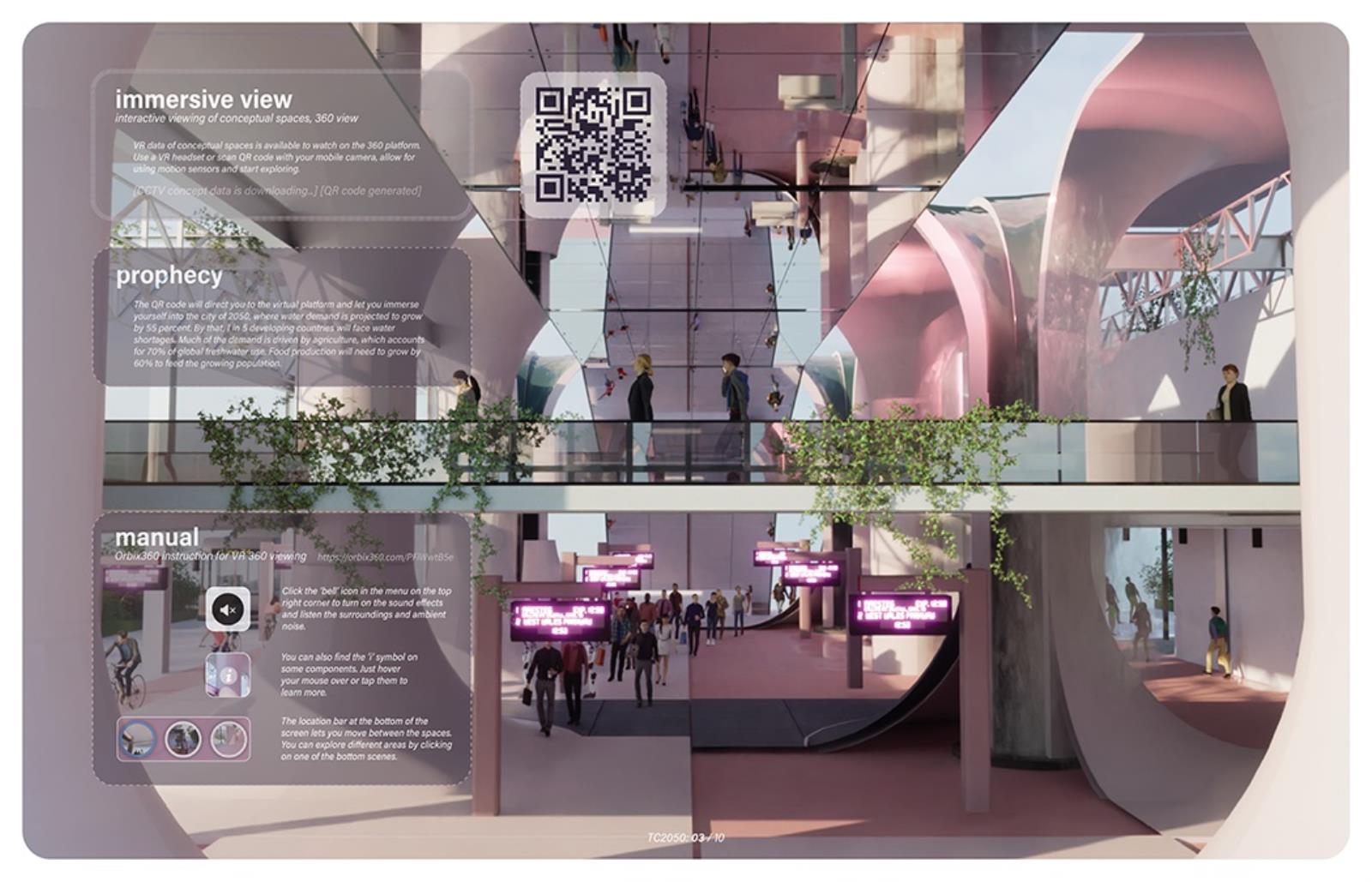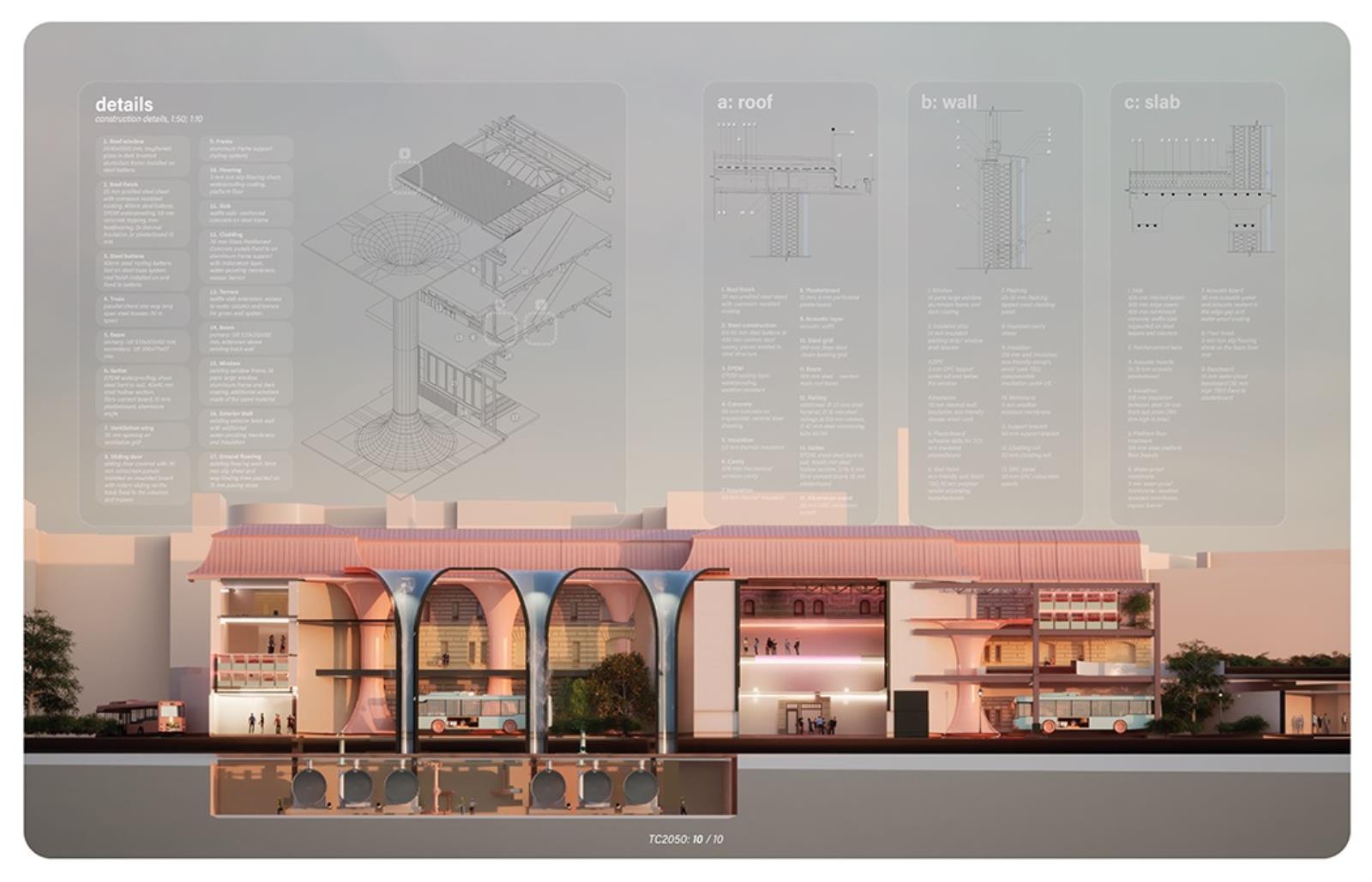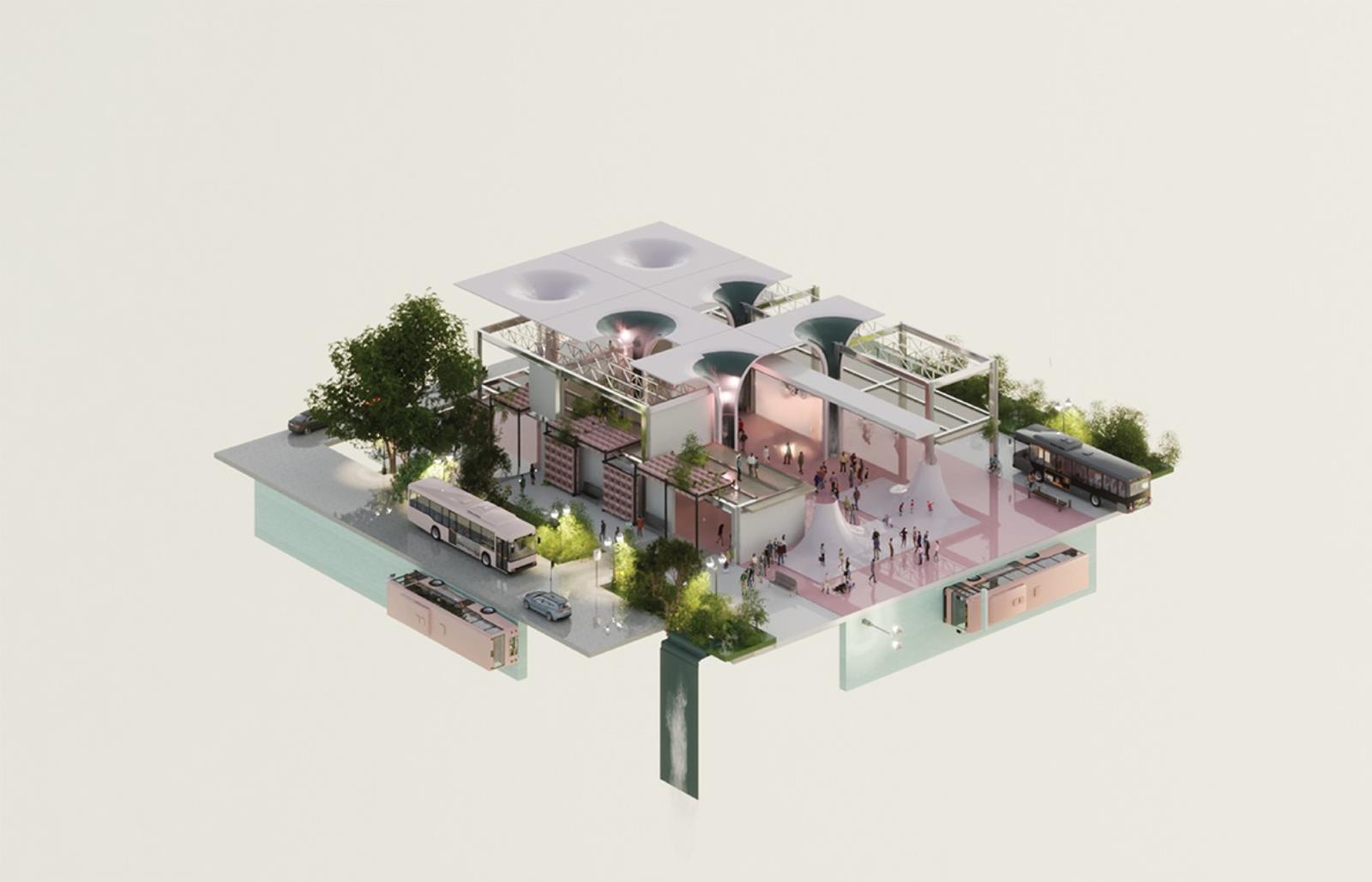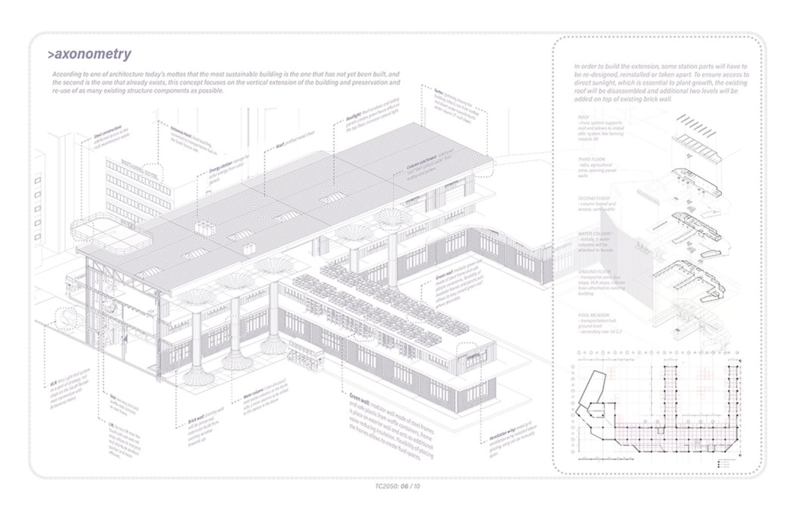 The Cycle Part 1 Project 2022 Kamil Przybylski Coventry University | UK The Cycle- retrofuturistic project was created as a response to the United Kingdom’s sufficiency problem and developed regarding most of the sustainable goals to cut down carbon emissions, improve the self-sufficiency of the city centre and prepare it for 2050 climatic changes and demands.The implementation of sustainable solutions was made possible with help of the Very Light Rail system used as a future and principal transportation mode for the users and as a mode of distribution for the produce proposed to grow in Pool Meadow Bus Station.The proposal provides for the construction of an eco-factory in the city centre. Unlike the notorious factories of the past, this proposal focuses on the health and safety of the workers, community development, reuse of materials and finally, establishing a sustainable agricultural industry. Thanks to architectural ideas and solutions such as water collecting columns and modular agricultural modules, the bus station will be turned into a sustainable enterprise providing water and food in the future. The new station project aims to achieve fluidity and flexibility of the building, which will be in constant construction changes to meet the future requirements and to be able for future redevelopment. Tutor(s) Tulika Gadakari Hossein Sadri