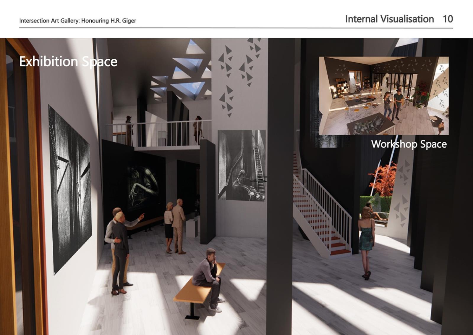 The proposal design honours the style of the artist H.R.Giger, reiterating elements of the methods he undertakes in his artwork, embedded into the design concept. Giger artwork forms an industrial/ mechanical look, inserting multiple pathways within his art in order to reflect a non-invasive space that promotes mental wellbeing, in-opposed to a claustrophobic/heavy finish. This concept respects and mimics the history of Salford Quays, as the urban regeneration scheme following the 20th century and post-war period ensured the abolishment of industrial activity in the district. Therefore, the proposal considers cultural/ historic value of the city’s heritage, ensuring a wider scale of social inclusion and place making in the area.