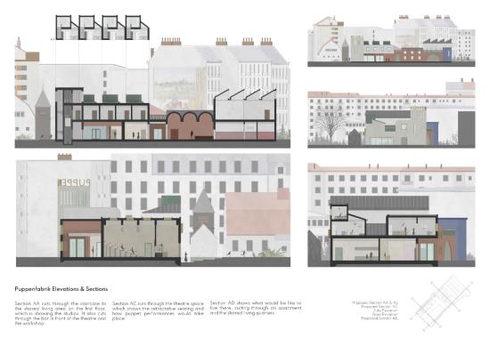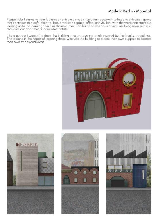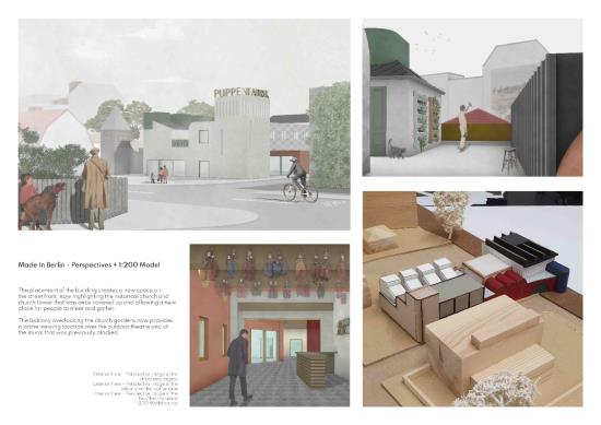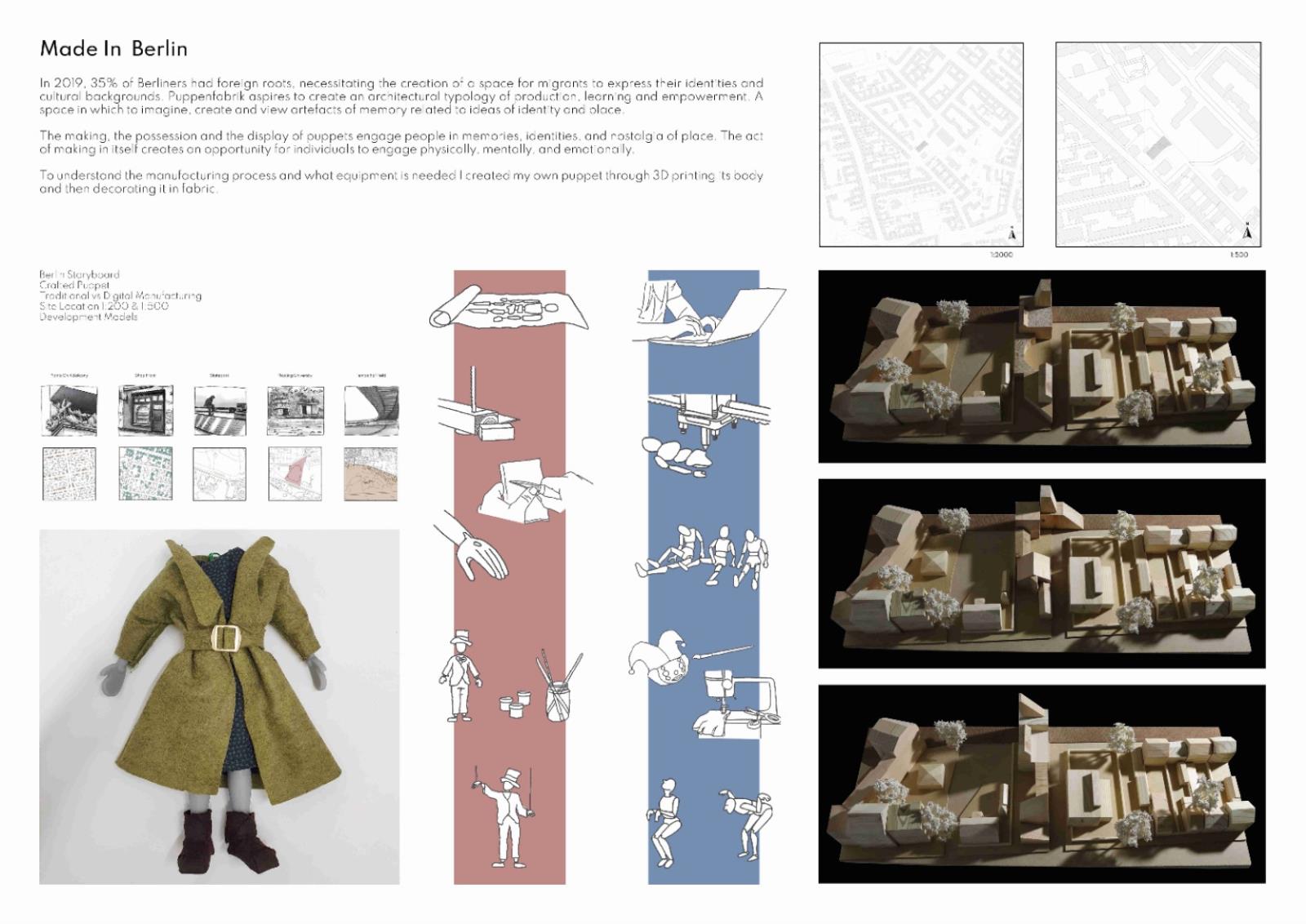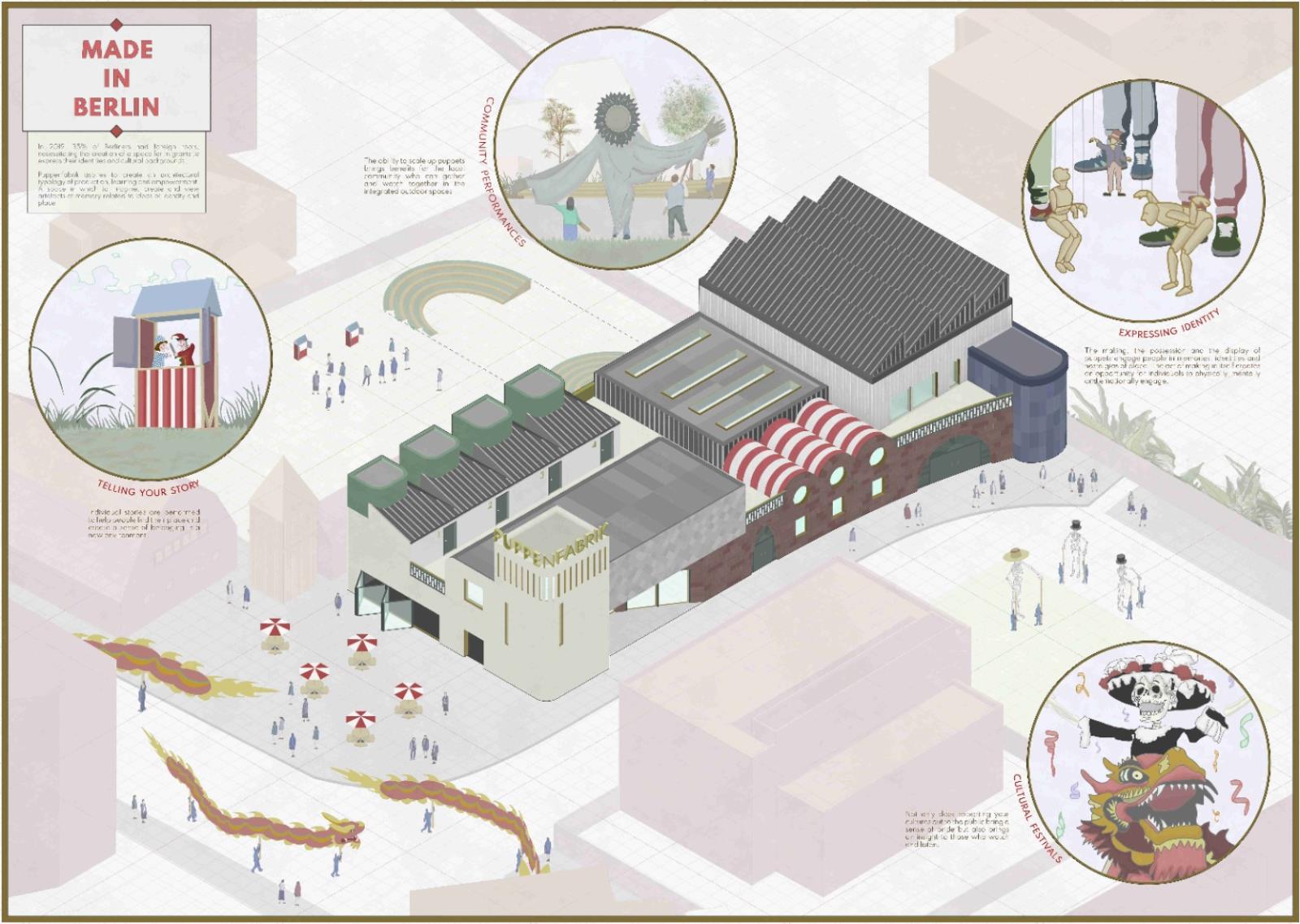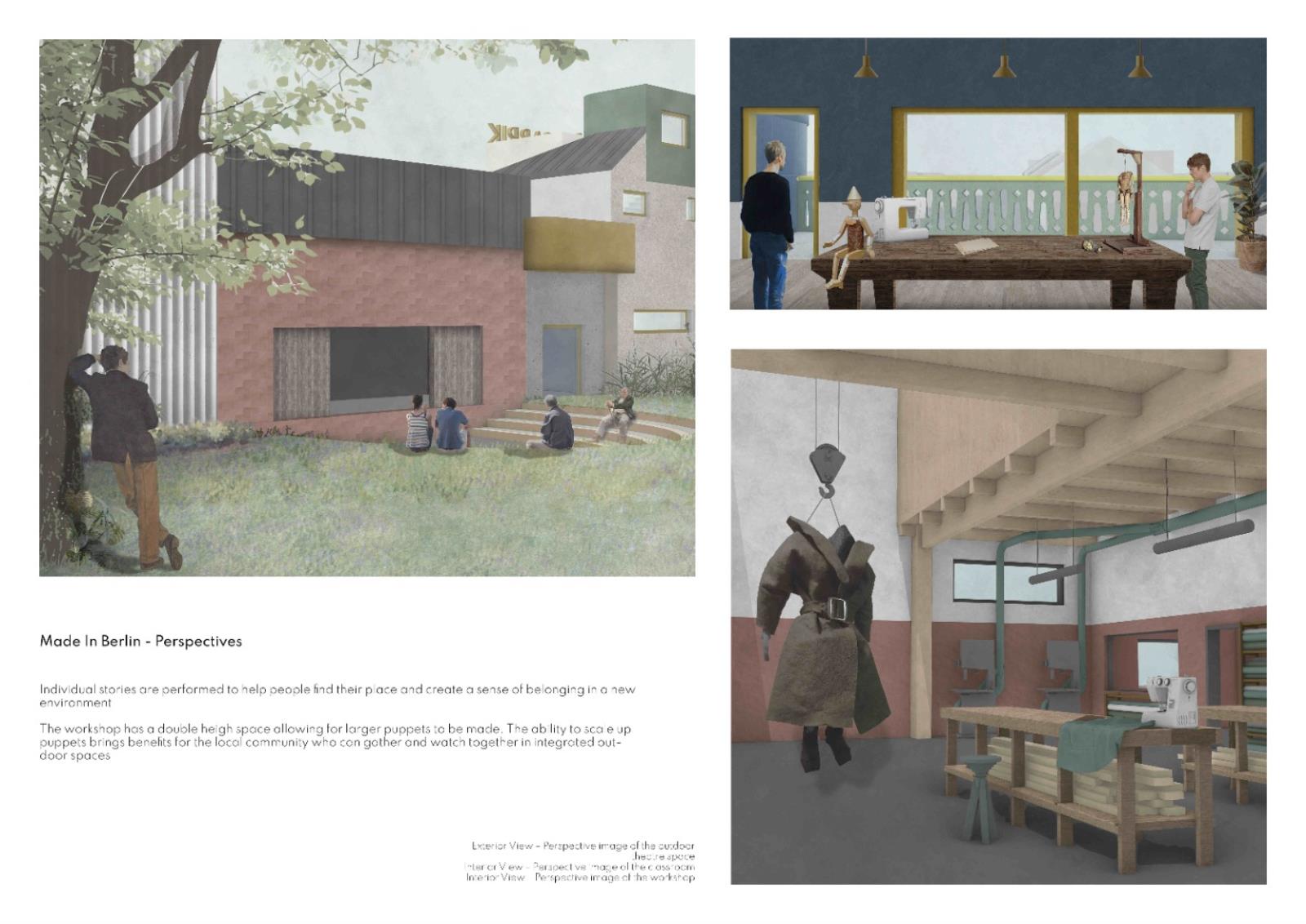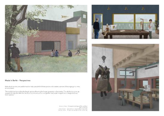 ‘Puppenfabrik’ aspires to create an architectural typology of production, learning and empowerment; a space in which to imagine, create and view artefacts of memory related to ideas of identity and place. The making, the possession and the display of puppets engages people and creates an opportunity for individuals to engage physically, mentally, and emotionally. Individual stories are performed to help people find their place and create a sense of belonging in a new environment.
