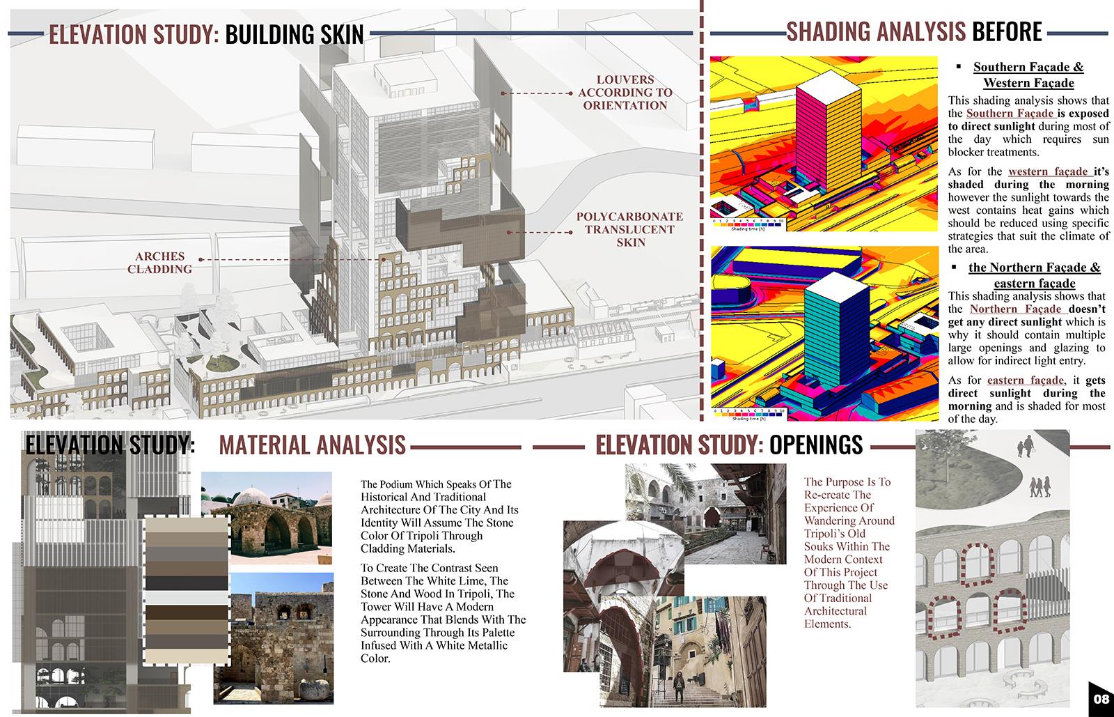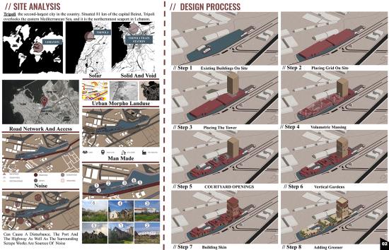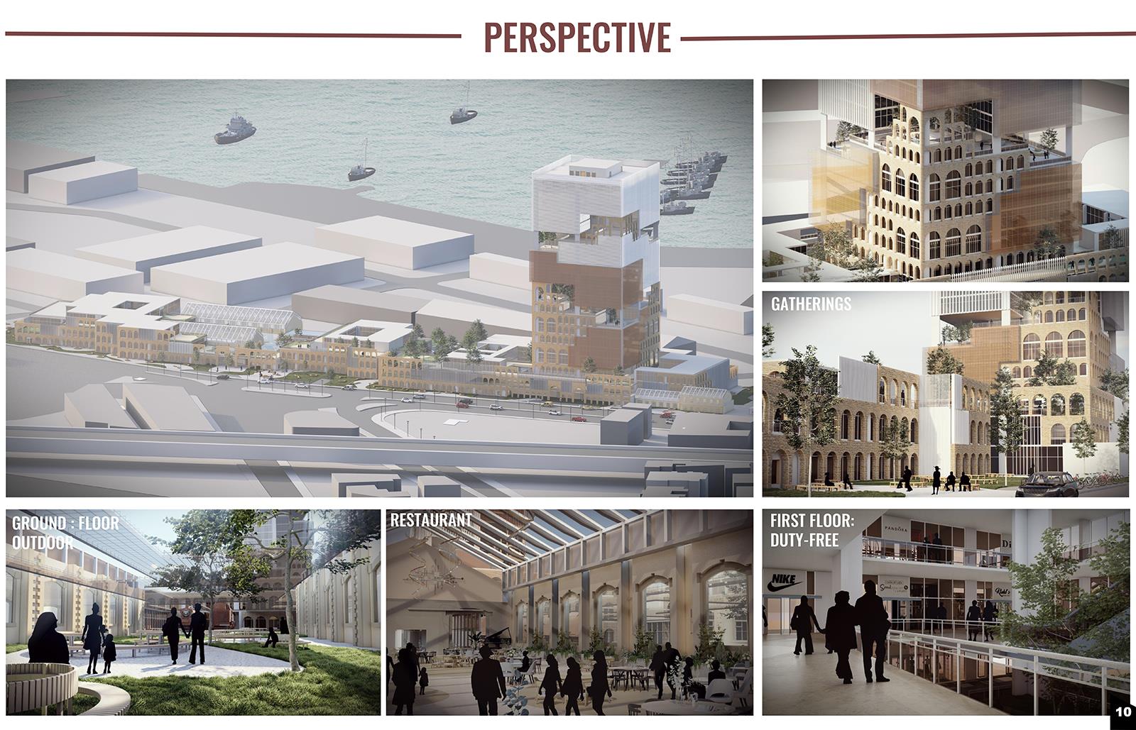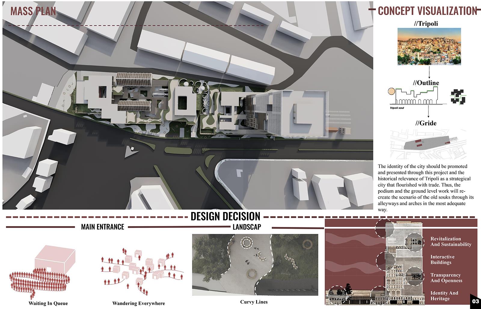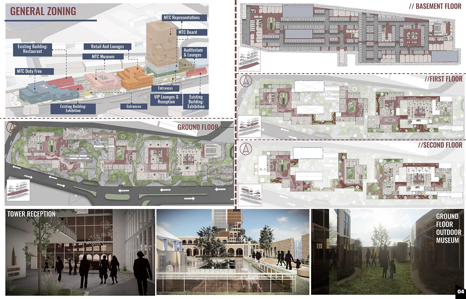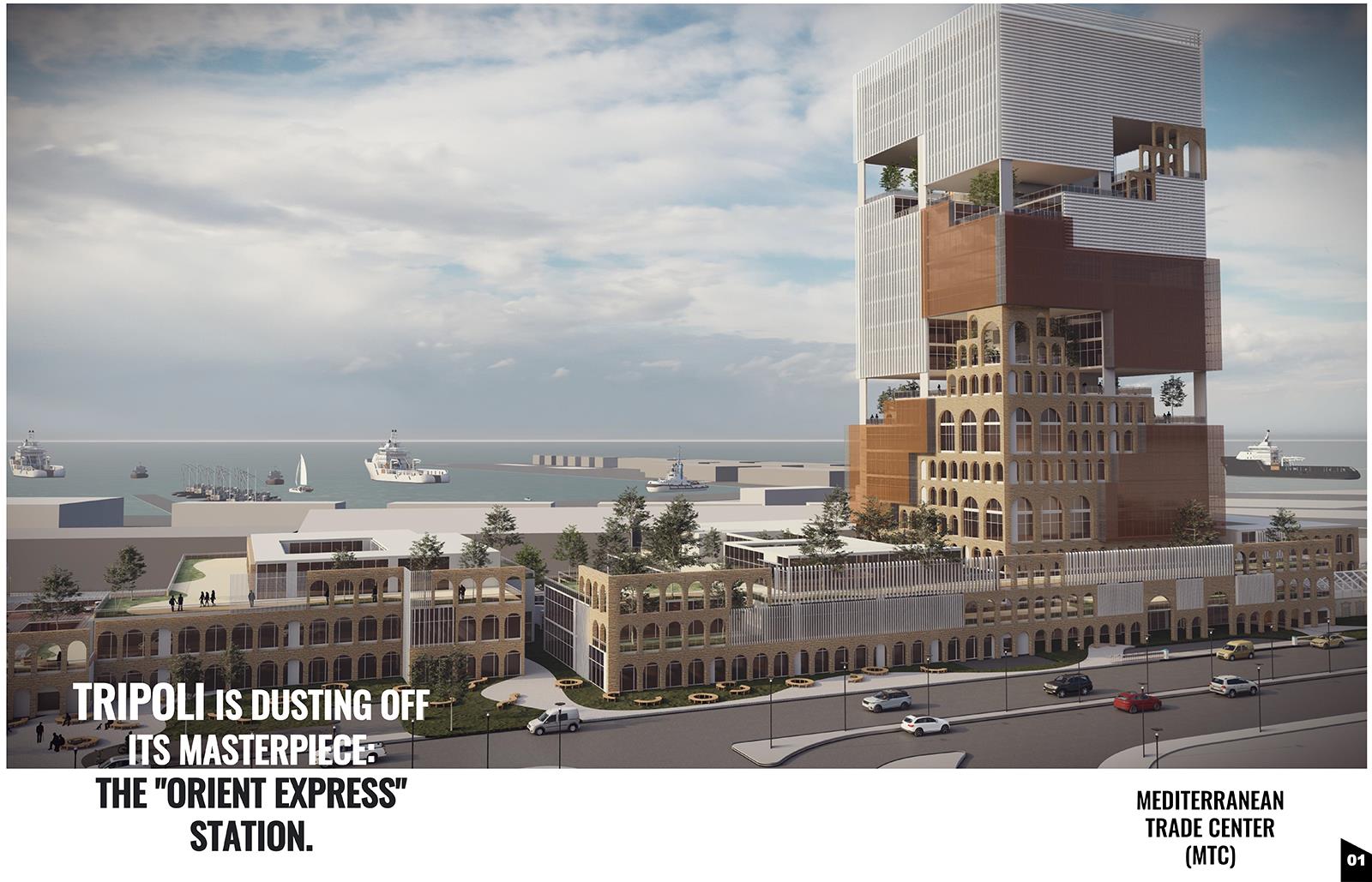 Tripoli Is Dusting Off Its Masterpiece: The "Orient Express" Station. Mediterranean Trade Center (MTC) Part 1 Project 2023 Zamzam Ali Al-Yakhni Beirut Arab University - Tripoli campus | Lebanon Tripoli, the Pearl of the North, has been an important trading and commerce center for centuries due to its strategic location. Being on the eastern coast of the Mediterranean, Tripoli served throughout history as a meeting place of civilizations and trade routes that linked the West and the East. However, its role and trade activities have declined with time for different reasons. This led to the project idea of a Mediterranean Trade Center that honors Tripoli's historical legacy, revitalizes the area as a hub for trade and cultural exchange, and showcases the city's unique identity to both residents and visitors. Accordingly, the center shapes the harmonious blending of new and old architecture. The design respects the existing architectural fabric of Tripoli's Old City, incorporating traditional elements such as arches, courtyards, and intricate detailing, evoking a sense of nostalgia and cultural pride. The center's commitment to the heritage of the city is evident in the old train station building that serves as a home for exhibition halls, showcasing the city's cultural heritage and promoting local artisans and craftsmen. At the same time, contemporary design principles and sustainable technologies ensure the center's relevance and functionality in the modern world. Tutor(s) Fatima Belok Mostafa Rabea Khalifa