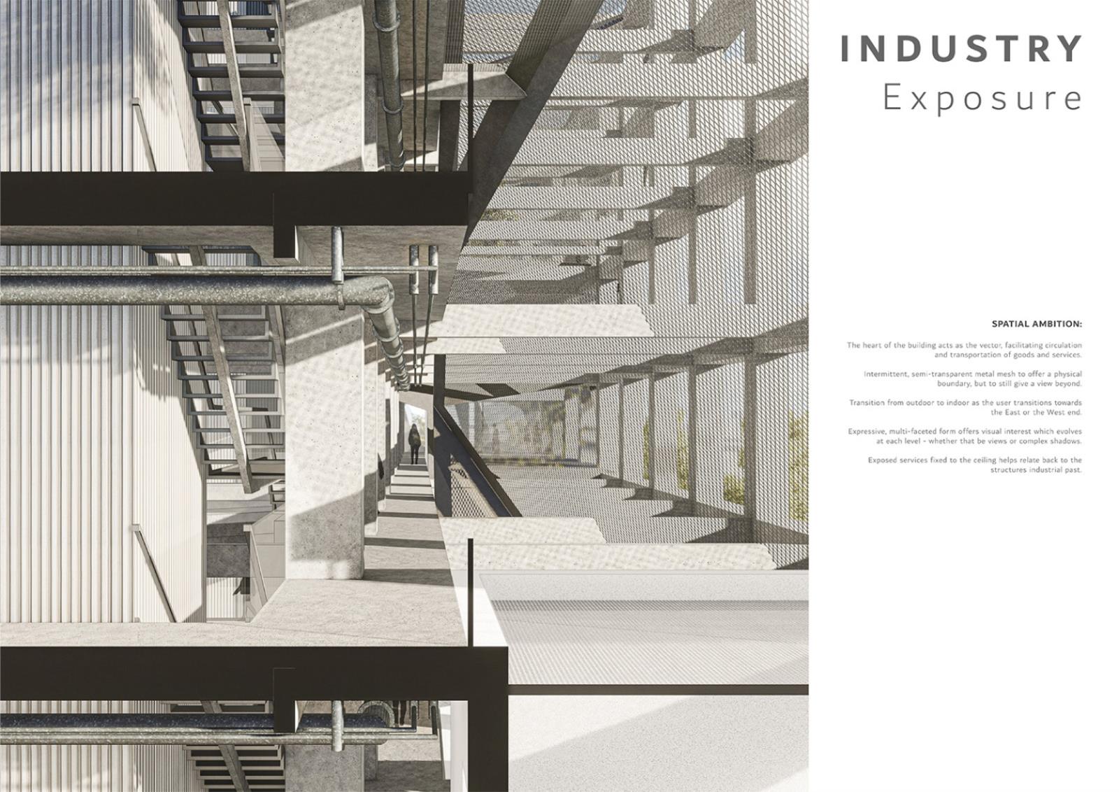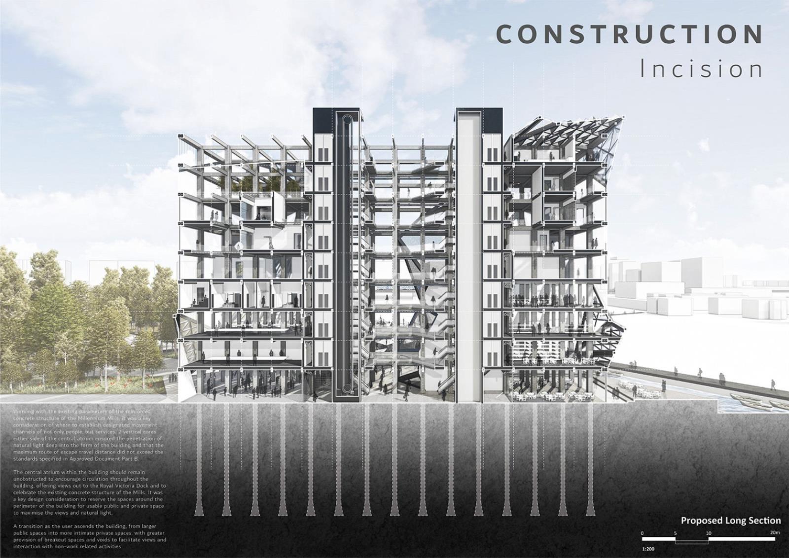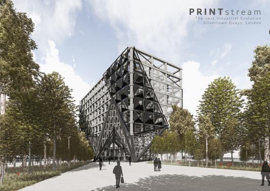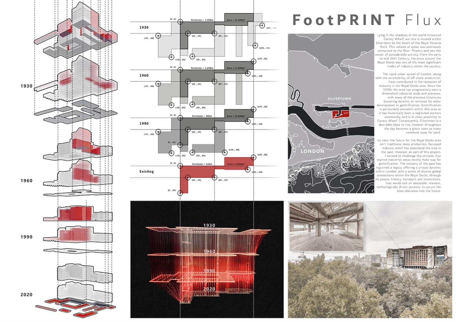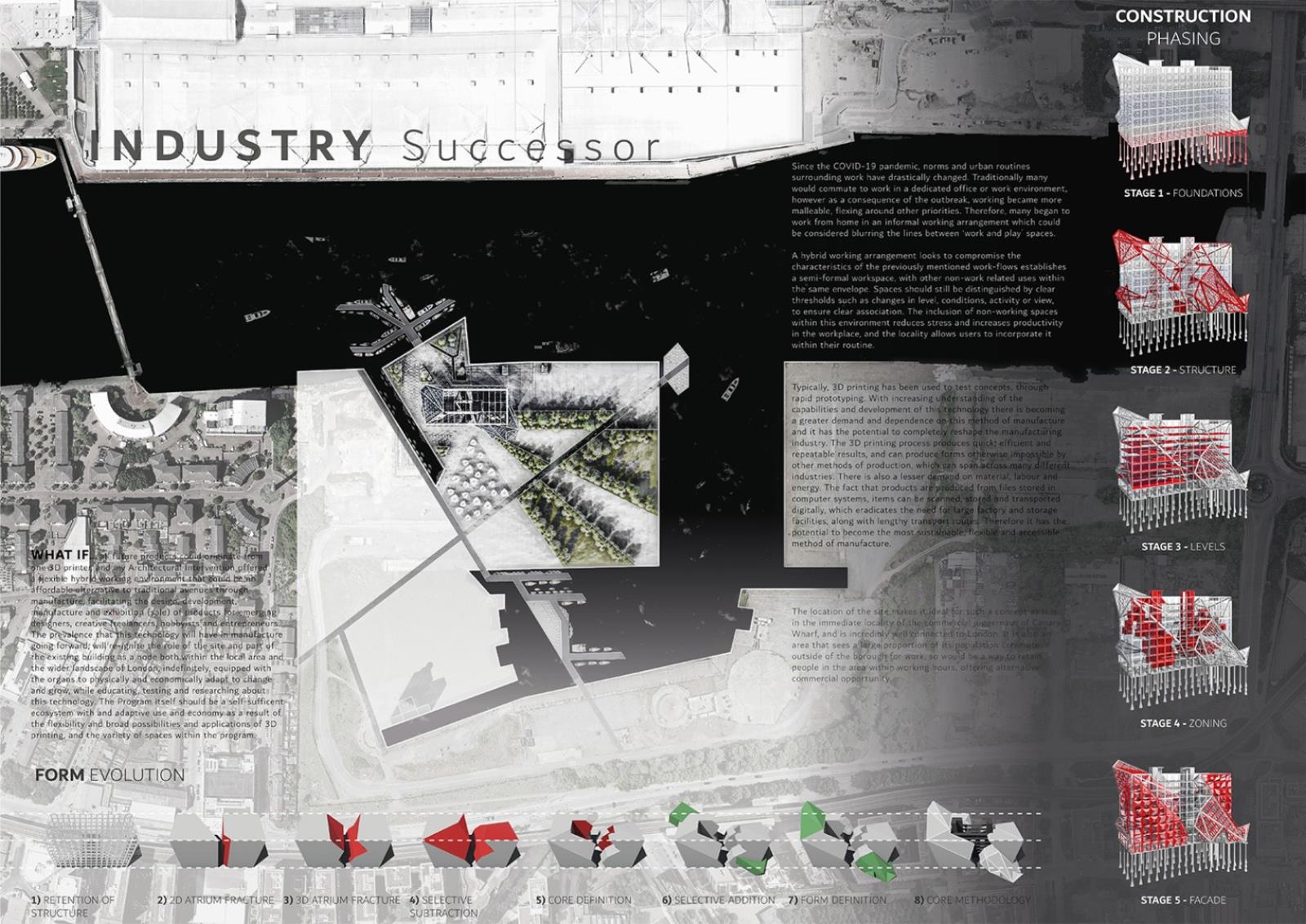 PRINTstream Part 1 Project 2023 Rob Atkins London South Bank University | UK PRINTstream: The founding of a flexible and durable technology hub within the Royal Docks, utilizing the reinforced concrete structural skeleton of the derelict Millenium Mills building, to re-establish the site as a key node within the local and wider context. Motivated by a desire to juxtapose the attitude that ex-industrial areas within proximity to the city should be engulfed by gentrification, losing much of the existing fabric and community.This project adopts a mindset of… what if all future products could originate from one master 3D printer, and my intervention offered a flexible hybrid working environment that offers an affordable and sustainable alternative to traditional avenues of manufacture - facilitating the design, development, manufacture, and sale of products for emerging designers and creative freelancers.Spatially, the scheme focusses on a vertical axis that bisects the building to create the central atrium and celebrated circulation region, with privacy and use evolving as the form transcends. Internal vistas throughout the structure suggest various activities, garnering a hybrid attitude to working life through inquisition. A variety of spatial experiences and thresholds intertwined around the existing structural grid, delineates the various uses of each area, while promoting versatility and freedom of movement. Tutor(s) Daniel Tang Sypridon Kaprinis