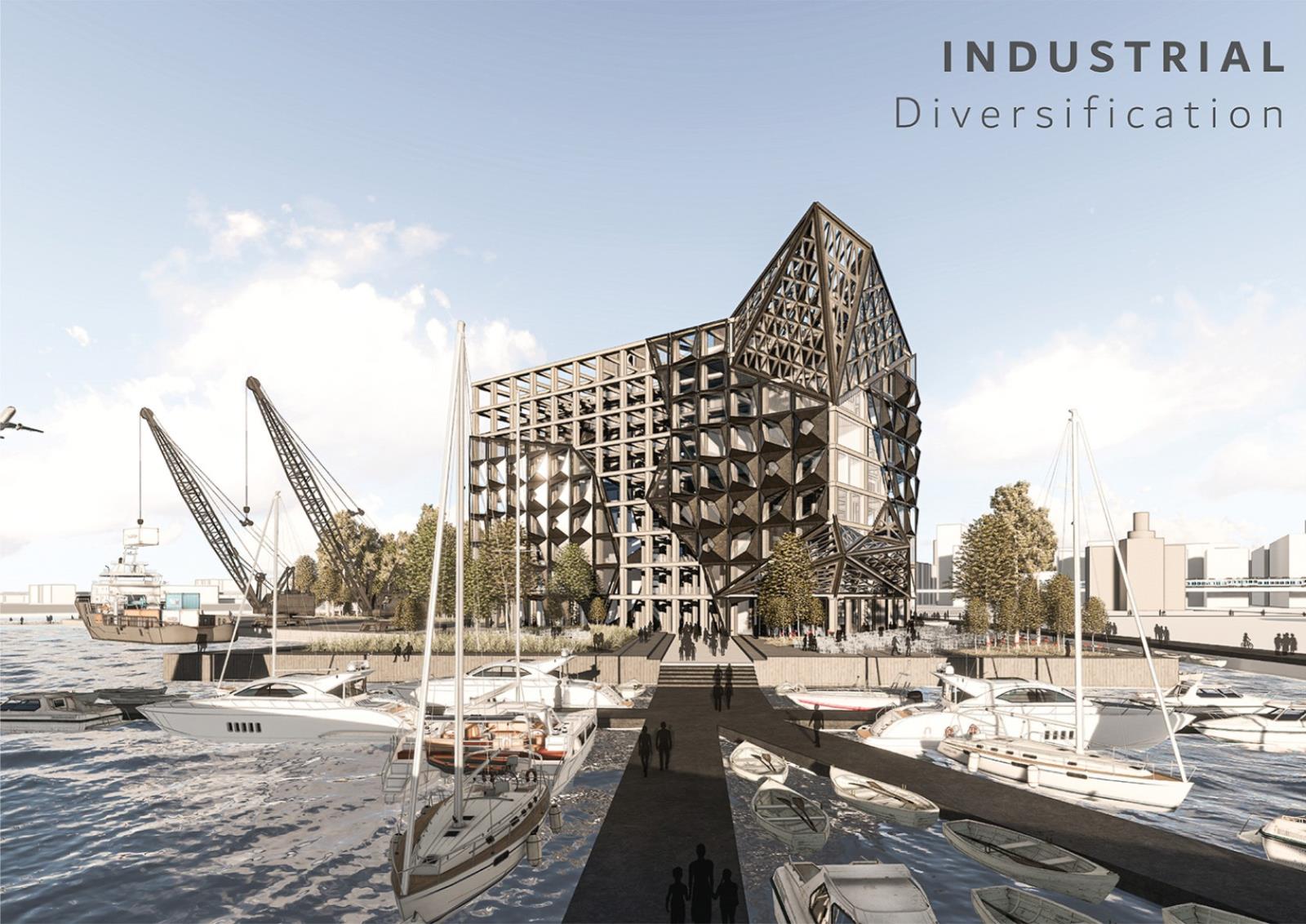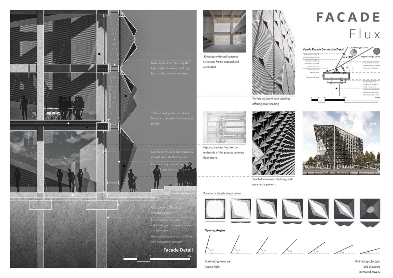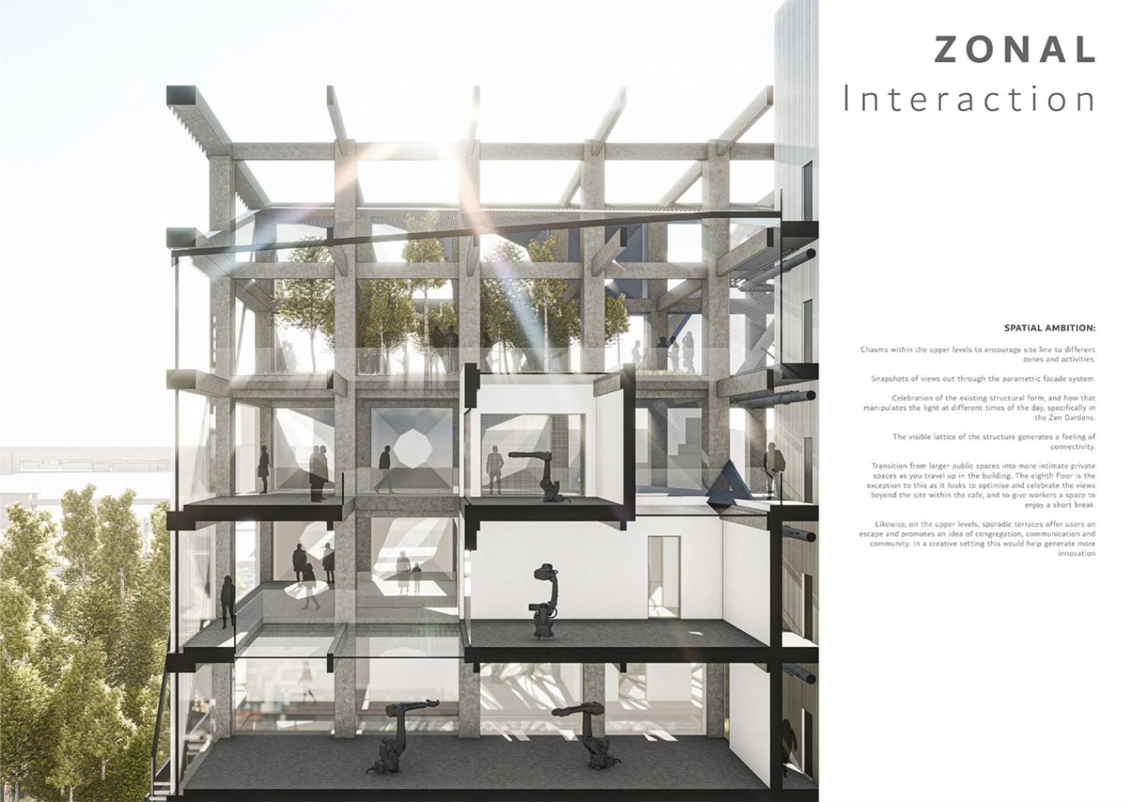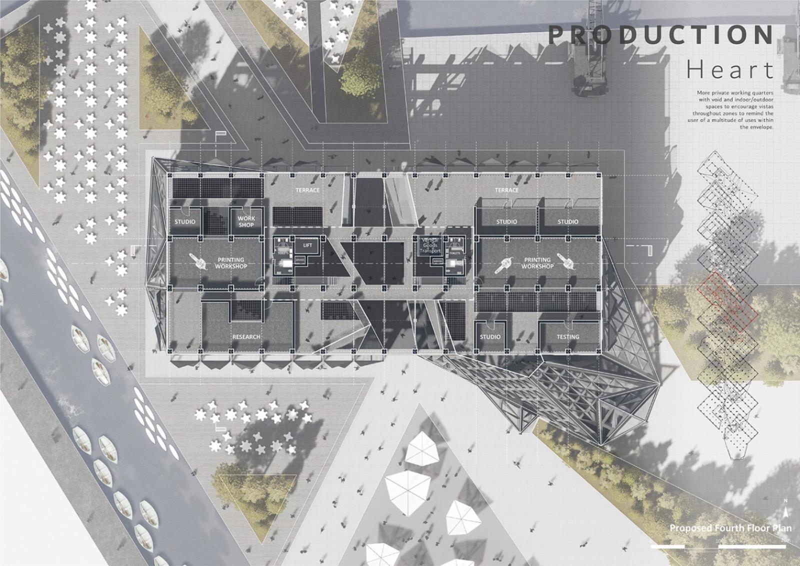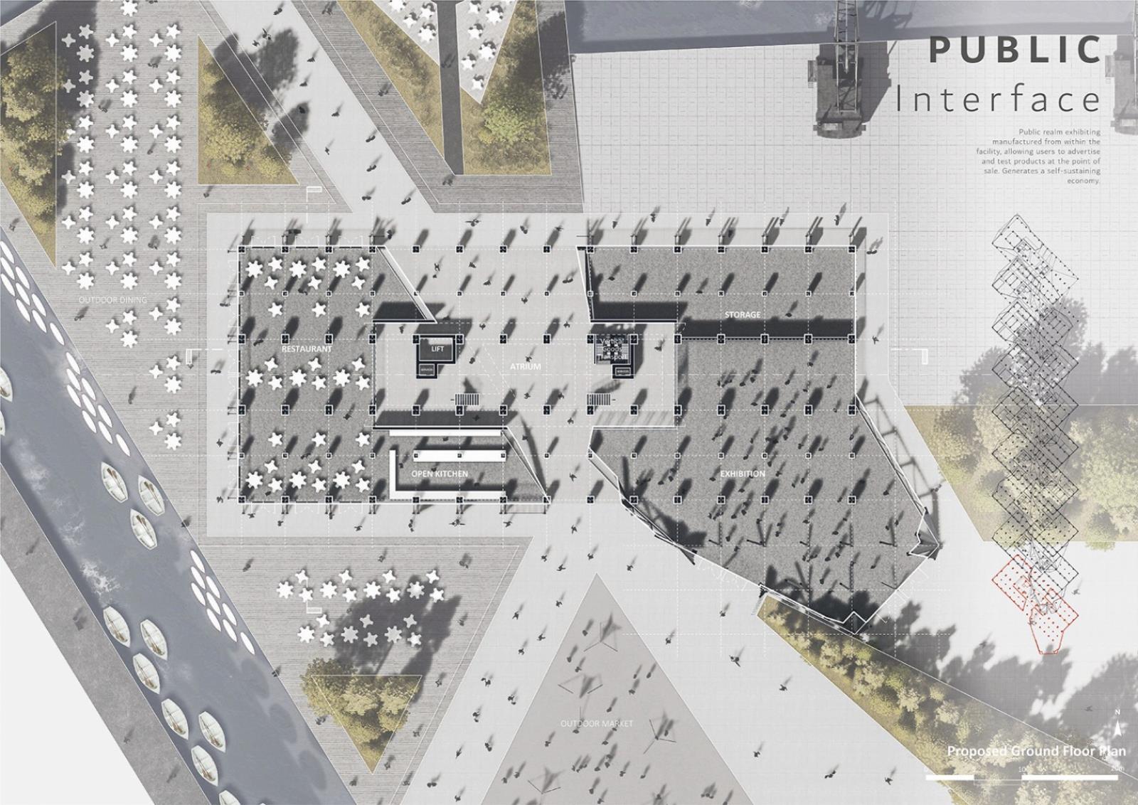 PRINTstream Part 1 Project 2023 Rob Atkins London South Bank University | UK PRINTstream: The founding of a flexible and durable technology hub within the Royal Docks, utilizing the reinforced concrete structural skeleton of the derelict Millenium Mills building, to re-establish the site as a key node within the local and wider context. Motivated by a desire to juxtapose the attitude that ex-industrial areas within proximity to the city should be engulfed by gentrification, losing much of the existing fabric and community.This project adopts a mindset of… what if all future products could originate from one master 3D printer, and my intervention offered a flexible hybrid working environment that offers an affordable and sustainable alternative to traditional avenues of manufacture - facilitating the design, development, manufacture, and sale of products for emerging designers and creative freelancers.Spatially, the scheme focusses on a vertical axis that bisects the building to create the central atrium and celebrated circulation region, with privacy and use evolving as the form transcends. Internal vistas throughout the structure suggest various activities, garnering a hybrid attitude to working life through inquisition. A variety of spatial experiences and thresholds intertwined around the existing structural grid, delineates the various uses of each area, while promoting versatility and freedom of movement. Tutor(s) Daniel Tang Sypridon Kaprinis