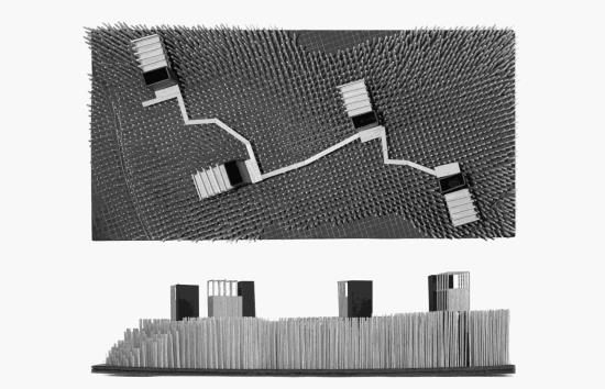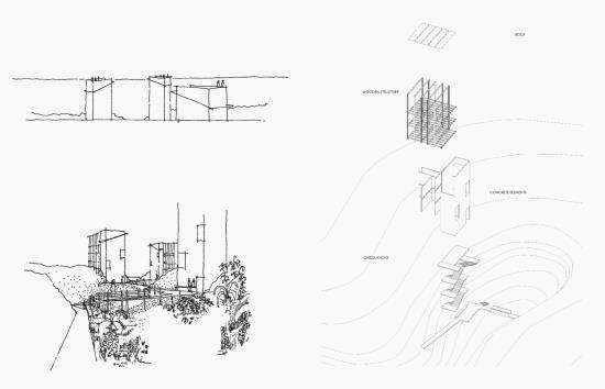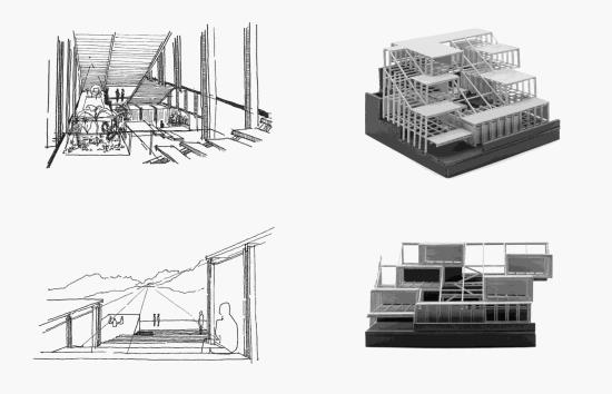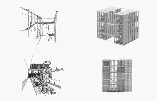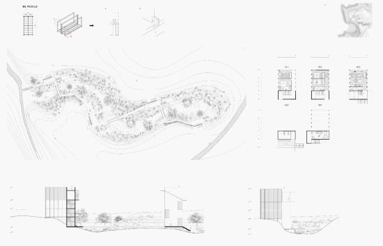 In the other three exercises related to residential complexes on specific grounds, I define after exploring the 320x640cm module with double pillars and laminated wooden beams. I use this to create neutral interiors for the program and valuable exteriors. This achieves a fourth exercise, which is situated in the city, utilizes two towers and bridges to enhance an open space. A fifth project, located in the mountains, creates two spaces to respond to the climate. Finally, a sixth exercise, situated in a ravine close to the sea, generates a public trail with different viewpoints at different heights.