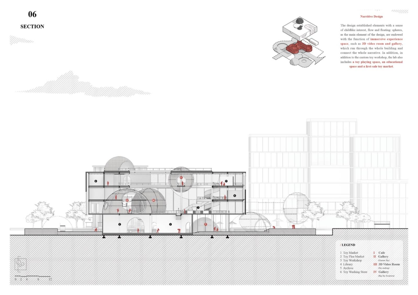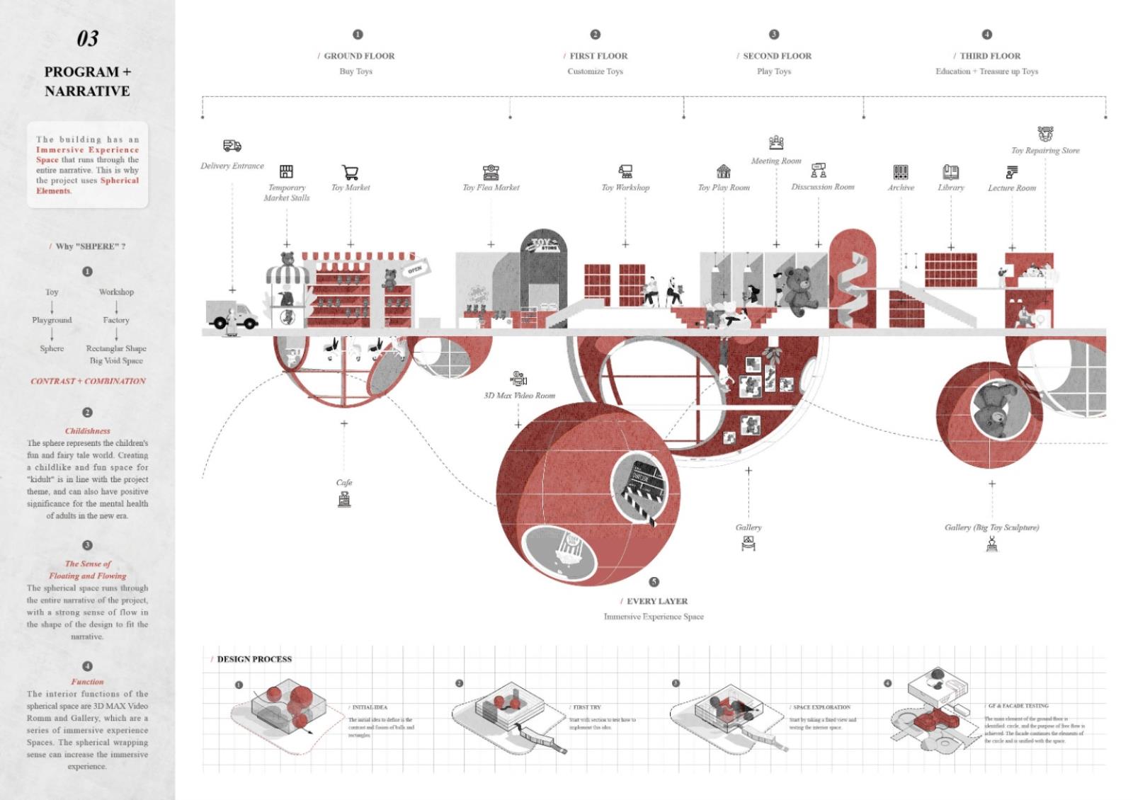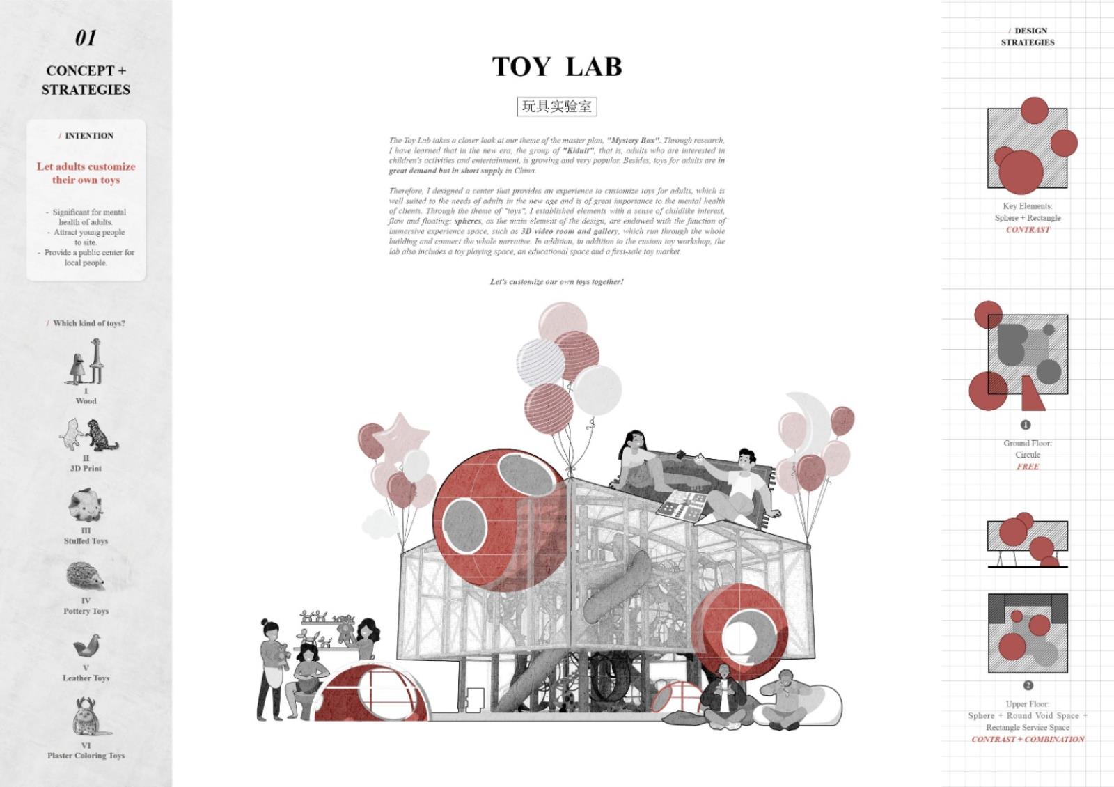 Therefore, I designed a center that provides an experience to customize toys for adults, which is well suited to the needs of adults in the new age and is of great importance to the mental health of clients. Through the theme of "toys", I established elements with a sense of childlike interest, flow and floating: spheres, as the main element of the design, are endowed with the function of immersive experience space, such as 3D video room and gallery, which run through the whole building and connect the whole narrative. In addition to the custom toy workshop, the lab also includes a toy playing space, an educational space and a first-sale toy market.