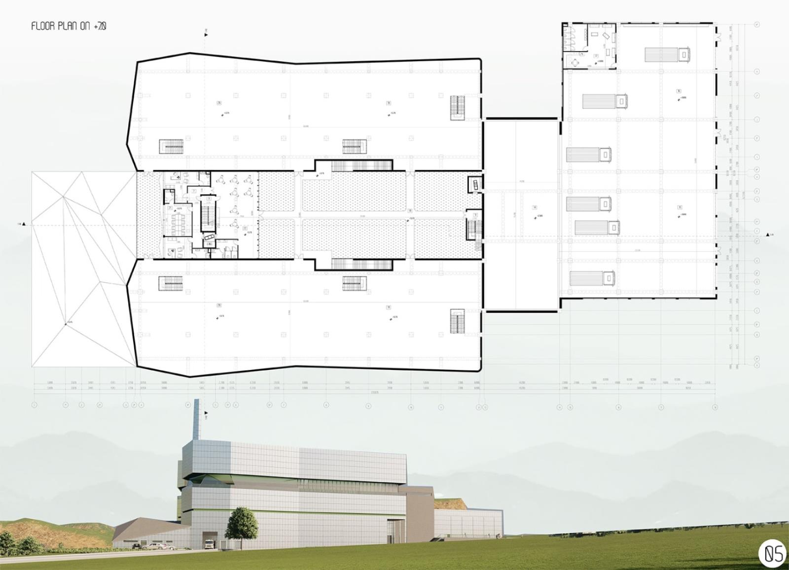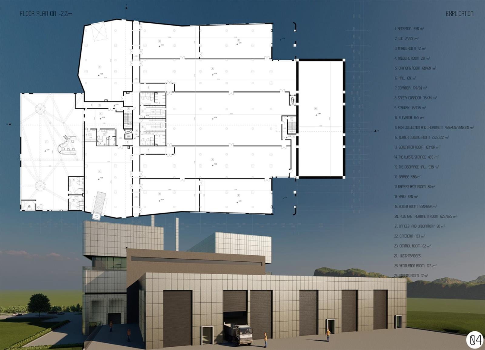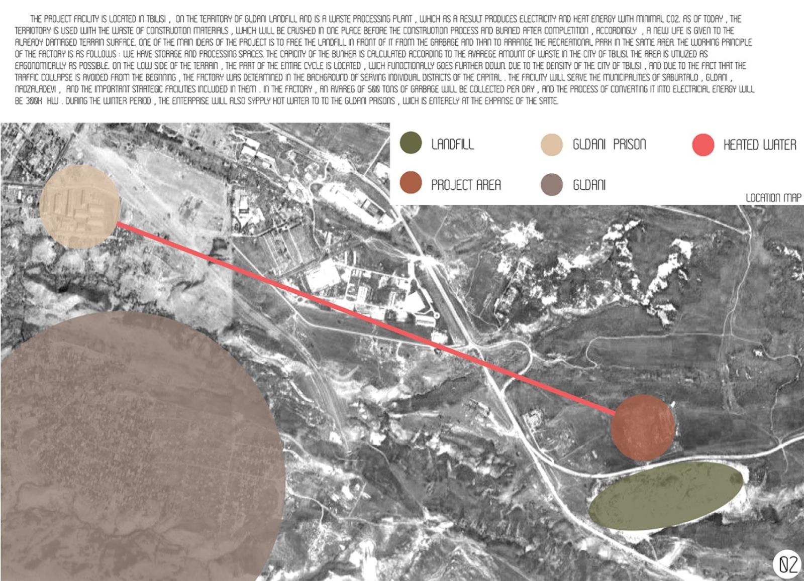 Waste to Energy Plant Part 1 Project 2023 Saba Kharshiladze Caucasus University Tbilisi | Georgia The first steps of designing began with research. The waste processing plant was chosen as the project topic, which was derived from the real problems of the city of Tbilisi, because the waste is not sorted and processed in the city.The project area was selected based on research, how convenient and how appropriate its use was from the point of view of sustainability. It was decided to place the factory on an existing landfill, which allowed us to give new life to the area.The design of the building is dictated by its function, and therefore the factory is monumental. The forms are massive, and there are signs of brutalist architecture. As a result of dividing the work process into two symmetrical parts, it was possible to create a recreational zone in the plant. The factory consists of technical areas necessary for the work process, as well as offices, research room, security room and medical room. It is completely adapted to disabled and can be adjusted in any point possible safely.The factory has the ability and potential to become a multi-genre nightclub after the end of its function, when the city switches to reusing instead of incinerating. Tutor(s) David Danelia