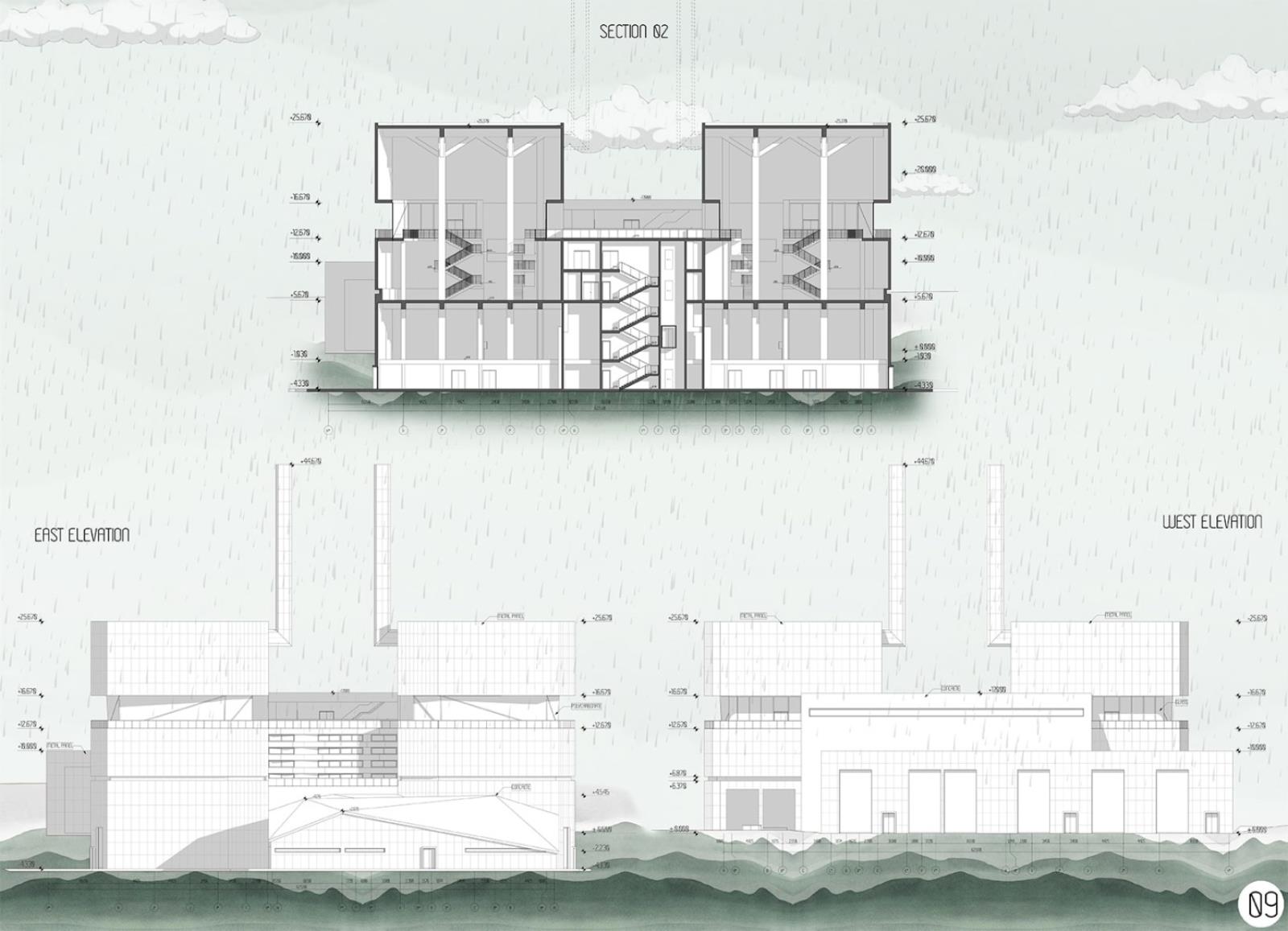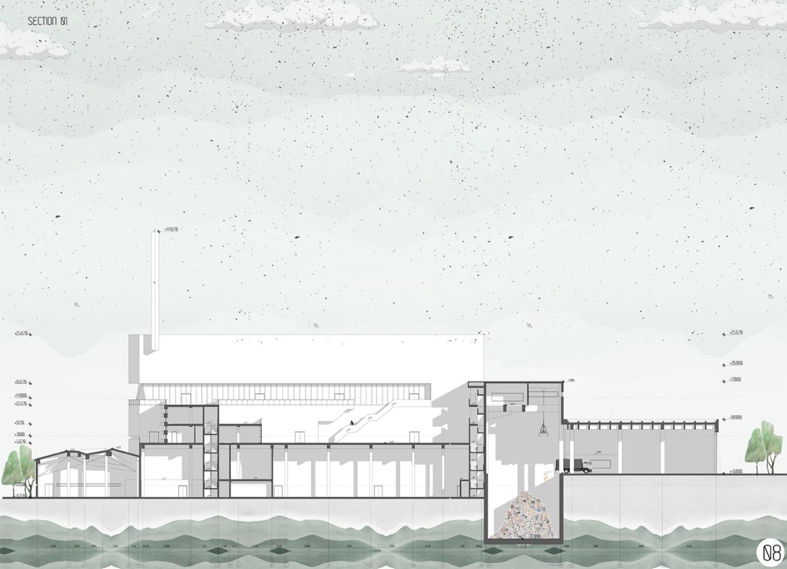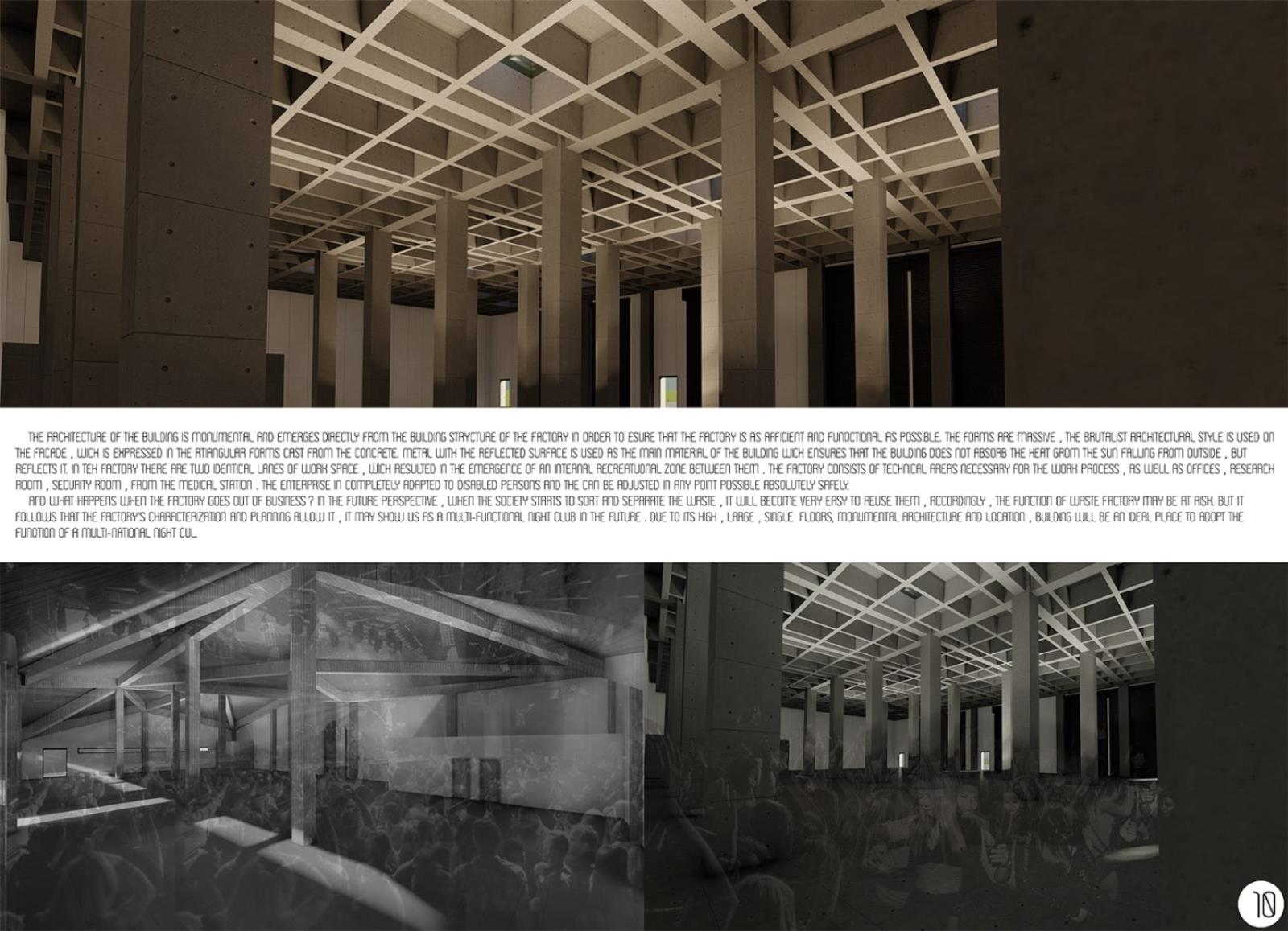 Waste to Energy Plant Part 1 Project 2023 Saba Kharshiladze Caucasus University Tbilisi | Georgia The first steps of designing began with research. The waste processing plant was chosen as the project topic, which was derived from the real problems of the city of Tbilisi, because the waste is not sorted and processed in the city.The project area was selected based on research, how convenient and how appropriate its use was from the point of view of sustainability. It was decided to place the factory on an existing landfill, which allowed us to give new life to the area.The design of the building is dictated by its function, and therefore the factory is monumental. The forms are massive, and there are signs of brutalist architecture. As a result of dividing the work process into two symmetrical parts, it was possible to create a recreational zone in the plant. The factory consists of technical areas necessary for the work process, as well as offices, research room, security room and medical room. It is completely adapted to disabled and can be adjusted in any point possible safely.The factory has the ability and potential to become a multi-genre nightclub after the end of its function, when the city switches to reusing instead of incinerating. Tutor(s) David Danelia