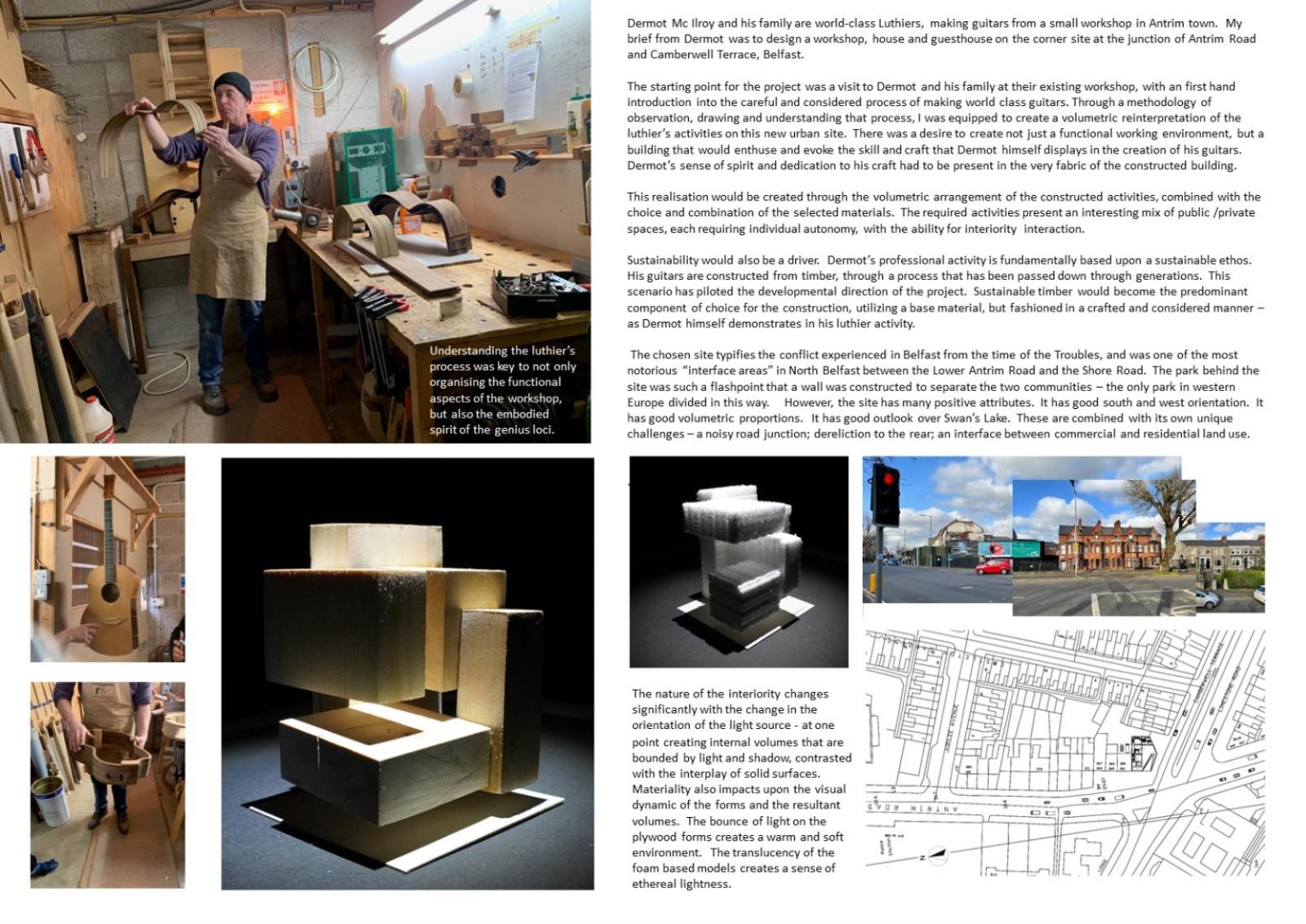 Just as the architects of Roma Interrotta seized an opportunity to revert to Nolli’s Map of Rome and present their remedy for the insensitive post-modern intrusions on that landscape, my intention is to interrupt that period of “The Troubles”, and create a three dimensional and tactile environment on this site which will improve the quality of life of those who use and interact with my building, and to capture the genius loci of what it is to be “Belfast Made”. Having met Dermott and his family; having experienced their dedicated craftmanship; having witness the world class quality of their toil, I was more committed than ever to imagine the possible.