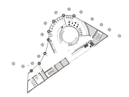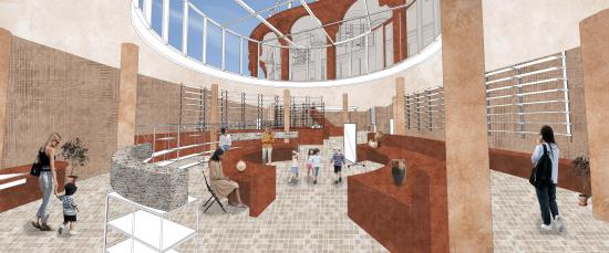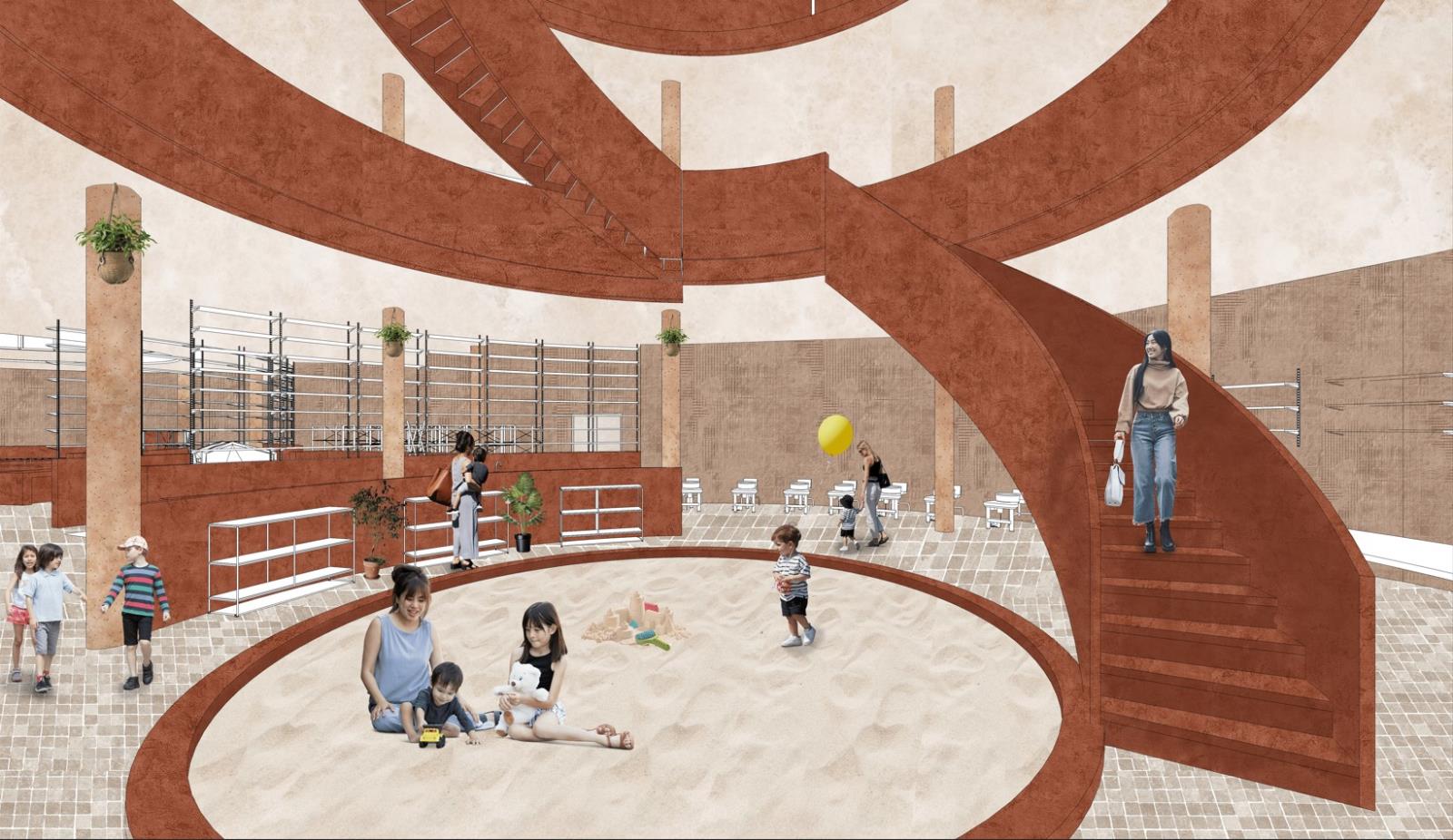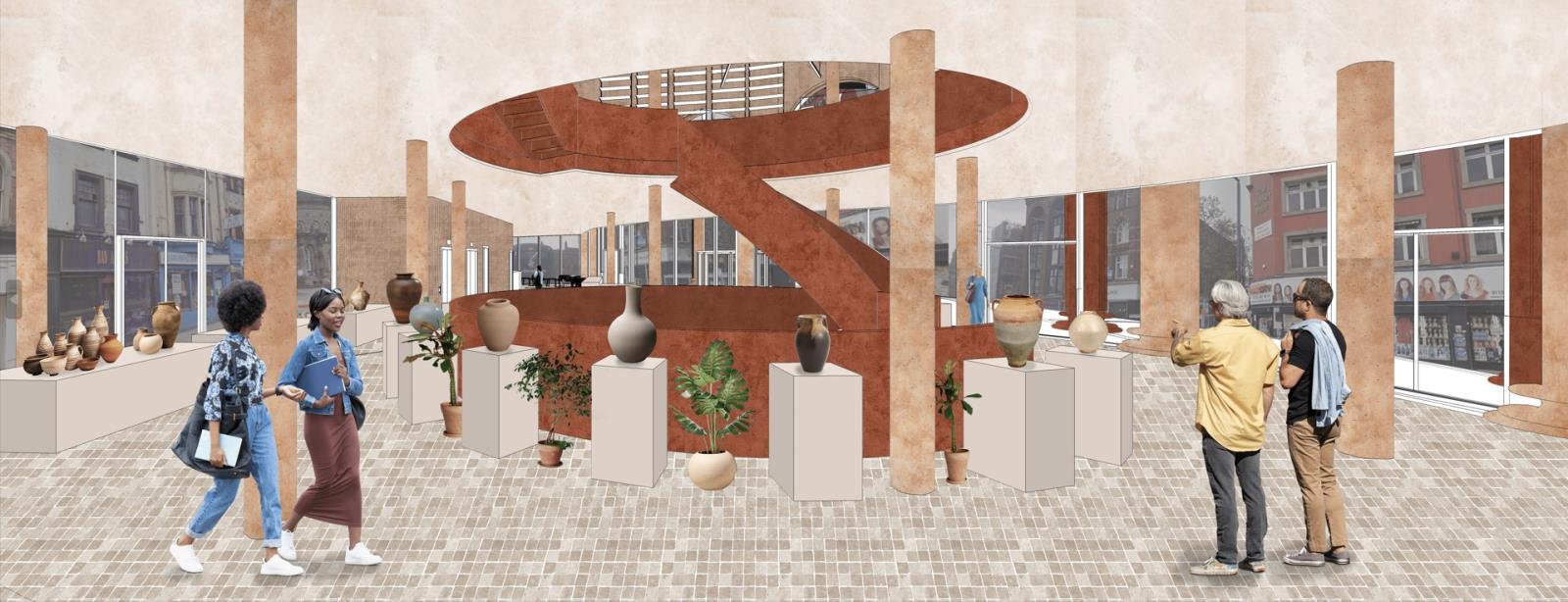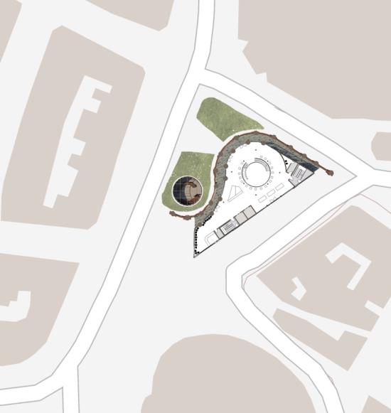 Kirkgate Craft Centre Part 1 Project 2024 Pattanan Tuangsitthombat University of Leeds Leeds | UK The first impression of the building was designed to be the arches wall that developed from the flow line that connects both circles together. As I would like the building to blend in with the surroundings, I designed the column as a sculpted pillar with Victorian architecture as same as the surroundings. Also because of the activity in the building is clay art, I used red terracotta cladding as a facade material to make the design stand out. However, on the inner layer of the arches, I reduced the details of the column and applied fewer details on the column to balance out the whole building, adding on with light-tone sandstone cladding. The Arches wall not only covers one side of the building but also extends out to curve with the below circle, creating a continuation of the design to the landscape. The building's design mimics the first two stories in a traditional style and has a glass house on top to add more greenery to the space, while still not going over the average height of surrounding buildings. Another highlight feature is the curved cylinder roof which is designed to be seen from the ground floor and across the street, as well as the circle on the ground that reveals the activities in the basement level. The building is designed to be four stories, one as a basement to extend the usage area and three above the ground. Tutor(s) Justin Lunn