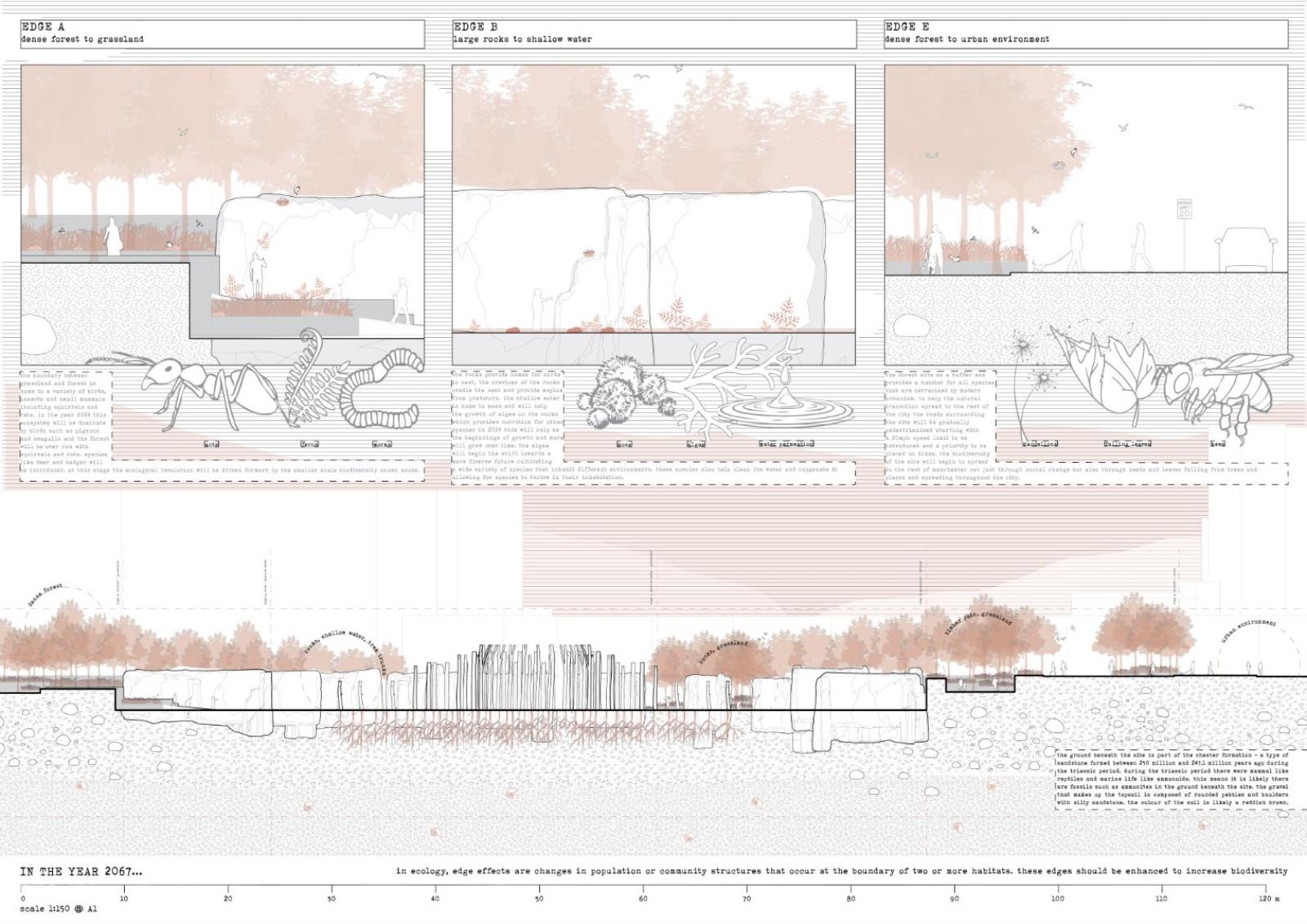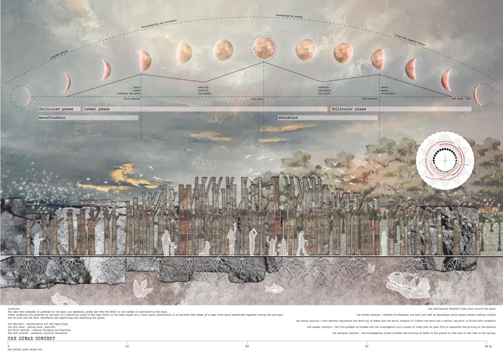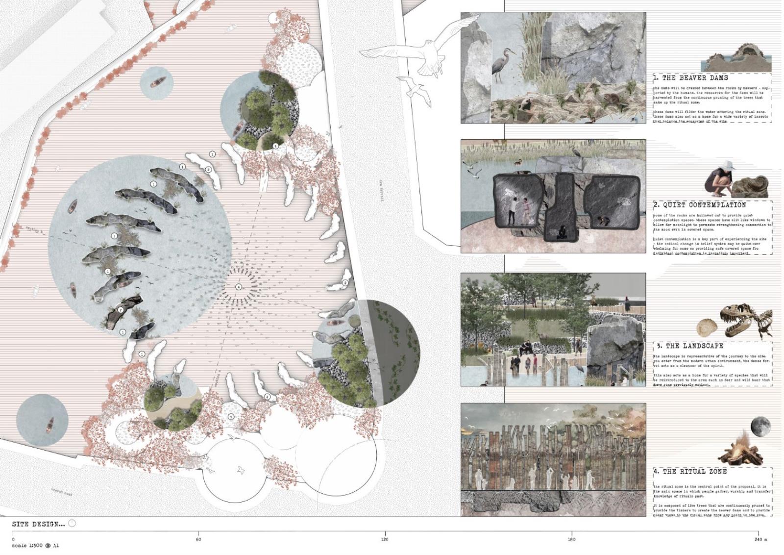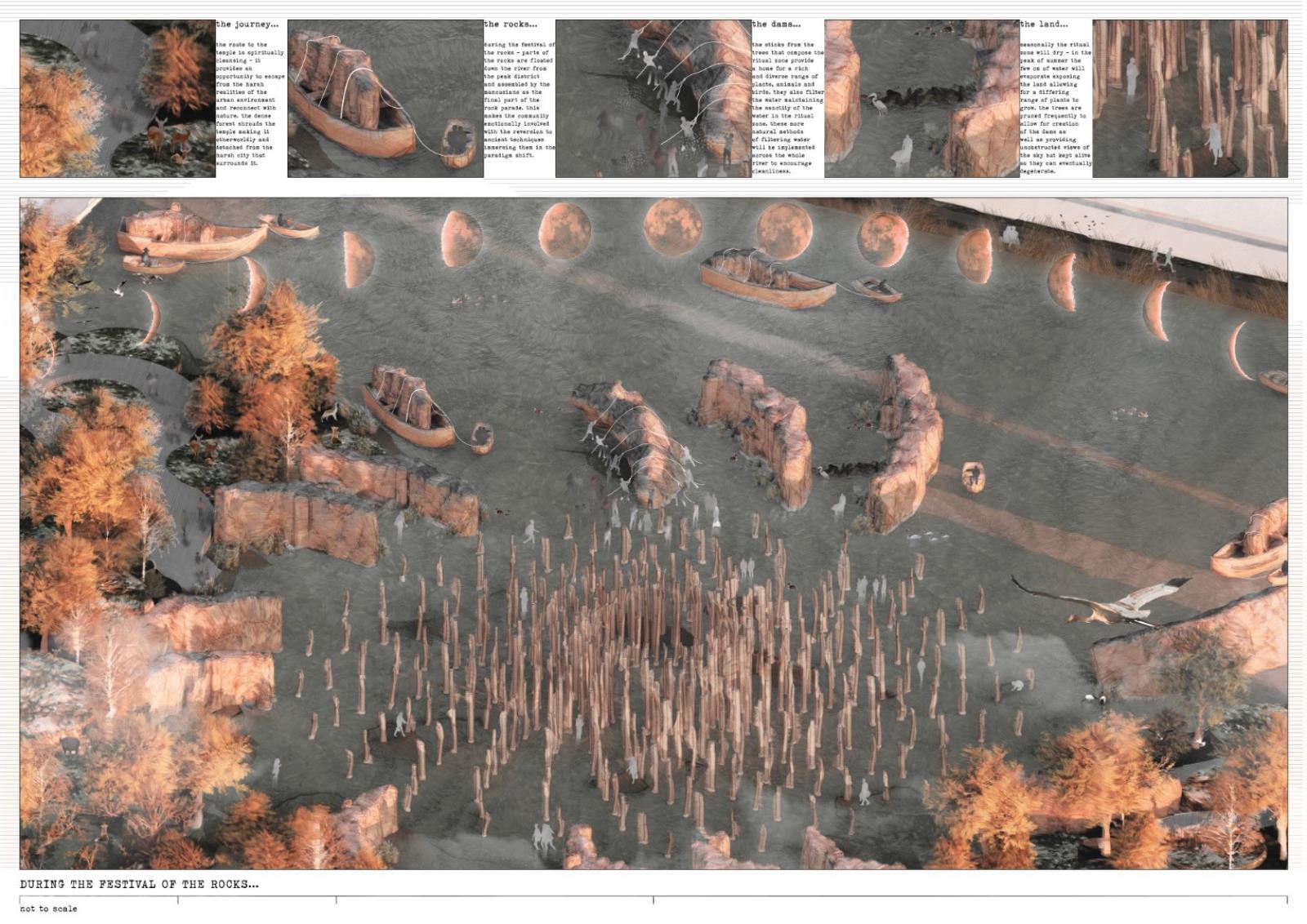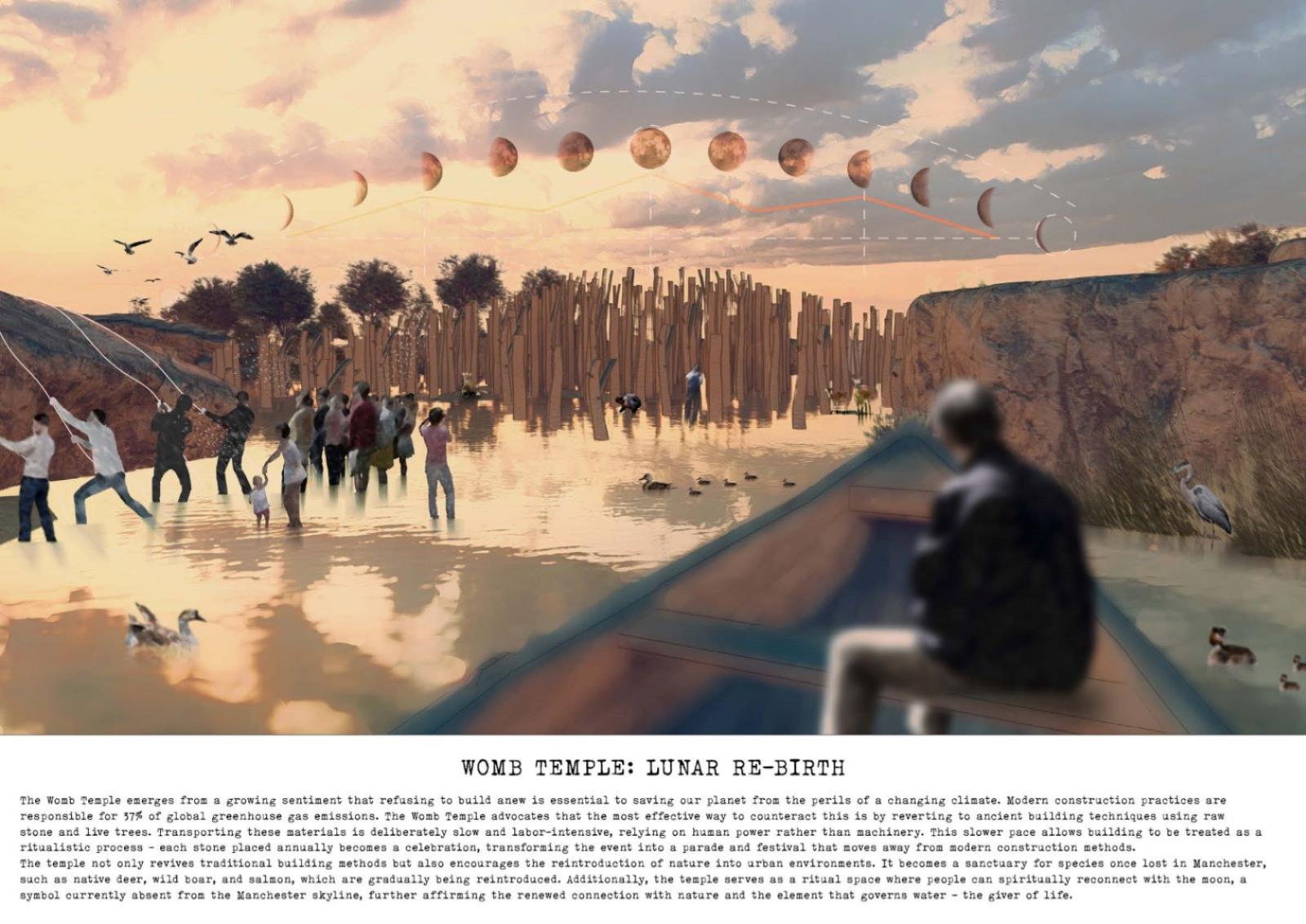 The temple not only revives traditional building methods but also encourages the reintroduction of nature into urban environments. It becomes a sanctuary for animal species lost in Manchester such as native deer, wild boar, and salmon, which are gradually being reintroduced. Additionally, the temple serves as a ritual space where people can spiritually reconnect with the moon, a symbol currently absent from the Manchester skyline, further affirming the renewed connection with nature and the element that governs water, the giver of life.