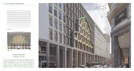 Through a series of provocative interventions to the existing modernist building, the project seeks to revive the memory of the pre-existing churches. Viewing monuments as symbolic markers of collective memory and cultural identity, akin to a city's logo, the project explores a multi-dimensional and intertwined narrative for the city’s modern history in the form of a Museum of Fashion. In this sense, the project explores the concept of the Hybridisation of Memory as a design methodology and through the analogical prism of fashion culture, it attempts to rewrite new histories and identities for the site.