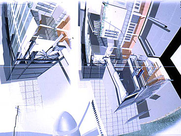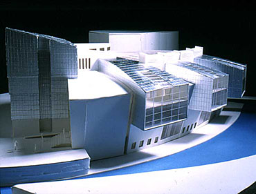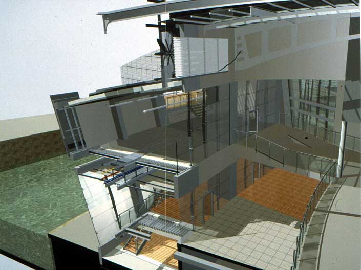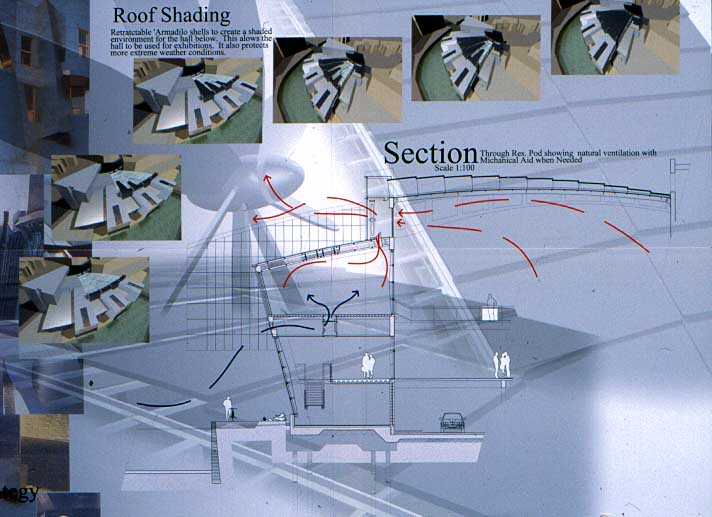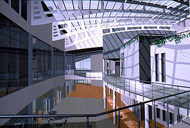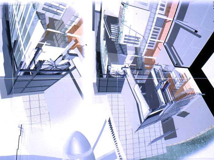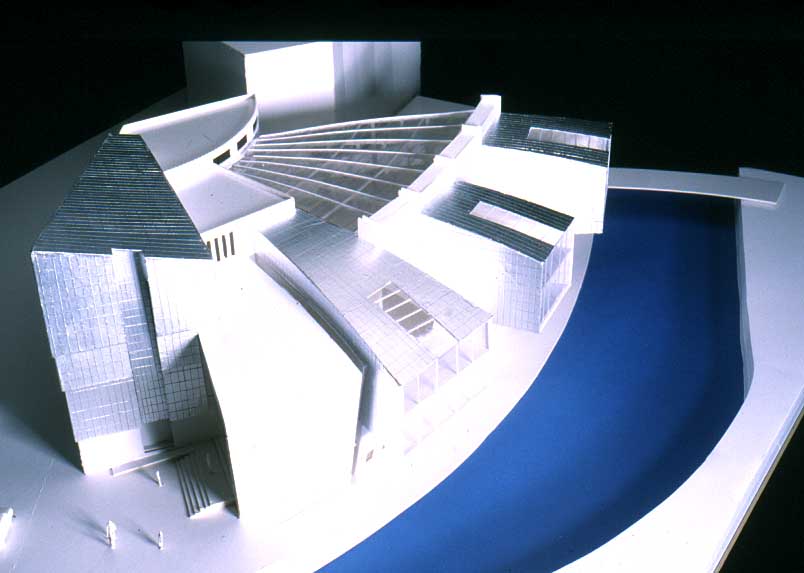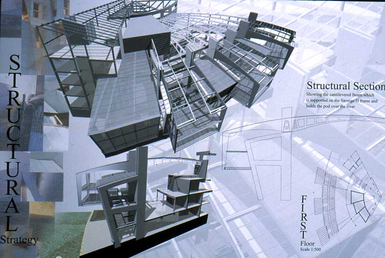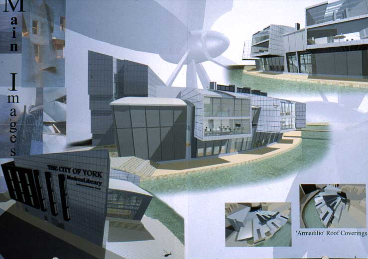 York Modern Library Part 1 Project 2001 James Mills University of Huddersfield | UK What are libraries? Where are they going? How do we identify with libraries?These are the questions I asked when taking on the challenge of libraries. Looking from its beginnings to the end of the 20th century, I felt that libraries had lost their former glory of being a place of learning and discovery, a landmark of the surrounding urban fabric. This is reinforced when visiting libraries built in the 1980's and 1990's by local councils as classic examples of libraries designed for the sole purpose of renting books and studying.In time of economic exploitation and human social exploration, libraries have to offer more to become a centre of learned activities once more. They have to become an attractive place for all ages. To offer the right environment, the freedom of social interaction in a place to discover not only the latest ideas and fashion, but also a place where you have access to the world and beyond; to research the past and discover your identity; and to be comfortable in your environment whilst learning.The York ModernLibrary is about enjoying your environment, giving a sense of excitement and discovery as you enter each new space. A feeling of belonging to a particular environment; knowing you have arrived at your destination, which encourages you to continue your chosen activity; being transparent when you need to be part of the outside environment, and being opaque when you are alone with your ever-ticking mind, discovering and building your knowledge.A library holding its past while reaching forward to its new era. This scheme for a modern library in York demonstrates an enthusiasm for new information technology. The student has conscienciously researched the future of the library with its increased use of electronic information, and has enjoyed presenting his design ideas through good spatial imagery using CAD.This is an exciting design for a resource library for an under exploited waterfront location in York. The dramatic scale emphasises the curve in the River Foss and establishes a thoroughly modern concept for a city regeneration scheme. The design explores successfully an appropriate relationship between smaller more private spaces and the grand scale of an internal street which itself links building function with the town.The student has developed his project through a good range of hand made models as well as extending the scope of Computer Aided Architectural Design. As a third year student he has indicated a sense of the importance of form and massing.