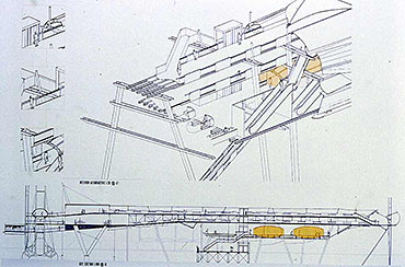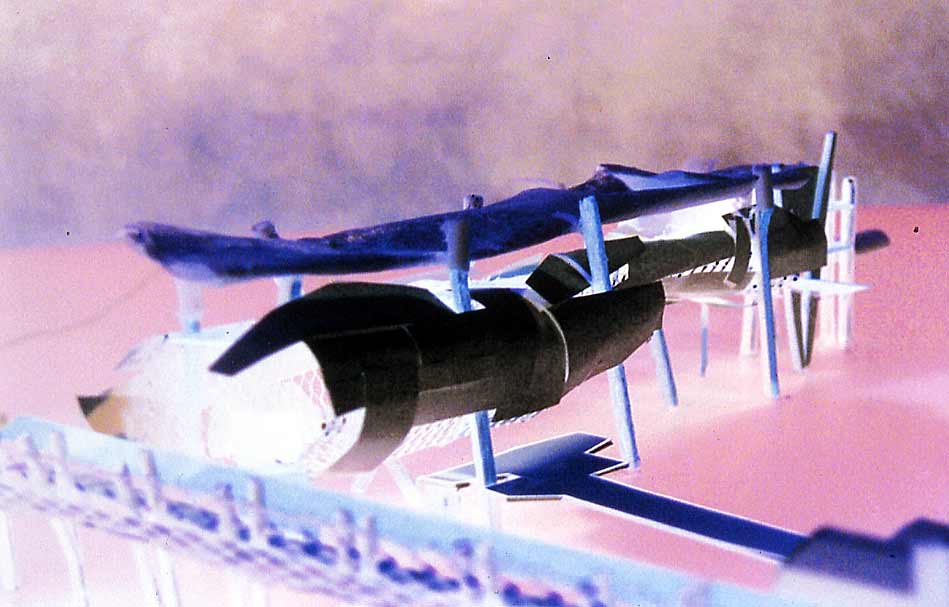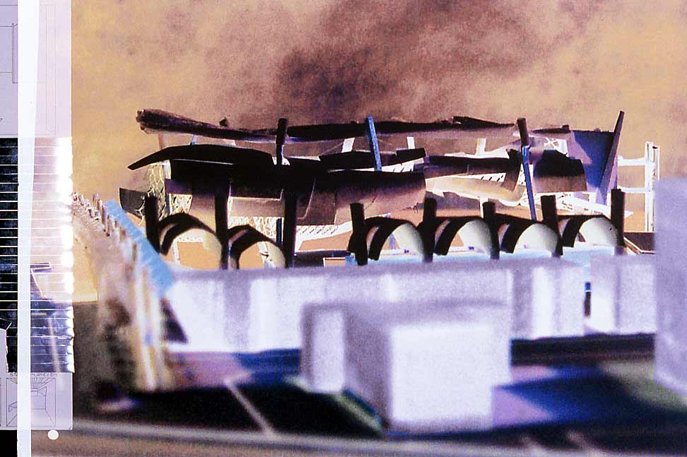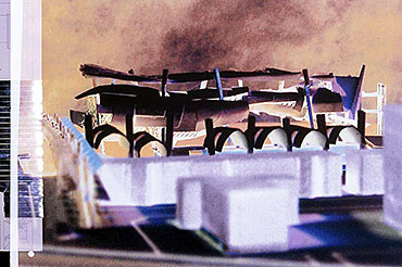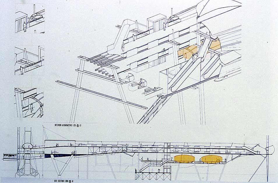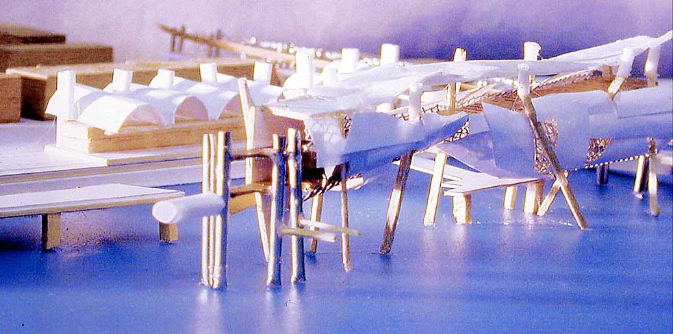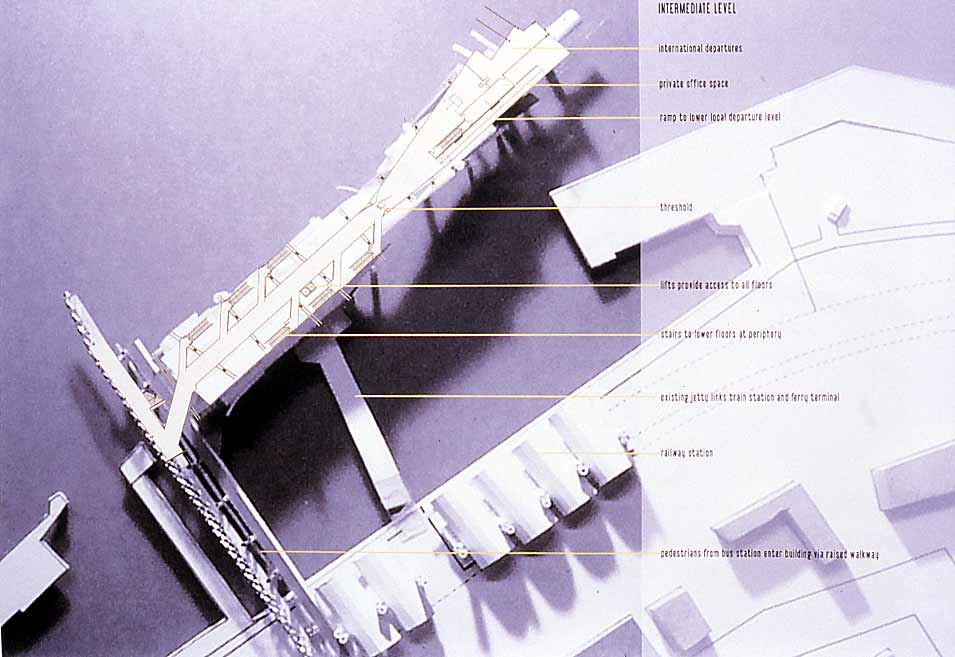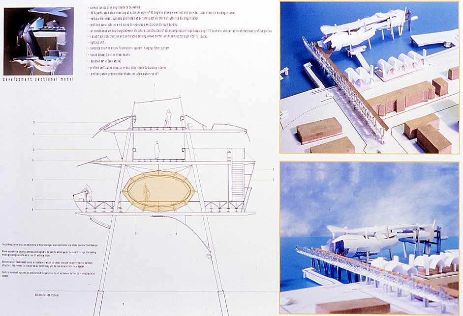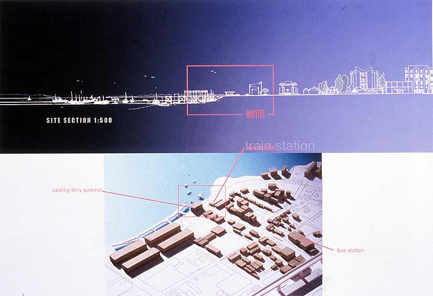 Ferry Terminal, Port Klang, Malaysia Part 1 Project 2002 Stuart Caunt University of Huddersfield | UK "If there is anything that Architecture can ‘give to the people’ it is no more (but also no less) than choices that go beyond pre-coded style, finished products, and regurgitated norms." Lebbeus WoodsAt the coastal edge, the proposed ferry terminal at Port Klang basks in the Malaysian climate. The building is understood as a dynamical system with distinctive properties that are characterised by the degenerated, chaotic nature of the site.In its simplest form the building exists as separate social and functional spaces, meeting at an important threshold, buoyant in space, which marks ‘the start’ of the traveller’s journey.The buildings external aesthetic relates to its skin as a fragmented scab. The scab shows an authentic relation to time, recognising the chaos and disorder without ignoring or erasing it. It conceals and heals the chaos to reveal spaces of life and ordered activity. Internally; light, space and materiality are used to create an uncomplicated, uplifting architectural language, which offers simple choices to peel off the grand processional sequence at regular intervals so that the traveller may use the building’s facilities suspended within the lungs of the building below. Stuart’s project of a ferry terminal in Port Klang, Malaysia, responds and explores a landscape of changing relationships between land and water, threshold and transition, and a datum line along which a series of poetically expressed accretions are delicately and tentatively poised. The project has been developed and explored through countless sketches, maquettes and models, of which the resultant ‘between space’ of ferry terminal as journey is sensitive, inhabited, and informed design, whilst challenging its paradigm.